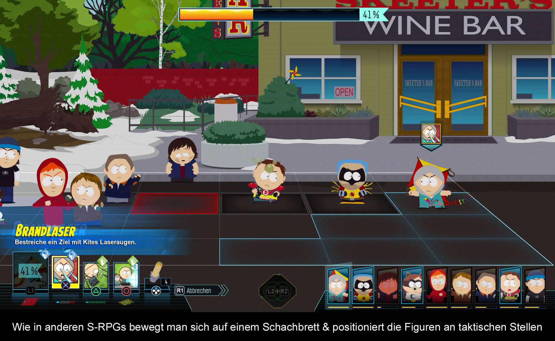 Die Handlung hinkt um einiges Teil 1 hinterher, dafür hat man mehr Zeit in das Kampfsystem gesteckt. Gezählt sind die Tage des klassischen Runde um Runde Angriffs, South Park präsentiert sich nun als Strategie RPG! Gut, nicht vergleichbar mit Größen wie Disgaea oder Valkyria Chronicles, aber man will sich ja auch nicht mit diesen messen. Gegner laufen nach wie vor in der Spielewelt umher. Trifft man auf einen, wird ein Kampf eingeleitet und man findet sich auf einer Art Schachfeld. Auf einer Seite Coon & Friends und auf der anderen der Gegner. Jeder der Helden hat einen bestimmten Aktionsradius in dem er sich in der Angriffsphase bewegen kann. So versucht man sich geschickt in Stellung zu bringen, um Nah- oder Fernangriffe auszuführen. Wie auch der Held sind die Angriffe auf bestimmte Reichweiten limitiert. Nahangriffe funktionieren meist nur 2-3 Felder weit, wobei bestimmte Fernangriffe auf ein beliebiges Feld zielen können. Man sollte sich gut überlegen, wo man seinen Helden platziert. Steht er ungünstig, blockiert er im nächsten Zug andere Helden. Großartige Taktische Überlegungen muss man zwar nicht treffen, aber wer will kann es. Immer wieder findet man Hindernisse auf dem Schlachtfeld, die man zu seinem Vorteil nutzen kann, oder man positioniert seine Figuren so um einen Folgeschaden zu erhalten. Diese Taktiken werden aber nur im höchsten Schwierigkeitsgrad benötigt. Beim normalen Schwierigkeitsgrad reicht es aus, dass man nur für Bosskämpfe genaue Kenntnisse über Angriffe und deren Reichweite sowie Effekte hat. In normalen Kämpfen lohnt es sich mit den Charakteren und ihren verschiedenen Klassen zu experimentieren. Für seine eigene Figur kann man anfangs zwischen Blaster, Brutalist oder Speedstar wählen. Jeder mit seinen Schwächen und Stärken. Je weiter man im Spiel voran schreitet, desto mehr Möglichkeiten bekommt man seinen Avatar anzupassen. Keine Panik vor der Angst versehentlich die falsche Klasse zu wählen. Später im Spiel erledigt sich das Problem von alleine. Ein besonderes Highlight der Kämpfe sind die Spezialattacken. Hat man genügend Schläge ausgeteilt bzw. eingesteckt, kann jeder Charakter einen epischen Angriff starten. Abgerundet wird das Gameplay mit „Beschwörungen“ und kleinen QTE. Am Ende des Kampfes gibt es Erfahrungspunkte, wobei in diesem Spiel nicht das Kämpfen im Vordergrund steht, sondern das erledigen von Aufgaben. Wer bestimmte Bonusziele erfüllt bekommt mehr Erfahrungspunkte und man kann so leicht ohne viele Kämpfe höhere Stufen erreichen. Jedes Level bringt zudem Platz für ein wichtiges Artefakt. Wer eines Ausrüstet bekommt spezielle Boni auf Angriffe. Später darf man noch seine „DNS“ manipulieren um mehr Bonus Punkte für seine Klasse zu bekommen. Im Gegensatz zum Vorgänger haben Kostüme keine besonderen Attribute oder Eigenschaften. Ihr könnt ganz nach Herzenslust den/die Neue/n einkleiden.