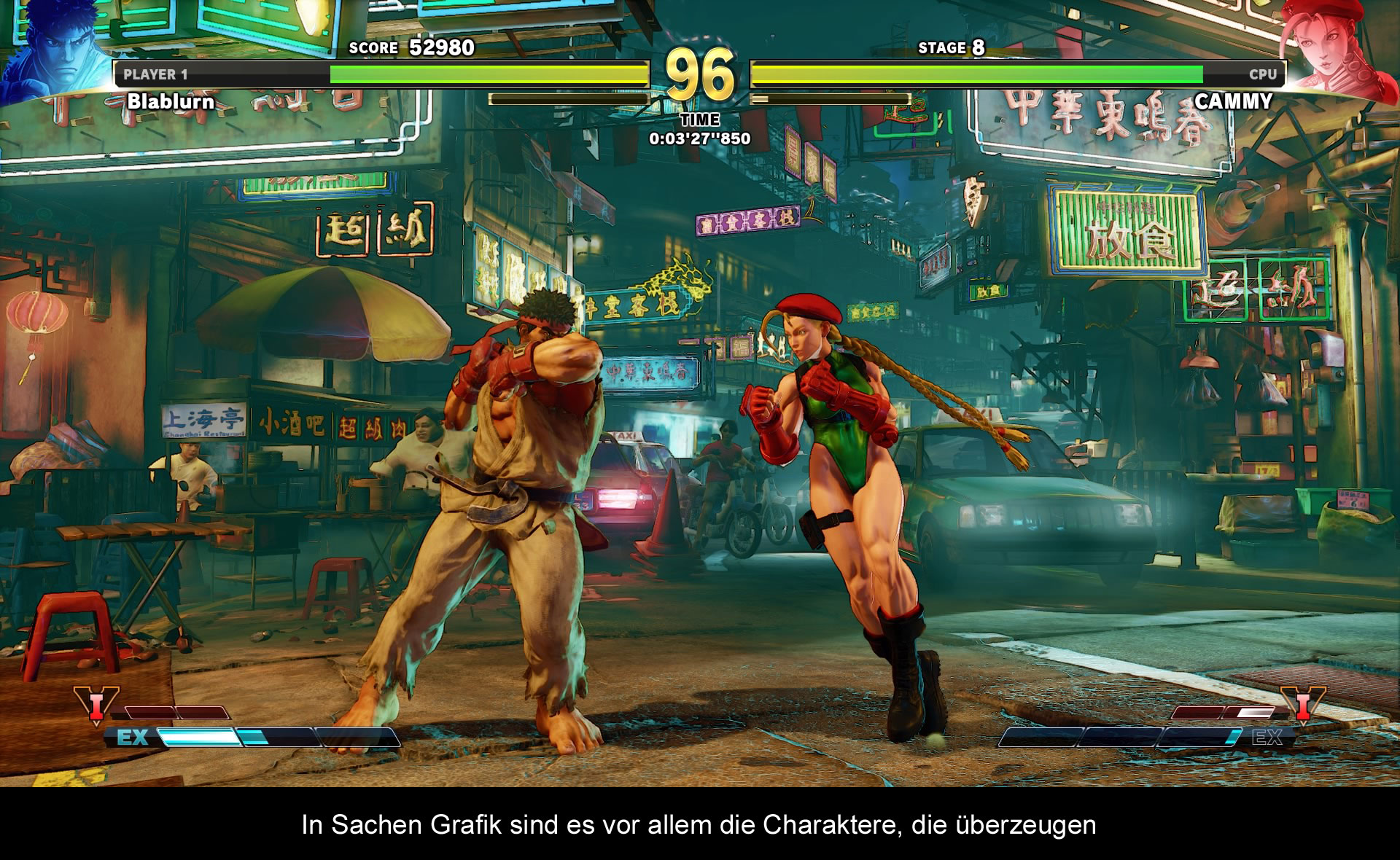 Rein grafisch hat sich seit dem Original-Release von Street Fighter V nicht viel verändert. Aber das ist auch nicht weiter schlimm. Die Arcade Edition sieht nach wie vor beeindruckend aus. Das Gameplay ist flüssig und absolut präzise. Hinzu kommen viele unterschiedliche Charaktere, die allesamt mit Liebe zum Detail entworfen wurden. Wie es schon mein Kollege crack-king in seinem Review vor zwei Jahren beschrieb: „Seien es die Haare oder irgendwelche Mäntel oder andere Dinge. Alles bewegt sich relativ realistisch durch die Luft und nur ganz selten gibt es Clipping-Fehler.“ Und an dieser Sache hat sich wirklich nichts geändert. Lediglich die Hintergrund-Locations lassen hier und da ihr Alter erkennen. Und auch die Ladezeiten könnten für meinen Geschmack etwas kürzer sein. Ein großes Lob verdient auch die überarbeitete UI, die inzwischen deutlich moderner wirkt als noch bei der Version 1.0. Und auch der Sound, der sowohl die Synchronstimmen der einzelnen Kämpfer umfasst als auch die hervorragende Hintergrundmusik, ist über alle Zweifel erhaben.