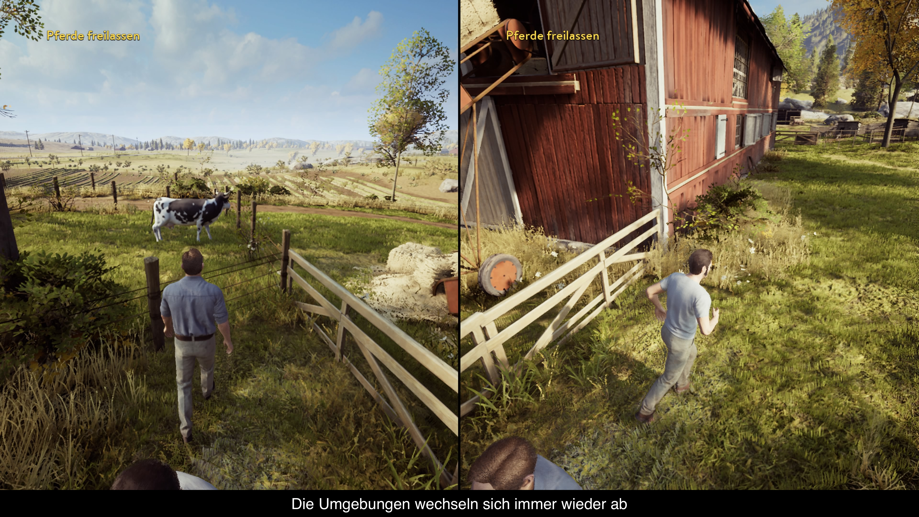Wie bereits erwähnt, handelt es sich bei A Way Out um ein Koop-Spiel. Dabei kann man das Spiel entweder lokal oder online mit einem Freund spielen und immer wird das Spiel im Splitscreen dargestellt - Vincent links, Leo rechts. Beide Charaktere sind aus der 3rd-Person Perspektive spielbar und nun geht es darum sich pro Kapitel einer bestimmten Aufgabe zu widmen. Um beispielsweise den Ausbruch durchzuführen, muss man bestimmte Gegenstände besorgen und einige Vorbereitungen treffen. Dabei werden Objekte angezeigt, mit denen man interagieren kann und so gibt es recht wenig Spielraum für Misserfolge. Selbst einige Schleich- und Kampfeinlagen sind ziemlich einfach und mit einigen Quick-Time-Events durchsäht. Obwohl das Spiel also recht einfach und linear ist, entsteht durch den Koop-Aspekt eine völlig eigene Atmosphäre und Spielgeschwindigkeit, da nahezu alles die Zusammenarbeit beider Spieler voraussetzt. Zum Beispiel muss einer die Wache ablenken, während der andere die Schlüssel klaut oder man hilft sich gegenseitig dabei hochzuklettern. Unterstützt wird dies durch ziemlich schlau eingesetzte Quick-Time-Events, die manchmal gemeinsames Timing und Absprache benötigen.