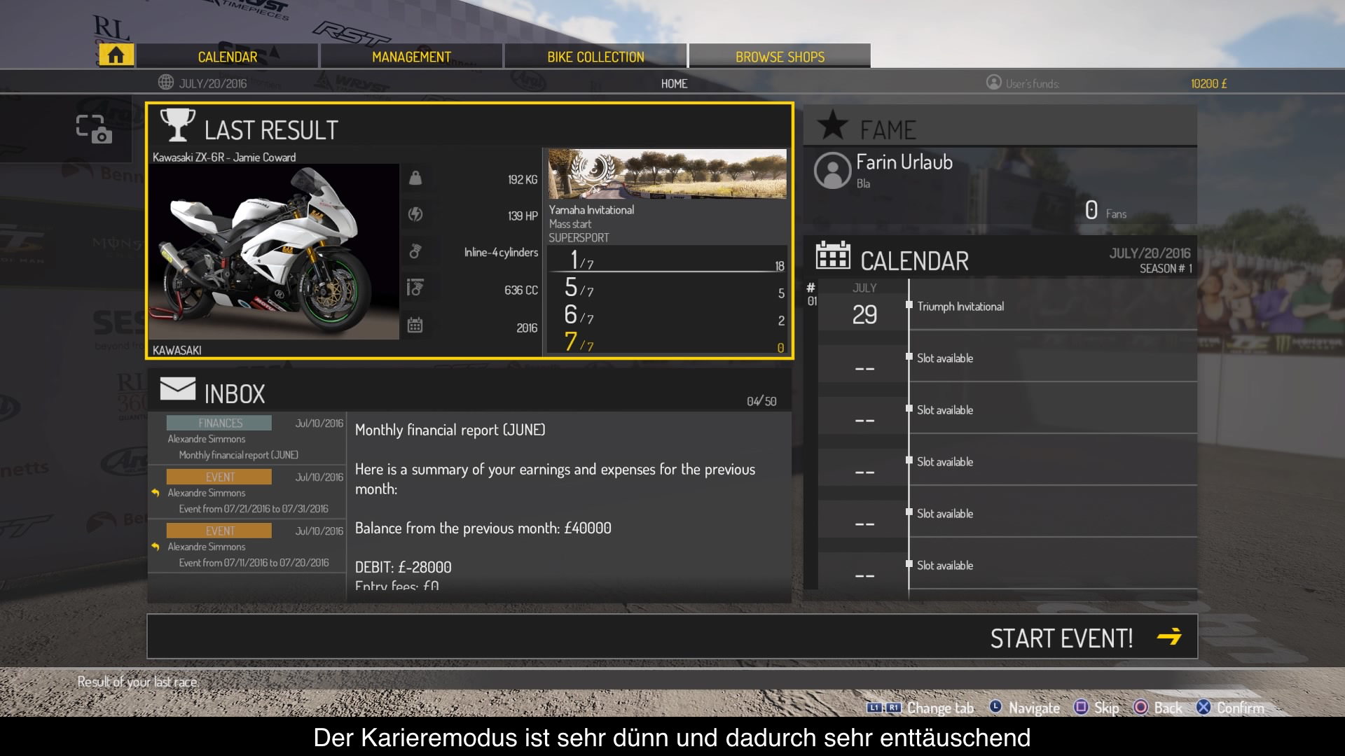 In Sachen Modi, hat mich das Spiel von Beginn an gleich etwas enttäuscht. Neben einem Einzelrennen-Modus gibt es auch noch einen Time Attack-Modus, einen Online-Modus (zum Zeitpunkt der Review ist es mir nicht gelungen, ein Spiel zu finden) und einen Karriere-Modus, der jedoch relativ dünn ist. So sucht man innerhalb seiner schlicht gestalteten Zentrale die Rennen aus, an denen mal teilnehmen möchte, ehe man diese dann befährt. Im Anschluss kann man nicht nur mehr Fans gewinnen, sondern auch Preisgeld für das man dann neue und schnellere Bikes kaufen kann. Standardkost halt! Sonder-Herausforderungen oder gar eine Story sucht man vergeblich. Und auch die Auswahl der Bikes, die man erwerben kann, ist recht überschaubar. Schade! Vor allem angesichts der eher lauen Aktivität im Online-Modus, ist es bedauerlich, dass das Spiel hier nicht mehr zu bieten hat. So dauert es nicht lange, bis man echt das gesamte Paket durchgenommen hat.