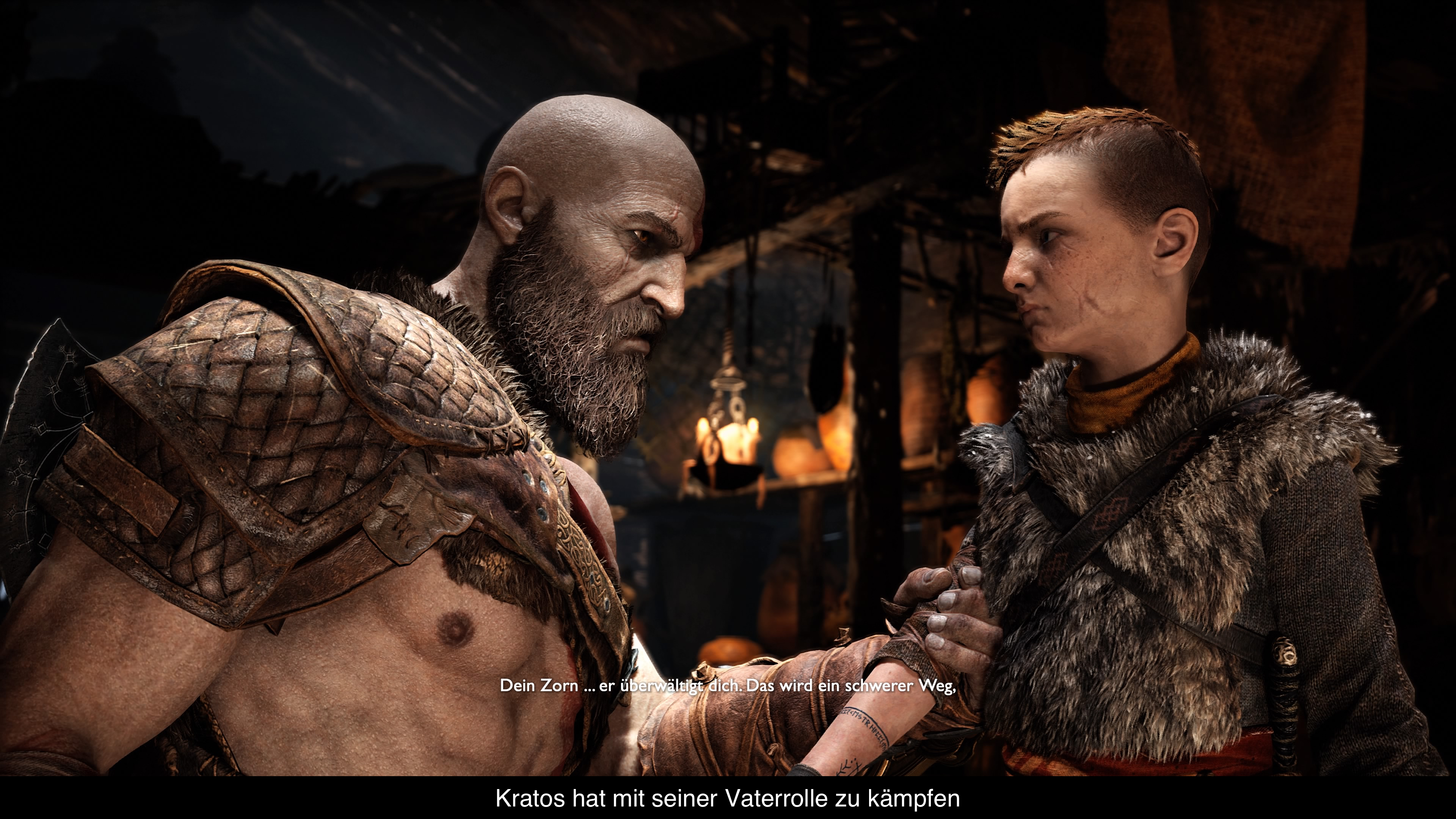 Nachdem Kratos in Griechenland die Götter ausgelöscht hat und ein kleineres Chaos hinterlassen hat, wurde es ihm wohl dort zu langweilig. So zog er weiter, um den Schmerz der Vergangenheit und den Geist von Sparta hinter sich zu lassen und fand im kalten Norden sein Glück. Denn er kam nicht nur zur Ruhe, sondern fand dort auch eine neue Liebe. Aus dieser Liebe entstand mit Atreus sogar ein Sohn und nun steigt das Spiel einige Jahre nach dessen Geburt mit einem traurigen Ereignis ein. Denn Kratos Frau und Atreus Mutter ist tot und ihr letzter Wunsch war, dass sie ihre Asche auf dem höchsten Ort verteilen. Also machen sich beide auf den Weg, um zum Gipfel des Berges in der Nähe zu gelangen. Im Spiel ist aber der Weg das Ziel, denn Kratos und Atreus haben zu Beginn recht wenig gemeinsam. Kratos muss noch in die Vaterrolle hineinwachsen und Atreus hat mit dessen aufbrausenden Art natürlich zu kämpfen. Aus dieser Dynamik entstehen aber zahlreiche unvergessliche Szenen, die mal traurig, mal lustig sind und der Figur von Kratos eine bis dahin ungesehene Tiefe geben. Die Charakterentwicklungen sind nachvollziehbar und zum Teil nicht ganz vorhersehbar. Und wenn ein Grieche plötzlich im Norden auftaucht, der für die Auslöschung der griechischen Götter verantwortlich ist, bleibt das bei den nordischen Göttern natürlich nicht unbemerkt.