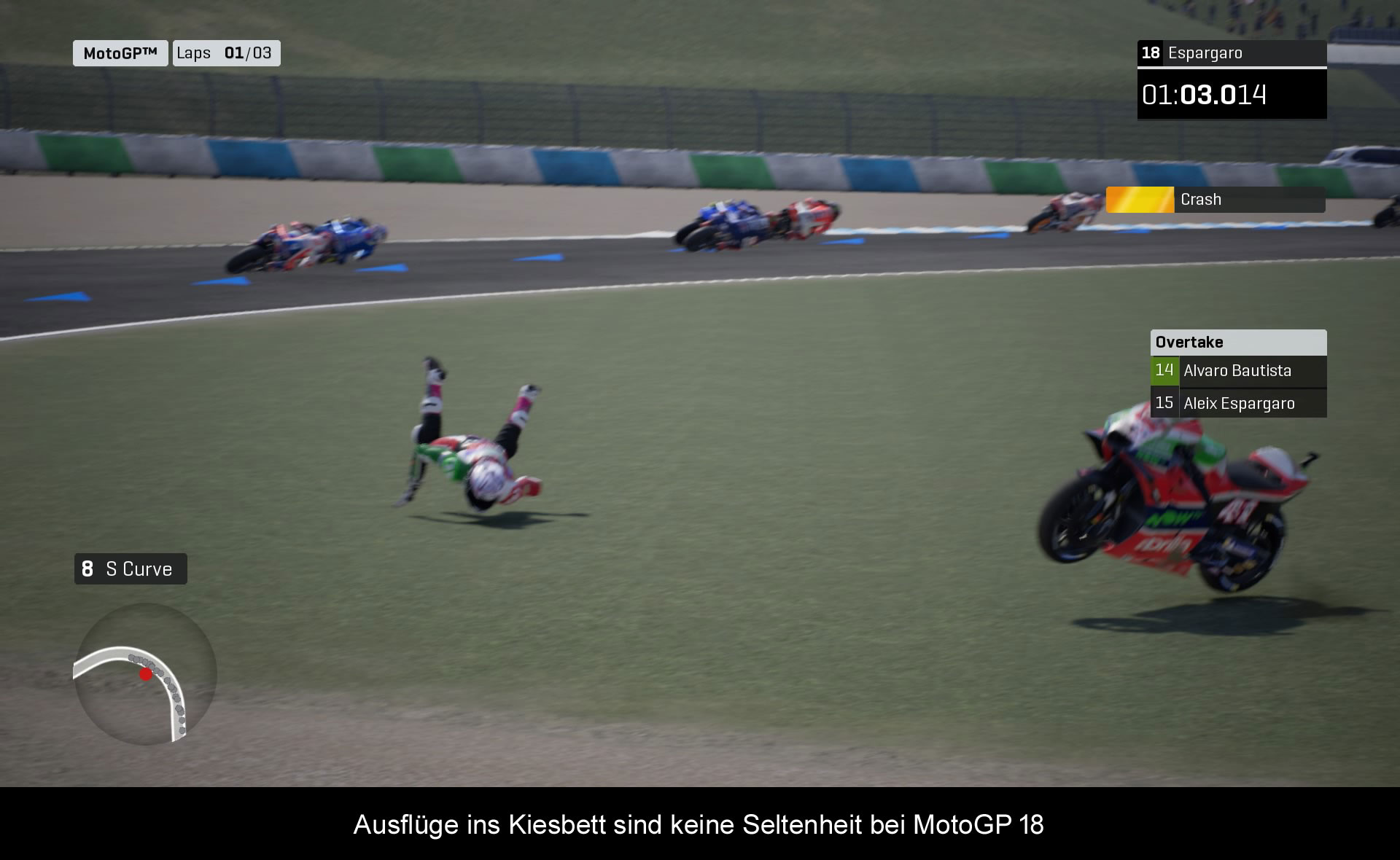 Beginnen möchte ich mit dem neuen und überarbeiteten Gameplay. Während ich bei 16 und 17 keine Probleme hatte, einen Sieg nach dem Nächsten einzufahren, entpuppt sich das Unterfangen inzwischen als eine deutlich schwerere Angelegenheit. Das Motorrad fühlt sich überraschend schwammig an und ist alles andere als leicht zu fahren. Man merkt schnell, dass man eine Maschine mit reichlich PS durch die Gegend fährt. Selbst der kleinste Fehler sorgt dafür, dass man sich sehr oft im Kiesbett wiederfindet. Sowohl die Beherrschung des Motorrads auf der Gerade als auch in den Kurven setzt dieses Mal höchste Konzentration voraus. Während Simulation-Fans sicher auf Ihre Kosten kommen, muss ich zugeben, dass Casuals hier ganz klar den Kürzeren ziehen. Selbst mit Fahrhilfen ist es nämlich äußerst schwer, schnelle Erfolge zu erzielen. Ab und zu ist es mir tatsächlich gelungen, eine Art Momentum aufzubauen und die Kurven zu meistern, aber es dauerte nicht lang bis ich mich wieder auf dem Boden der Tatsachen aka im Kiesbett wiederfand. Und da auch die KI recht gnadenlos ist, sollte man definitiv keine schnellen Erfolge erwarten.