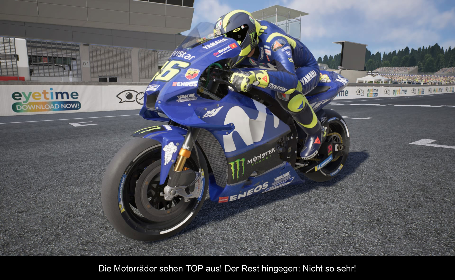 Und als ob ein bockschweres Gameplay und eine lahme Präsentation nicht schon schlimm genug ist, muss ich leider vermelden, dass auch die grafische Seite des Spiels schon bessere Tage erlebt hat. Und dies ist umso schockierender, wenn man bedenkt, dass die Entwickler erstmals auf die Unreal Engine zurückgegriffen haben. Zwar bewirbt Milestone das Spiel mit authentisch modellierten Rennstrecken und einer komplett überarbeiten Optik, aber leider hat mich das Resultat bitter enttäuscht. Dies liegt zum Beispiel daran, dass die Optik durchweg recht schwammig, ausgewaschen und alles andere als sauber wirkt. Zunächst habe ich gedacht, dass mit meiner PS4 vielleicht etwas nicht in Ordnung sei, aber da alle anderen Spiele immer noch „ganz normal“ aussahen, wies am Ende nur MotoGP eine merkwürdige Unschärfe auf. Darüber hinaus wirken sowohl die Rennstrecken als auch die Zuschauer – oder sollte ich sagen INSBESONDERE die Zuschauer - so als würden sie aus der vergangenen Konsolengeneration stammen. „Getoppt“ wird das Ganze nur durch die elend langen Ladezeiten, die vor und nach jeder Session vorkommen. Viel zu lang und viel zu unnötig. Alles in allem ist das Spiel eine technische Enttäuschung. Und dabei hatte man erst mit MotoGP 17 die 60FPS Marke erreicht. Aber auch diese sucht man inzwischen vergeblich. Und was den Sound angeht, bleibt das Spiel im Großen und Ganzen unspektakulär und unauffällig.