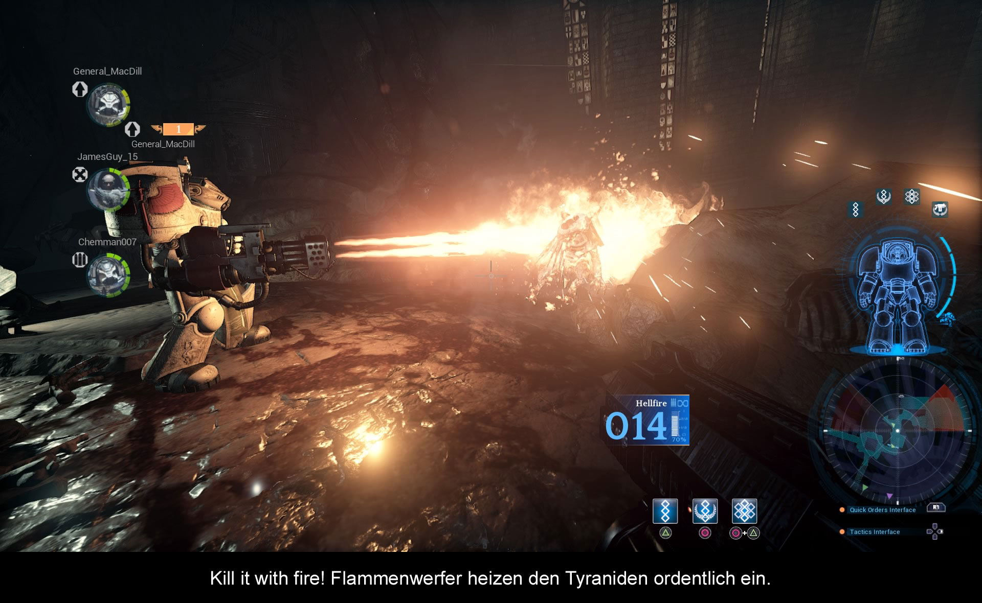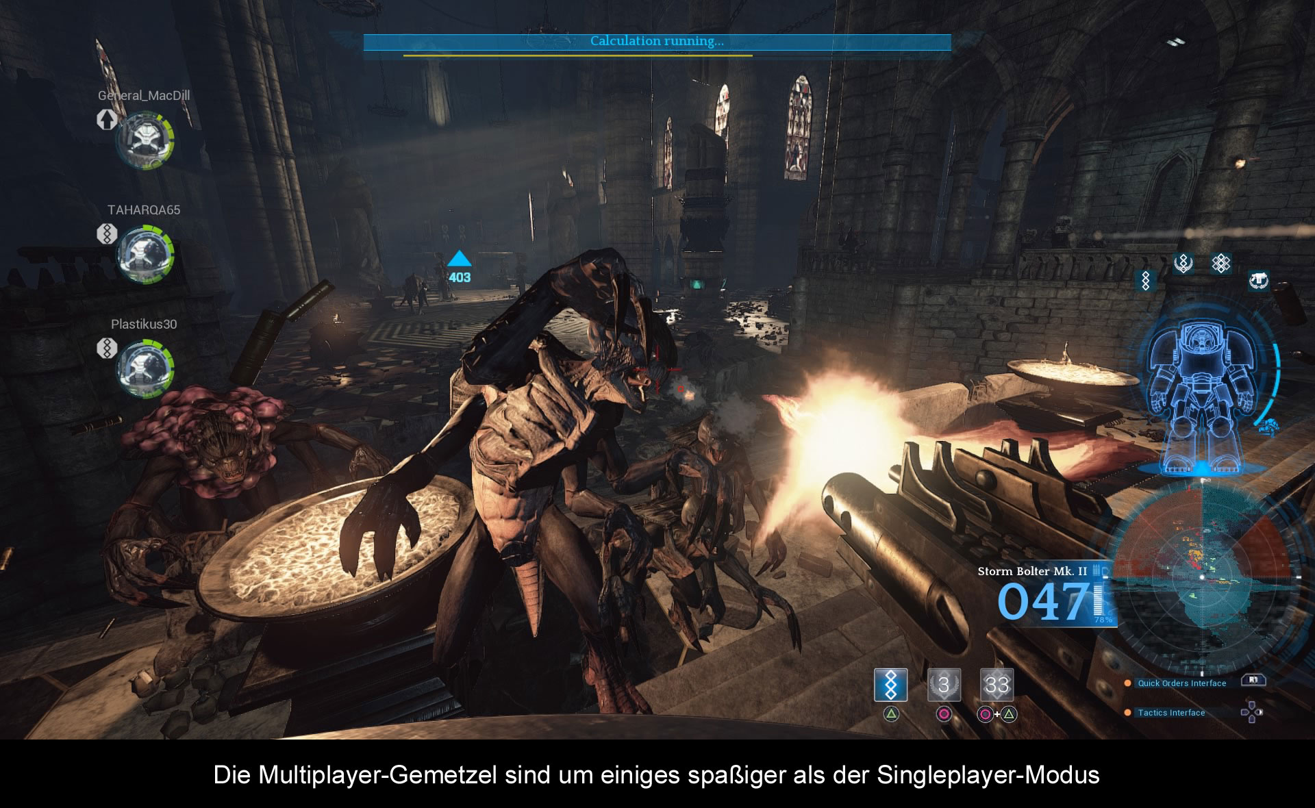 Nach jeder Mission darf ich je nach gefundenen Artefakten und meiner sonstigen Performance Punkte in drei Skill-Bäumen verteilen. Einer macht mich stärker, der zweite meine KI-Kämpfer und der dritte schaltet neue Psyker-Skills frei. Es gibt nicht genug Punkte, um alles freizuschalten, ich muss mich also entscheiden. Und dann sind da natürlich noch die Waffen. Ganz WH40K-typisch sind sie riesig, großkalibrig und machen ordentlich Radau. Deathwing ist wohl das einzige Spiel, welches eine Option besitzt, um die Intensität des Mündungsfeuers einzustellen. Kenner lassen sie natürlich auf Maximum, denn es trägt viel zur Atmosphäre bei, wenn der Sturmbolter dumpf sein Magazin durchrattert und ich für einige Augenblicke nichts Anderes mehr sehe als das riesige Mündungsfeuer, die Körper und Gesichter der Tyraniden, die stroboskopartig aufblitzen und dann meistens in einer Fontäne von Blut wieder verschwinden. Zur Verfügung stehen eine Haupt- und eine Nahkampfwaffe: Vom Sturmbolter über Autokanonen, Plasmakanonen mit sechs Läufen, Flammenwerfern, Blitzklauen und einer Schwert / Schild-Kombination ist alles dabei und lässt sich so auf den eigenen Spielstil und die Gegner anpassen.