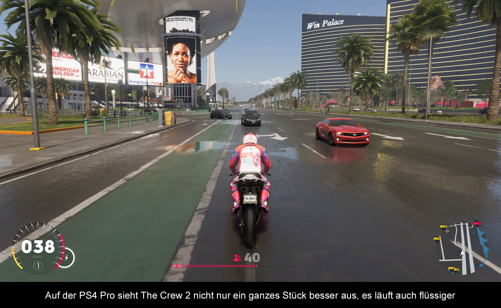 Das Positive vorweg: Es flimmert nix mehr in „The Crew 2“. Das Bild wirkt sehr ruhig und mitunter sehr atmosphärisch, insbesondere bei Regen. Auch finde ich, die einzelnen Regionen der USA haben mehr Charakter bekommen und unterscheiden sich visuell deutlicher. Dafür kommt es mir so vor, dass die Spielwelt kleiner ausfällt und es weniger Straßen gibt. Das Gefühl kann allerdings auch täuschen, da die ganze Karte von Anfang an freigeschaltet ist und man diese nicht erst Schritt für Schritt aufdecken muss. Die Bildrate läuft übrigens recht stabil und nur selten kommt es zu kleinen Rucklern oder minimalem Tearing (meistens nur bei Rennen in Städten auf der normalen PS4). Das Geschwindigkeitsgefühl ist übrigens sehr gut, sogar bei den wahnsinnigen Hypercars. Das hat aber seinen Preis: Pop-ins / Fade-Ins, bei denen die Details erst spät ins Bild „ploppen“ sind an der Tagesordnung. Umso schneller man unterwegs ist, umso stärker fällt das auch auf. Ein weiteres Problem ist die schlechte Sichtbarkeit der Strecken bzw. der Streckenführung. Dadurch ist man immer wieder gezwungen auf die Karte zu schauen, damit man sich nicht verfährt und den nächsten Checkpoint verpasst. Andere Spiele lösen diese Problematik weitaus besser. Ähnlich verhält es sich mit den Tageszeiten – nachts braucht man im Prinzip nicht fahren, denn es ist alles stockdüster – was an sich in der Wildnis zwar realistisch wäre, aber dann sollten die Scheinwerfer der Autos auch funktionieren und einen ordentlichen Lichtkegel werfen, damit man auch was Erkennen kann. Mehr oder minder existieren diese Umstände auch auf der PS4 Pro, mit einem gewaltigen Unterschied – dort sieht das Spiel deutlich besser und höher aufgelöst aus. Also wenn ihr die Möglichkeit habt, spielt es auf dieser Hardware. In Sachen Sound fallen nur die mäßigen deutschen Sprecher negativ aus. Der Rest passt, so wummern die Motoren wuchtig und fett aus den Boxen, oder man genießt die Natur dank herrlicher Umgebungsgeräusche. Wenn man das Radio einschaltet, warten zudem zahlreiche Stationen auf den Hörer mit verschiedenen Genres - mein Liebling ist übrigens der Ambient-Kanal.