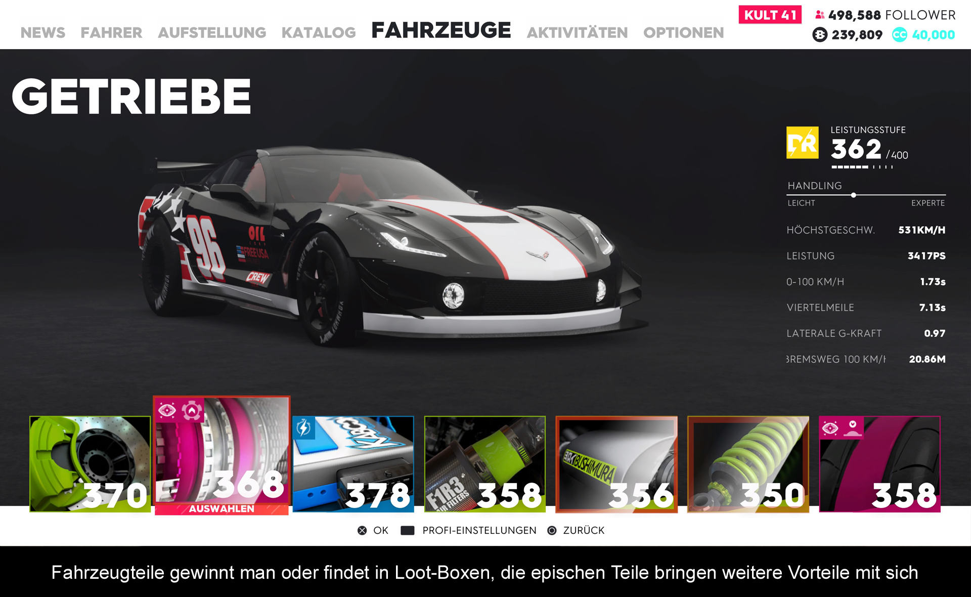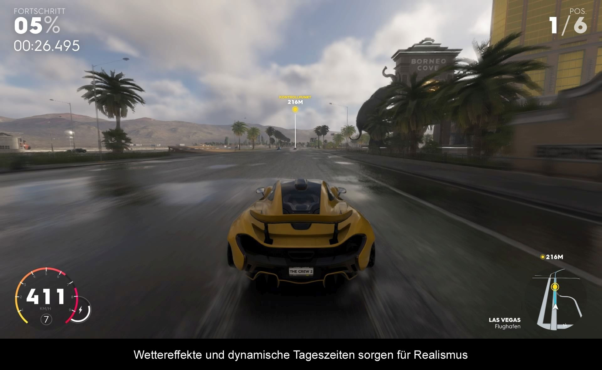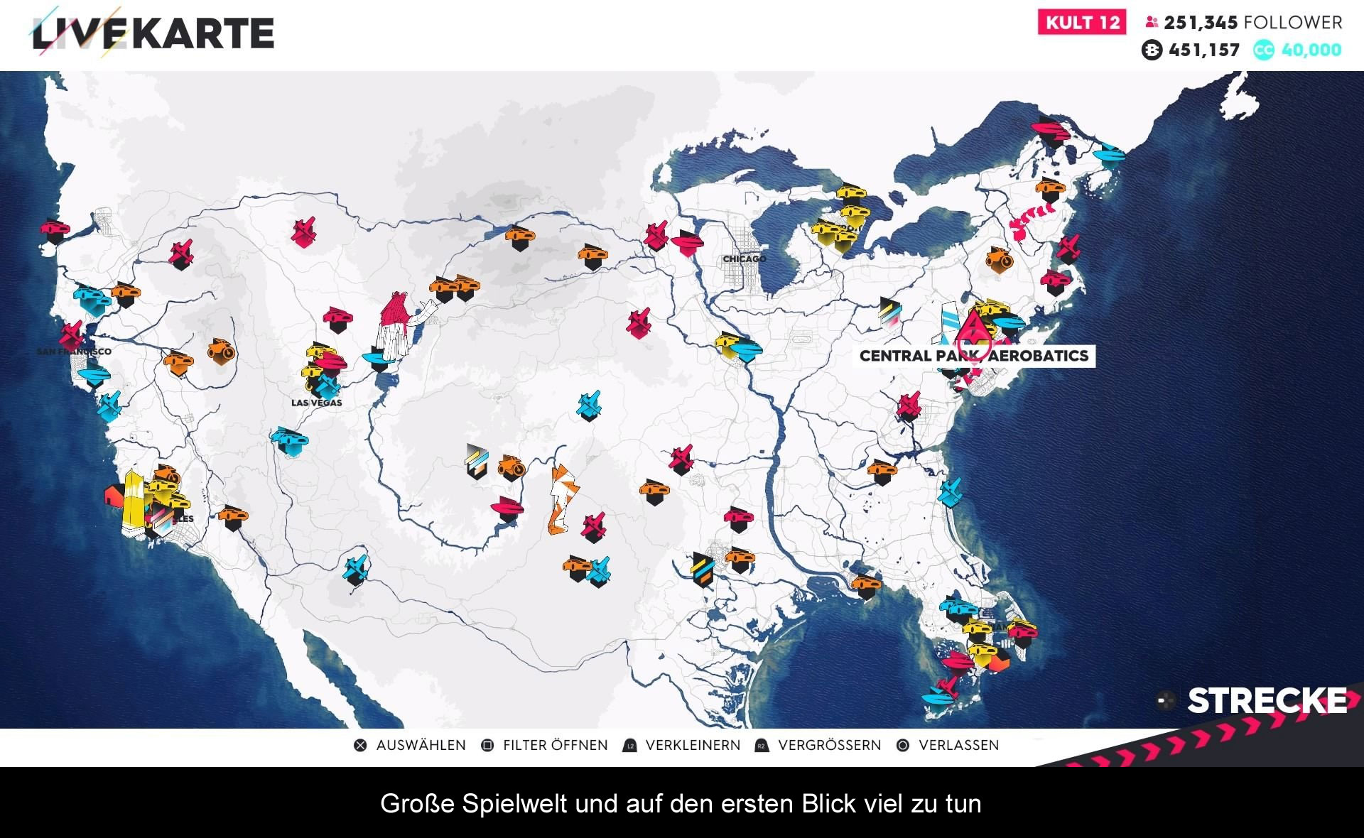 Ein Grundgerüst für den Spielfortschritt ist die Berühmtheit des Spielers, hier gemessen an Hand von Social Media Followers. Erst wenn man ausreichend Anhänger besitzt, steigt man eine Klasse auf und es eröffnen sich neue Möglichkeiten. Am Anfang geht es jedoch etwas zu schnell, sodass man beizeiten alle Renn-Kategorien freigeschaltet hat. Danach kann man seinen Rang zwar weiter verbessern, aber es warten nur noch ein paar Fahrzeuge und etwas seltenes Loot auf den Spieler. Für meinen Geschmack hätte, dass alles etwas ausbalanciert sein dürfen, denn Followers gewinnt man nicht nur durch bestandene Rennen oder Herausforderungen, sondern auch durch einfaches Herumfahren bzw. –fliegen und das Aneinanderreihen von Tricks und Manövern. Gemessen an der möglichen Spielzeit, hat man schon nach wenigen Stunden quasi alles gesehen.