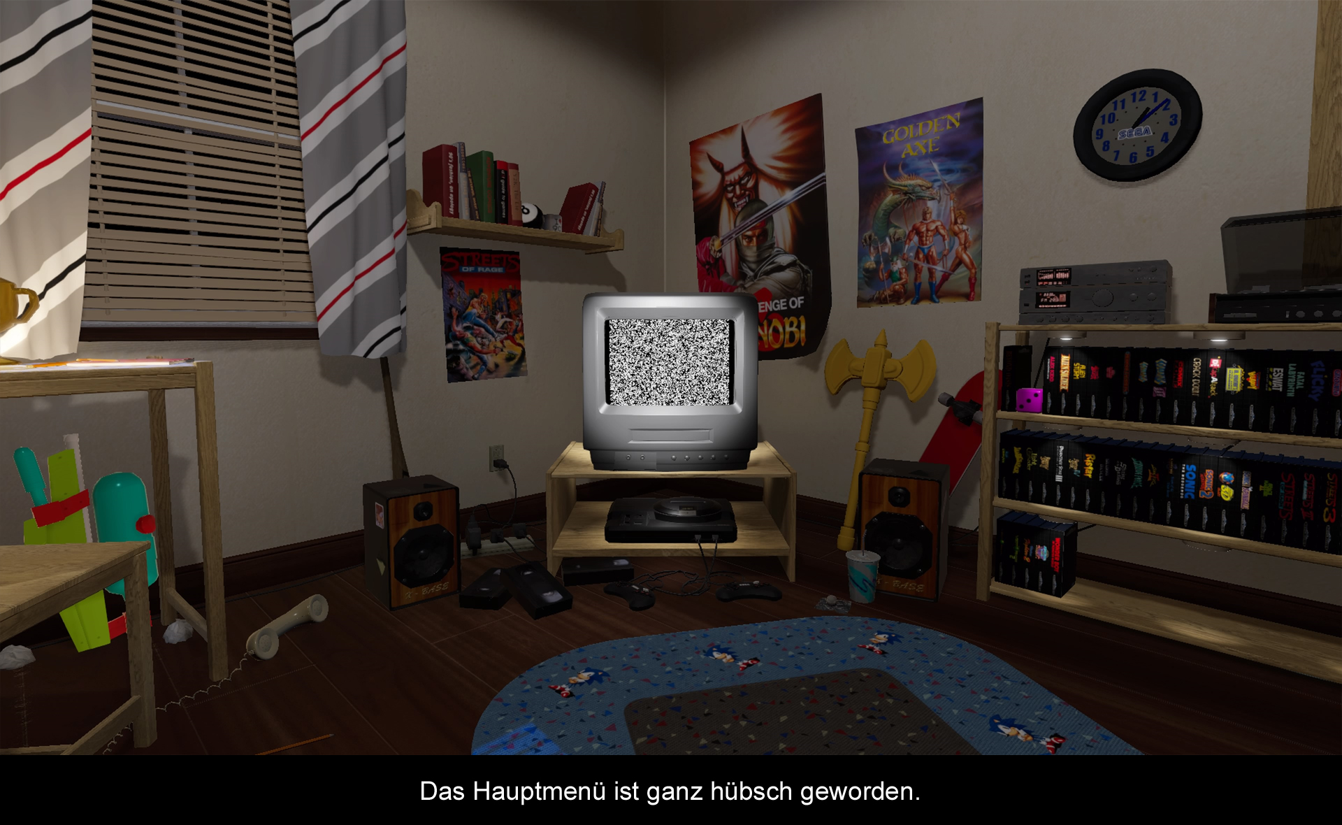 Als Bonus verpasste uns SEGA mit dem letzten Patch zudem eine PlayStation VR Unterstützung. So kauert man nun ganz gediegen mitten im Kinderzimmer vor dem alten Röhren TV und kann sich umschauen. Die Spiele spielt man nun entweder auf einer großen Leinwand in einem schwarzen Raum, oder direkt auf der Röhre mitten im Zimmer. Leider ist die Auflösung ziemlich schlecht und alles flimmert recht stark. Stellt man nun die Scanlines aus und glättet die Pixel, wird es ein wenig erträglicher. Spiele mit viel Text gehen jedoch ziemlich auf die Augen und man muss schon arg weit ran gehen, damit das Bild nicht gar so flimmert. Im Prinzip unspielbar auf dem TV Gerät, auf der virtellen Leinwand dagegen ist das neue Feature ganz witzig und auch für mehrere Stunden erträglich. Seht euch dazu weiter unten auch unser PSVR Gameplay Video an.