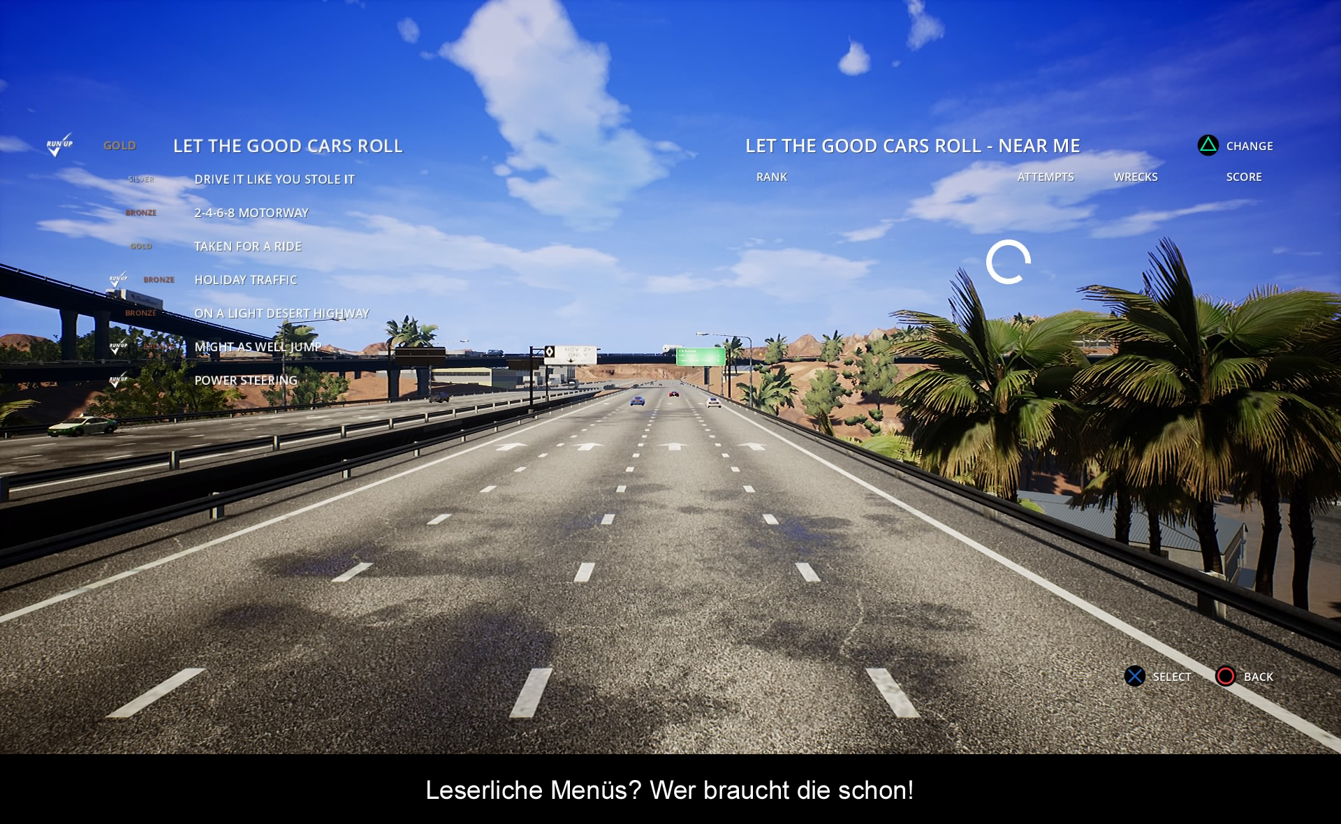 Wenn man das Spiel startet, sieht man einem sehr ernüchternden Bildschirm. Selten habe ich ein Spiel gesehen, welches so lieblos die Menüs präsentiert und die obendrauf auch noch völlig unleserlich sind. Wer zu weit weg sitzt, oder keinen großen Fernseher vor sich hat, wird die Menüs kaum entziffern können. Auch das Endergebnis inklusive der Leaderboards ist kaum erkennbar. Man könnte das ja noch verkraften, wenn das Spiel nicht auch noch über andere Problemen leiden würde. Zum Beispiel die Ladezeiten! Wenn ein wichtiges Merkmal bei Highscorespielen nun mal die steige Repetition ist, sollten der Neustart einer Mission nicht länger als diese dauern. Auch grafische Pop-Ins von n Fahrzeugen machen die Hochgeschwindigkeitsmissionen zur Qual. Dazu noch liebloses Fahrzeug- und Streckendesign und das völlige Fehlen eines Soundtracks, machen den Gesamteindruck da nicht besser.