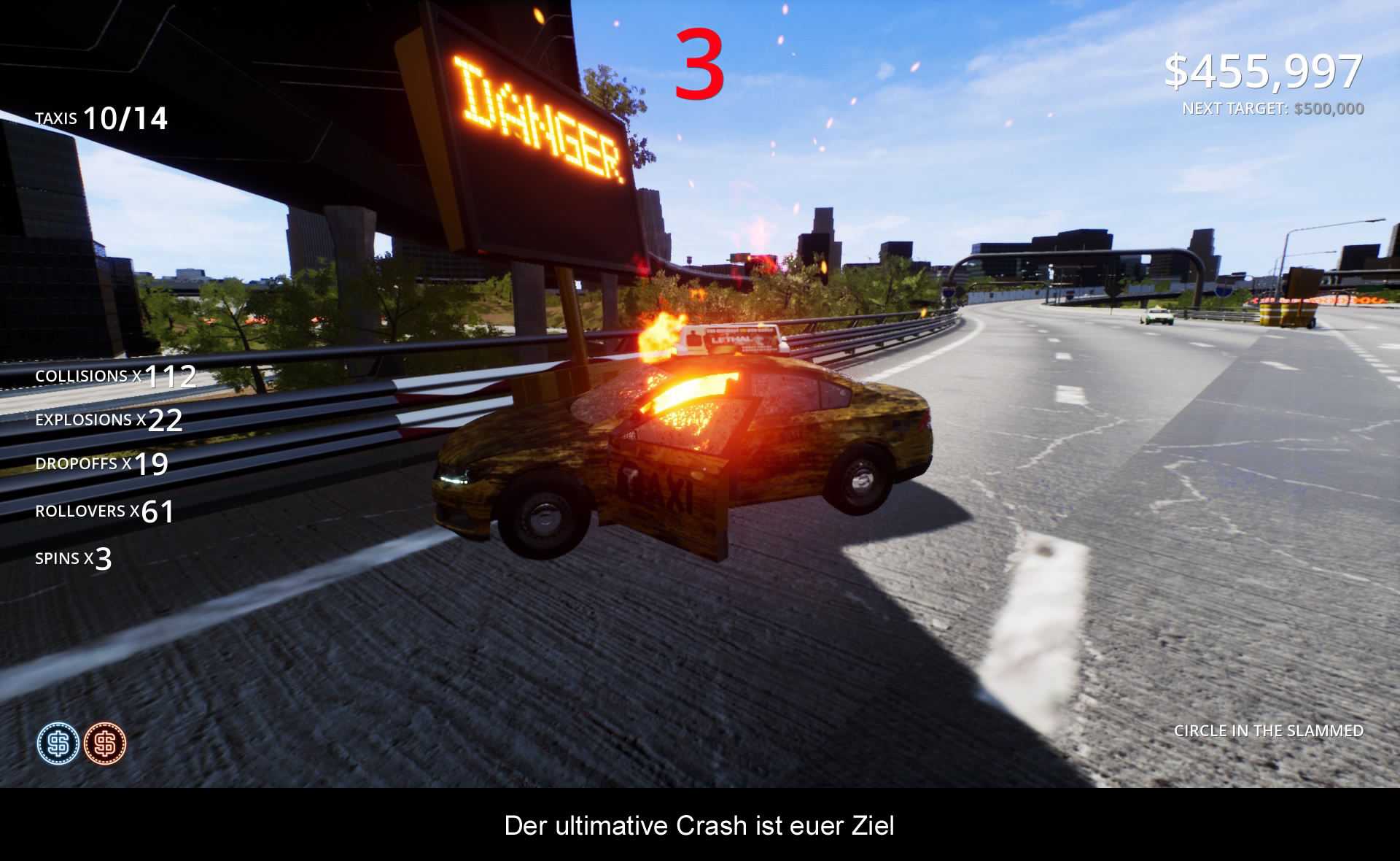Im Gegensatz zum Vorgänger darf man dieses Mal auf der Autobahn in die Crash-Zone rasen. Vier verschiedene Landschaften stehen zur Auswahl, welche nach und nach freigespielt werden. Euer Hauptziel ist es, mit dem Fahrzeug in die „Danger Zone“ zu kommen und einen möglichst spektakulären Unfall zu verursachen. Leichter gesagt als getan, denn Timing ist hier alles. Auf den Weg dorthin gilt es immer wieder, kleine Aufgaben zu erfüllen, wie eine bestimmte Anzahl von Autos zu rammen, oder möglichst schnell das Ziel zu erreichen. Alle diese Aktionen treiben den Multiplikator in die Höhe, welcher dann den Smashbreaker aktiviert. Mit dieser schönen Funktion kann man sein Auto zu einer Explosion bringen, um dann noch eine größere Karambolage zu erzeugen. So rennt der Multiplikator weiter, bis man die höchste Punktezahl erreicht hat. Natürlich wird man das beste Ergebnis nicht beim ersten Versuch erreichen und so wiederholt man Abschnitt für Abschnitt bis die Erkenntnis kommt, dass es mehr ein Rätselspiel ist, als ein Arcade-Renner. Die Fahrzeuge fahren zum Beispiel alle in einem bestimmten Muster und zu bestimmten Zeiten. Wer also den besten Highscore will, muss sich diese Muster einprägen und den effektivsten Weg auf der Autobahn finden. Hin und wieder gibt es Power-Ups, welche mehr Punkte oder andere Boni bringen, doch am Ende zählt oftmals nur die perfekte Karambolage. Um ein wenig Abwechslung reinzubringen, gibt es kleine Bonus-Missionen. Auf dem Weg zur Crash-Zone muss man, wie erwähnt, bestimmte Fahrzeuge rammen, aber auch Sprünge absolvieren, oder mit dem Sportwagen eine konstante Boost-Strecke hinlegen. Dazu stehen insgesamt acht Fahrzeuge zur Verfügung, inklusive einem mächtigen Truck und einem Formel 1 Wagen.