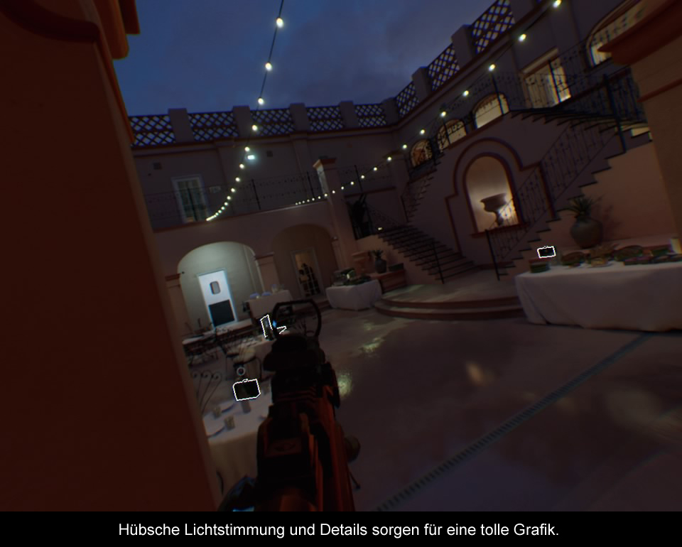 Bei "Firewall: Zero Hour" handelt es sich um einen reinen Multiplayer Shooter ohne Singleplayer Kampagne, welcher auf das nötigste reduziert daherkommt. Ziel bei "Firewall: Zero Hour" ist es übrigens einen Laptop zu beschützen, bzw. auf der Gegenseite diesen zu hacken. Das war’s. Hat man das fünfminütige Tutorial (wo einem bis auf vorwärts und rückwärtsgehen, sowie schießen nichts beigebracht wird) hinter sich, kann man sich Solo nur noch im Trainingsmodus Vergnügen. Hier versucht man nun also allein und ohne KI Kollegen sich gegen Horden von Gegnern zu wehren. Macht natürlich nur bedingt Spaß und ist eher dafür gedacht die neun Karten besser kennenzulernen. Diese sind immerhin sehr abwechslungsreich und bieten ein schönes Design. Hier reicht das Repertoire von einem Lagerhaus, einem Büro, über ein Hotel, einer Botschaft bis hin zu einem Hafen und einer Übungshalle. Die Maps bieten dabei meist neben Außenarealen auch mehrere Stockwerke, verwinkelte Gänge und größere Innenräume. Dabei ist das Design der Architektur so ausgeklügelt, dass Motion Sickness weitestgehend nicht existent ist. Dies verhalf schon "Doom VFR" zu einem magenfreundlichen Spielerlebnis. Zudem ist die Spielgeschwindigkeit eher gemächlich und kein Vergleich zu z. B. Counter Strike. Leider hat die Architektur und Spielgeschwindigkeit zur Folge, dass man sich bei einer Granate nicht mehr wirklich retten kann. Schön dagegen ist der riesige Hinweis, wenn man mit dem Rücken zur Kamera steht. Dies sorgt dafür, dass man nicht durch Hektik plötzlich mit miesem Tracking zu kämpfen hat, wenn die Kamera nur den eigenen Arsch filmt.