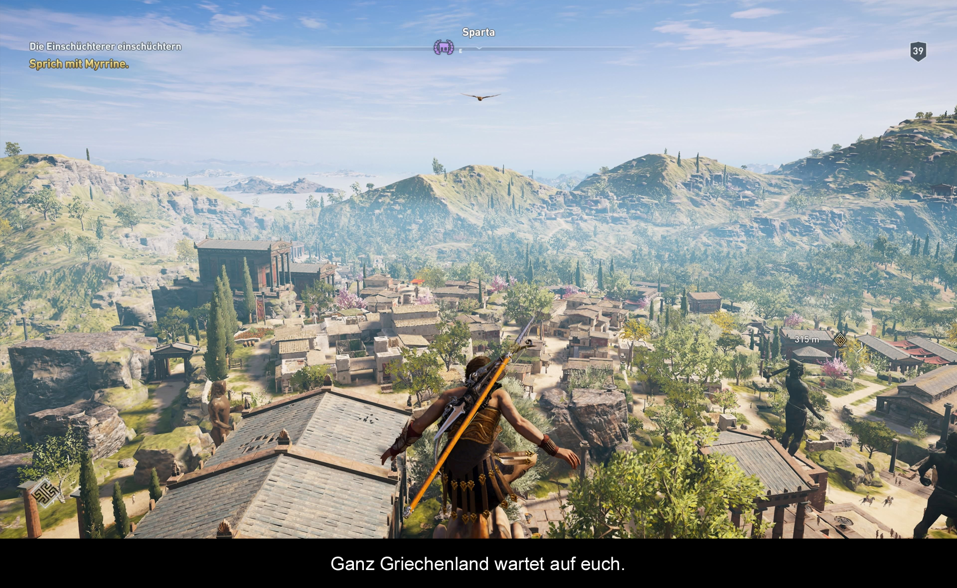Doch was mich am Meisten angetrieben hat, war das ausgezeichnete Gameplay. Ubi Soft hat das Free Running & Fighting System spätestens mit Origins perfektioniert, und Odyssey setzt genau da an. Es macht nach wie vor Riesenspaß sich durch die Gegend zu bewegen und einen Gegner nach dem nächsten außer Gefecht zu setzen, ohne dass es jemand mitbekommt. Zwar sind die Gegner nicht die Schlausten und es sieht auch immer merkwürdig aus, wenn mein Charakter halb aus dem Busch ragt, und trotzdem nicht gefunden wird (Videospiele halt), aber wenn man darüber hinwegsehen kann, wird man mit einem Gameplay belohnt, welches einem viele Freiheiten gibt. Diese Freiheiten sieht man auch im Kampfsystem wieder, wo einem zahlreiche Waffen zur Verfügung gestellt werden. Und wie auch im vorherigen Teil findet man im weiteren Verlauf des Spiels stets neue und stärkere Varianten. Loot ist von großer Bedeutung in Assassins Creed. Überall liegt etwas, und es wird nie langweilig alles mitzunehmen, was man im Verlauf seines Abenteuers findet. Hinzu kommt ein (altbekanntes) Skill-System, welches euch verschiedene Fähigkeiten gibt, um noch zu morden oder mit eurer Umwelt zu agieren. Dennoch darf man die Tatsache nicht ignorieren, dass die Entwickler ganz klar nach dem Motto „Go Big or Go Home“ gearbeitet haben. Was den Umfang angeht, ist Odyssey ein durchaus mächtiges Spiel. Wer dachte, dass Ubi Soft mit der Weltkarte von Origins an seine Grenzen gestoßen ist, wird beim neuesten Serienableger merken, dass man diese Grenzen sogar noch gesprengt hat.