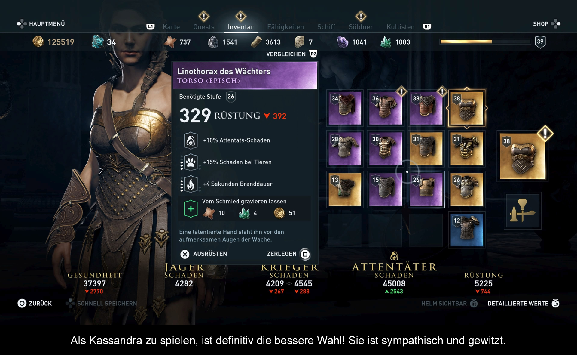 Dass Assassins Creed ein gigantisches Spiel ist, merkt man bereits an der langen Ladezeit zu Beginn des Spiels. Ist man jedoch einmal im Spiel, treten kurze Unterbrechungen lediglich vor und nach Zwischensequenzen auf. Ansonsten bereist man Griechenland ohne größere Wartezeiten. Und dies ist ziemlich beeindruckend, da die Optik durchaus zu gefallen weiß. Selbstverständlich wurde sicherlich mit viel Paste & Copy gearbeitet, aber es gibt auf der anderen Seite auch sehr viele Städte, Dungeons oder Inseln, die mit großer Sorgfalt und Liebe zum Detail modelliert wurden. Die Welt von Assassins Creed Origins ist lebendig und vielfältig. Überall gibt es Statuen, wunderschöne Landschaften, rauschende Meere, Denkmäler, riesige Gebäude oder mit Menschen überfüllte Straßen zu sehen. Letztere spendieren vor allem den Großstädten sehr viel Charakter und Charme. Ebenso überragend fand ich das Charaktermodell von Kassandra, die ihre Emotionen realistisch zur Geltung bringt. Alles in allem ist Odyssey ein grafisches Powerhouse. Klar gibt es hier und da unglückliche Texturen, und auch gelegentlich ein paar Slowdowns, aber angesichts der gewaltigen Bildqualität und dem größtenteils flüssigen Ablauf lässt sich dies auf jeden Fall verkraften. Einige Auf und Abs gibt es hingegen beim Sound. Während der opulente Soundtrack auf ganzer Linie zu gefallen weiß und perfekt zum Ambiente passt, schwankt die Qualität der Synchronsprecher zwischen professionell und lachhaft. Wenigstens die Synchronsprecherin von Kassandra schafft es, ein durchweg gutes Niveau zu bieten.