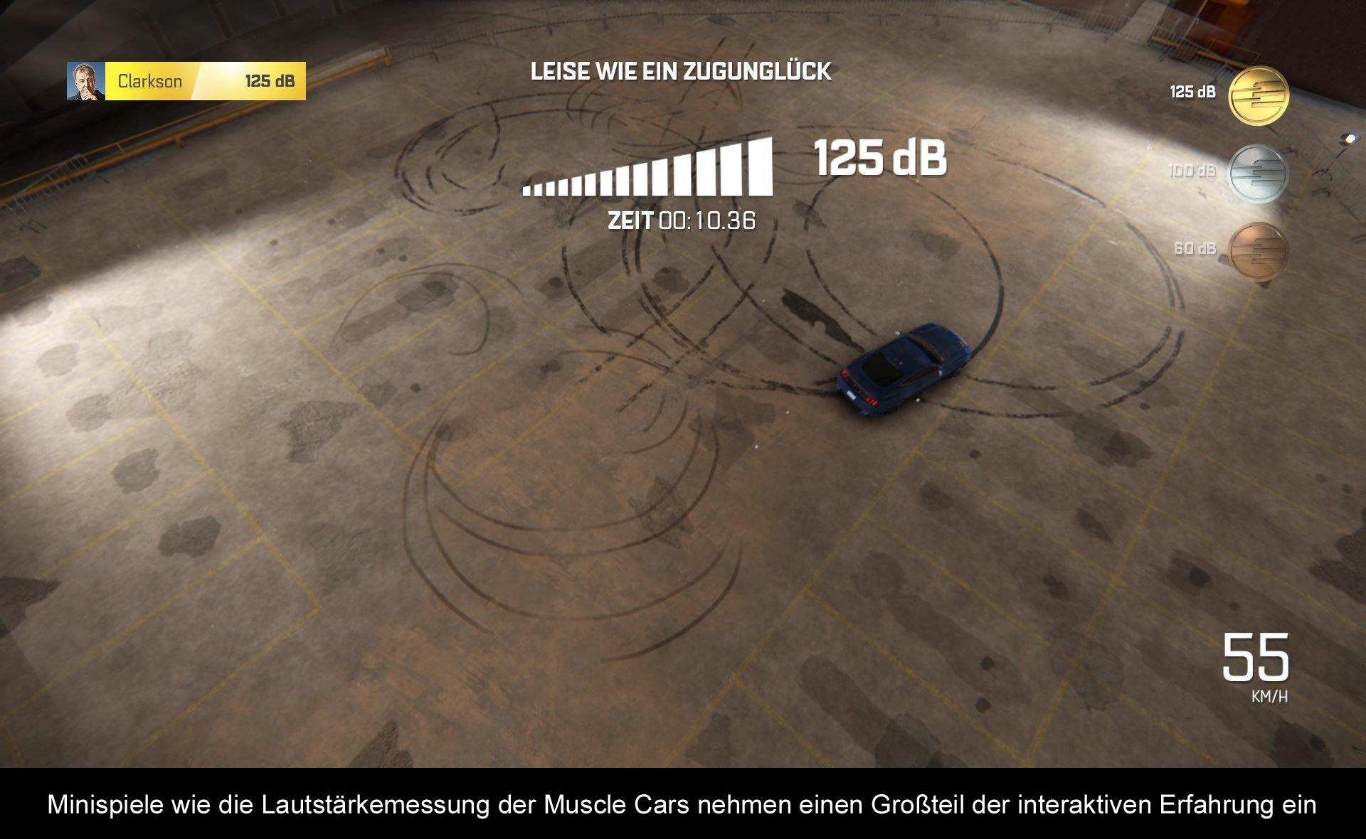 Beim Gameplay ist der größte Kritikpunkt trotzdem die Steuerung. Sie reagiert leicht träge auf die Eingaben des Spielers und lenkt ab einem bestimmten Zeitpunkt auch zu stark ein. Die recht geraden Strecken erleichtern zwar das Lenken, aber spätestens bei engen Kursen (wie die Detroiter Fabrik) ist man genervt. Ein Physikmodell ist fast nicht vorhanden, aber okay – „The Grand Tour Game“ will auch keine Simulation sein, sondern einfachen Arcade-Spaß bieten. Was in meinen Augen aber noch fehlt: Eine Auto-Enzyklopädie mit einem 3D Modell zum Anschauen und ein paar Infos. Dafür hätte ich auf die sinnfreien Gadgets und die vielen Kommentare verzichtet.