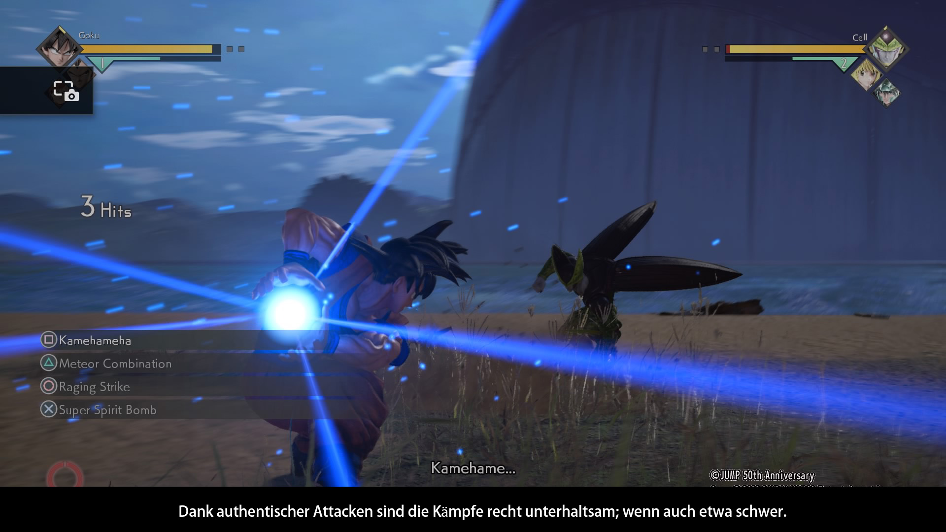 Wie schon eingangs erwähnt, erlebt man das Spiel aus der Perspektive eines Menschen der von der Jumpforce zum Helden gemacht wurde. So versetzt euch das Spiel zunächst einmal in einen Charakter-Editor, wo man sein virtuelles Abbild selber gestalten kann. Der Editor selber ist relativ fähig und leicht zu bedienen. Im Anschluss findet man sich dann in einer HUB-Welt wieder, die frappierend an die Welt von Xenoverse erinnert. „Never change a winning Team“, heißt es zwar so schön, aber dennoch fand ich die Ähnlichkeit sehr stark. Ein Schelm, der denkt, man hätte hier nur kopiert. Aber zurück zur HUB-Welt: Diese ist war groß und weitläufig, aber im Grunde reicht es aus, die Missionen von den einzelnen Ständchen aus zu aktivieren, die allesamt im Zentrum gelegen sind. Je nach Stand hat man die Auswahl zwischen Offline- und Online-Kämpfen, Trainingskämpfen, und Story-Kämpfen. Im Mittelpunkt stehen natürlich die Story-Kämpfe, die zu Beginn als auch im Anschluss durch Zwischensequenzen eingeleitet werden. Was den Schwierigkeitsgrad angeht, haben es die Kämpfe durchaus in sich. Es ist fast unmöglich ohne zusätzliche Trainingseinheiten, das Ende der Geschichte zu erreichen. Aber andererseits fand ich es auch nervig, ständig wieder das HUB zu verlassen, und danach wieder zurückzukehren, weil dies stets mit relativ langen Ladezeiten verbunden war. Dennoch wird man früher oder später nicht ans Trainieren vorbeikommen. Das Spiel bietet nämlich ein Charaktermenü, wo man seine hart erarbeitete Währung gegen neue Moves austauschen kann. Die Moves entsprechen den jeweiligen Attacken der verschiedenen Anime-Charaktere. Die Anwendung selber ist relativ einfach, da man diese gewaltigen Angriffe in Kombination mit dem R2-Bumper und einem der Face-Buttons ausführen kann. Wie man aber schnell merken wird, ist simples Draufhauen nicht die beste Lösung in Jump Force. Richtiges Ausweichen oder erfolgreiches Blocken sind von elementarer Bedeutung, um nicht sofort zerstört zu werden. Wie nämlich eingangs erwähnt, kann die CPU ziemlich erbarmungslos sein, falls man nicht aufpasst. Ein interessanter Faktor von Jump Force ist übrigens die Tatsache, dass man die jeweiligen Kämpfe zu dritt ausführt, was die Kämpfe ziemlich facettenreich und rasant gestaltet.