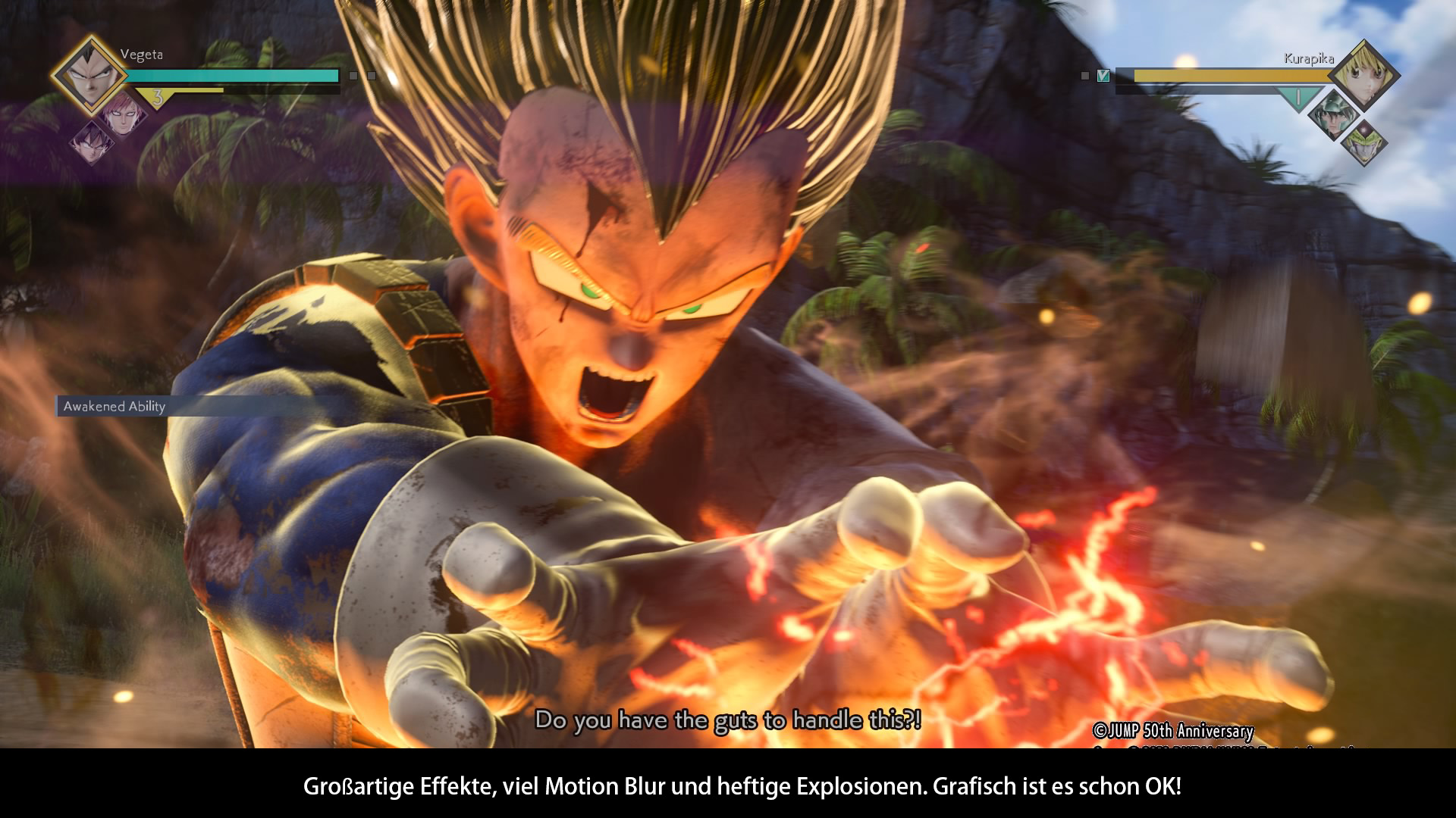 Jump Force ist ein zweischneidiges Schwert – Beginnen möchte ich mit den positiven Aspekten: Was die grafische Qualität der Kämpfe angeht, bietet Jump Force mit das Beste, was ich in dieser Generation gesehen habe. Zwar lässt sich über das Art-Design (welches selbst den liebsten Charakter stets böse dreinblicken lässt) streiten, aber sobald man die mächtigen KI-Attacken aktiviert, oder in Kombination mit seinem CPU-Partner auf den Gegner stürmt, überrascht Jump Force mit einer unglaublichen Effektgewalt, die ich so bei noch keinem Anime-Titel gesehen habe. Getrübt wird dies nur doch gelegentliche Framerate-Einbrüche bei Zwischensequenzen oder gewaltigen Angriffen, wo das Spiel eindeutig an seine Grenzen stößt. Dennoch konnte ich diesen kleinen Makeln noch leben. Was hingegen einen schlechten Nachgeschmack hinterließ, waren die miserablen Animationen außerhalb der Kämpfe. Satt angeregt miteinander zu interagieren, wirken die Charakter stets supersteif und leblos. Nervig sind auch die langen Ladezeiten und das stets aufpoppende Fenster, welches einem sagt, dass das Aufzeichnen der Zwischensequenzen untersagt ist. Dies geschieht so häufig, dass es am Ende nur noch nervt. Was den Sound angeht, möchte ich allen voran den enttäuschen Soundtrack erwähnen, der nicht einen Song der jeweiligen Animes umfasst. Also kein Cha La Head Cha La von Dragonball, kein Believe It von Naruto und schon gar kein The Day von My Hero Academia. Immerhin bietet das Spiel die original japanischen Synchronsprecher, was wenigstens ein kleiner Wermutstropfen ist. Diese kommen zwar nicht immer zur Geltung, aber wenn es der Fall ist, wirken sie stets 100 % motiviert und bei der Sache.