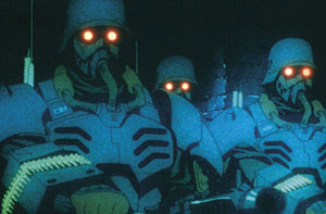 Was hat das Spiel doch im voraus für Lob geerntet! Doch spätestens nach dem ersten Zocken stellt sich schnell die Ernüchterung ein, den es ruckelt oft ziemlich heftig. Nicht das das Spiel schlecht aussieht [nein ganz im Gegenteil], aber man fragt sich nach mehreren Stunden Spielzeit doch, sind diese konstant niedrigen FPS wirklich der Preis denn man für eine solche Grafik auf PS2 inzwischen zahlen muss? Außer dieser ärgerlichen Sache mit den niedrigen FPS gibt es noch einige Clippingfehler, welche das Spiel aber nicht wirklich schlechter machen. Aber ansonsten kann man gegen Killzone wirklich nicht viel sagen, die meisten Texturen sind sehr schön, die Waffenmodelle hervorragend modelliert, es gibt jede Menge schöne Licht- und Raucheffekte und das Leveldesign ist fantastisch und recht abwechslungsreich ausgefallen. Dabei orientieren sich die verschiedenen Missionen an Kriegschauplätzen der letzten Jahre. Aber auch beim Charakter Design wurde nicht geschlampt, die Helghast präsentieren sich in vielen verschiedenen Arten. Aber nicht nur beim Leveldesign wurde anscheinend „abgeguckt“, auch die Helghast sehen den Truppen aus dem japanischem Anime „Jin-Roh“ zum verwechseln ähnlich. Damit ihr wisst was ich meine, hier mal ein Vergleich: