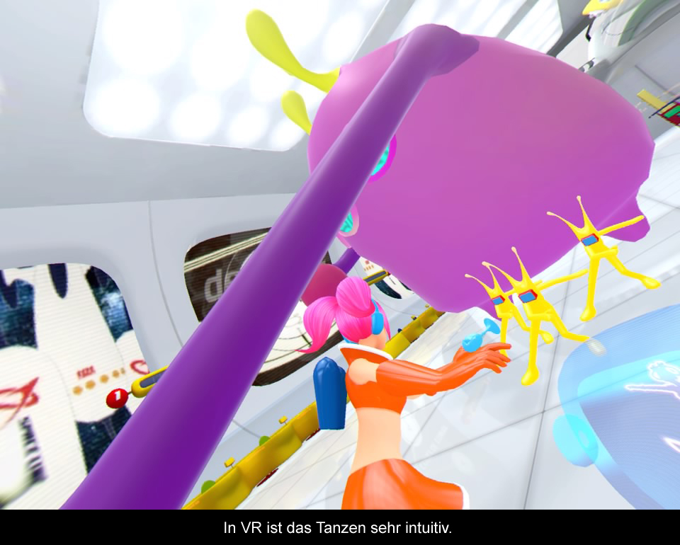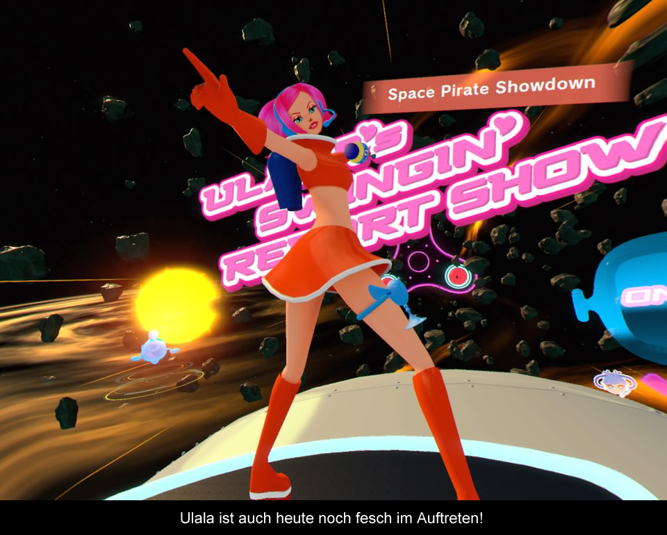 Kurz noch einen Abstecher zur Story. Man selbst spielt in der VR Interpretation nicht Reporterin Ulala, sondern einen Frischling bei Channel 5. In einem kurzen Tutorial wird einem schnell das Gameplay erklärt, bevor einem die Nachricht ereilt, dass in einem Raumhafen eine Invasion stattfindet und Aliens (sogenannte Morolians) die Menschen zum Tanzen zwingen. Neben den Raumhafen führt uns das Abenteuer noch in einen intergalaktischen Fahrstuhl, durch einen Asteroidengürtel und abschließend in einen futuristischen Konzertsaal. Technisch ist der Titel übrigens sehr durchschnittlich. Ulala schaut noch immer bezaubernd aus und bewegt sich stilvoll durch die Szenerie, die Animationen der restlichen Charaktere sind jedoch lange nicht mehr Up to date und auch die Level sind nicht sonderlich detailliert oder liebevoll gestaltet. Der Retro Chic kommt im Prinzip nur im ersten Level zur Geltung. Immerhin bleibt man von Schwindel und Übelkeit verschont, da man sich die ganze Zeit auf der gleichen Position befindet und sich nichts weiter auf dem Bildschirm tut. Übel wird einem nur, wenn man an die in den Wind geschossenen 45€ denkt.