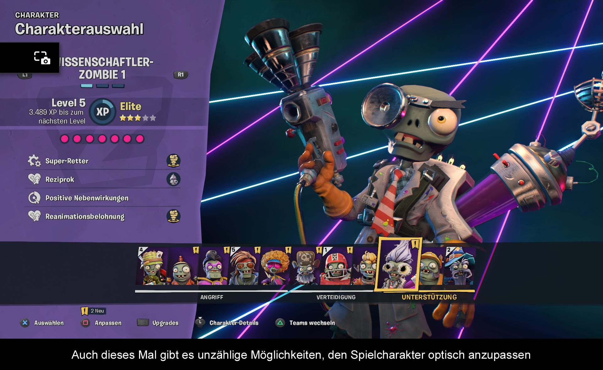 Das ist die neue Angreiferin bei den Zombies. Mit ihren Energieblitzen hält sie die Gegner auf Distanz und durch die Rollschuhe gleitet sie schnell über das Schlachtfeld. Doch ist etwas Übung nötig, bis man mit den Blitzen richtig trifft. Auch der Blitztornado braucht Einarbeitungszeit. In den Händen von erfahrenen Spielern kann Miss Electra zu einer großen Gefahr werden.