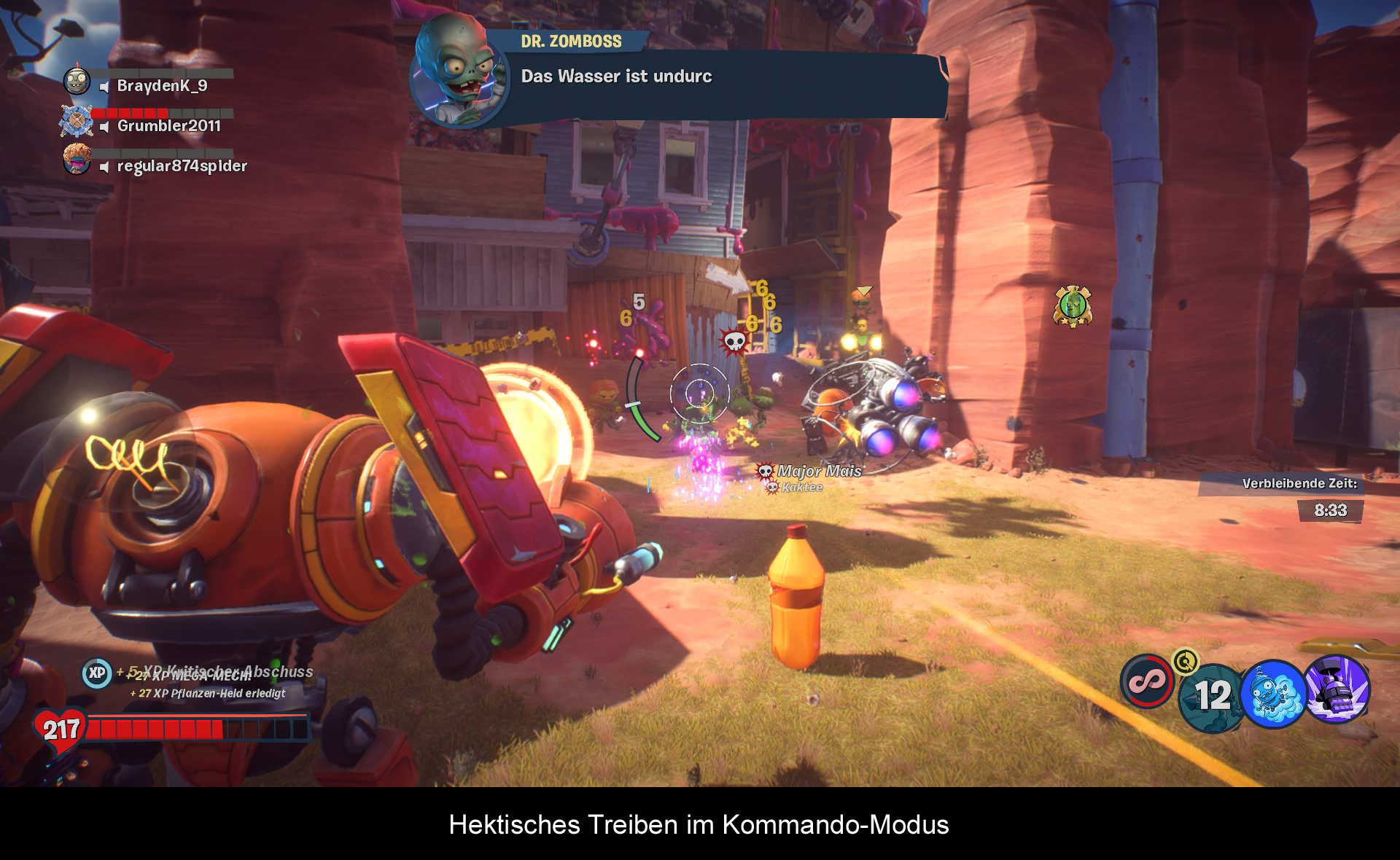 Bei den Spielmodi hat sich nicht viel getan. Noch immer ist das Kernstück die Revierübernahme. Hier greift man abwechselnd die Basis des Gegners an bzw. verteidigt seine eigene. Jedoch sind die Karten gegenüber dem Vorgänger wesentlich kompakter und das Endspiel ist auch nicht mehr so „kreativ“ wie bei Teil 2. Statt einer Burg zu erobern, muss man hier nur noch einen Bohrer langgenug beschießen oder Bomben an eine bestimmte Stelle bringen. Auch gibt es nun in fast jeder Mission einen Transporter, welchen es zu schieben gilt. Den Karten fehlt es gewissermaßen an kreativen Ideen. Auch aufgrund der neuen Sprint-Funktion sind diese weitläufiger, wodurch man gut 20 Sekunden braucht, um wieder im wilden Treiben zu sein. Auffällig wird das bei einer Karte, wo man als Zombie eine Zone quasi ohne Kampf durchläuft. Trotz diesem und anderen kleinen Designschwächen, entsteht abermals bei den 12 gegen 12 Schlachten ein hektisches Treiben, welche rund 20 Minuten dauern. Daneben gibt es noch klassische Modi wie Team Deathmatch oder Gnom-Bombe. Neu ist die Kampf-Arena für den kompetitiveren Wettbewerb. Hier wurde sich am E-Sport orientiert und man darf immer nur einmal eine Klasse wählen. Wer lieber gemeinsam mit Freunden nur KI-Zombies oder Pflanzen erledigen will, für den gibt es das Kommando. Dieser Modus wurde stark vereinfacht und es gilt 5 Runden zu überstehen, wobei in der letzten Runde ein Endgegner erscheint. Wöchentlich gibt es zudem spezielle Events mit eigenen Regeln. Doch basieren diese nur auf den bekannten Spielmodi.