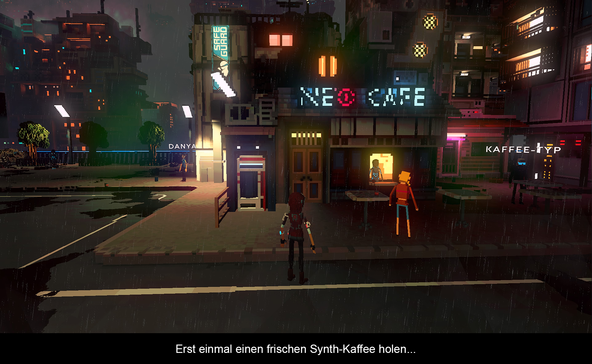 Grafisch setzt „Cloudpunk“ auf Voxel-Grafik im Stil alter PS1 Spiele. Natürlich mit reichlich Neon-Farben versehen und einem permanenten Dauerregen. Der Retro-Stil hat schon was und sprüht nur so vor Atmosphäre. Allerdings ist das kein Freifahrtschein für die technischen Unzulänglichkeiten. So ist die Framerate bestenfalls akzeptabel und wird obendrein durch permanentes Tearing gestützt. Die Sichtweite ist auch nicht sonderlich hoch und es ploppen zahlreiche Objekte ins Sichtfenster. Die allgemeine Bildqualität wirkt ebenfalls unsauber. Die einzelnen Stadtteile sind durch Ladebildschirme verbunden, was ziemlich störend wirkt, da man praktisch immer in andere Stadtteile fliegen muss. Apropos Fliegen, andere Fahrzeuge sieht man fast nur beim Betreten eines Bezirks, umso länger man fliegt, umso weniger Verkehr befindet sich in der Luft. Hier kommt die Engine ganz klar nicht mit dem Streamen hinterher. Zu Fuß spielt man am Besten in der Ego-Perspektive, das ist flüssiger und man muss keine schlechten Laufanimationen ertragen. Übrigens die namensgebenden Wolken sind praktisch immer nur oben bzw. unten zu sehen, durchfliegen kann man diese jedoch nie.