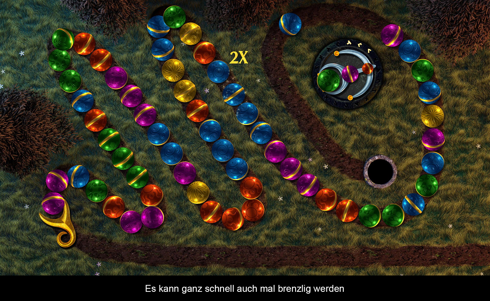„Sparkle 2“ ist ein Murmelshooter, der auch Elemente von „Match 3“ Puzzlespielen beinhaltet. Ihr steuert auf einer bildschirmfüllenden Karte eine Schleuder und müsste die nahenden Murmeln davon abhalten, ins Ziel zu kullern. Dazu feuert man ebenfalls Kugeln ab, um passende Farbkombinationen zu erhalten. Mindestens drei Murmeln in einer Farbe braucht es, um die Reihe zu zerstören. Der Level ist beendet, wenn man die Runen der Schleuder gefüllt hat, der Zugang der Murmeln versperrt wurde und man alle Kugeln vom Bildschirm entfernt hat. Damit sich der Titel flüssiger spielt, kann man die geladenen Kugeln in der Schleuder wechseln. Zudem schaltet man bessere Extras frei, umso weiter man im Quest-Modus voranschreitet. Die Verbesserungen machen das Spiel dann auch etwas einfacher – zum Beispiel lassen sich Power-Ups magnetisch heranholen. Insgesamt sorgen 16 Verzauberungen für rund 200 Kombinationsmöglichkeiten. Dadurch kann man die Schleuder an seinen persönlichen Spielstil anpassen.