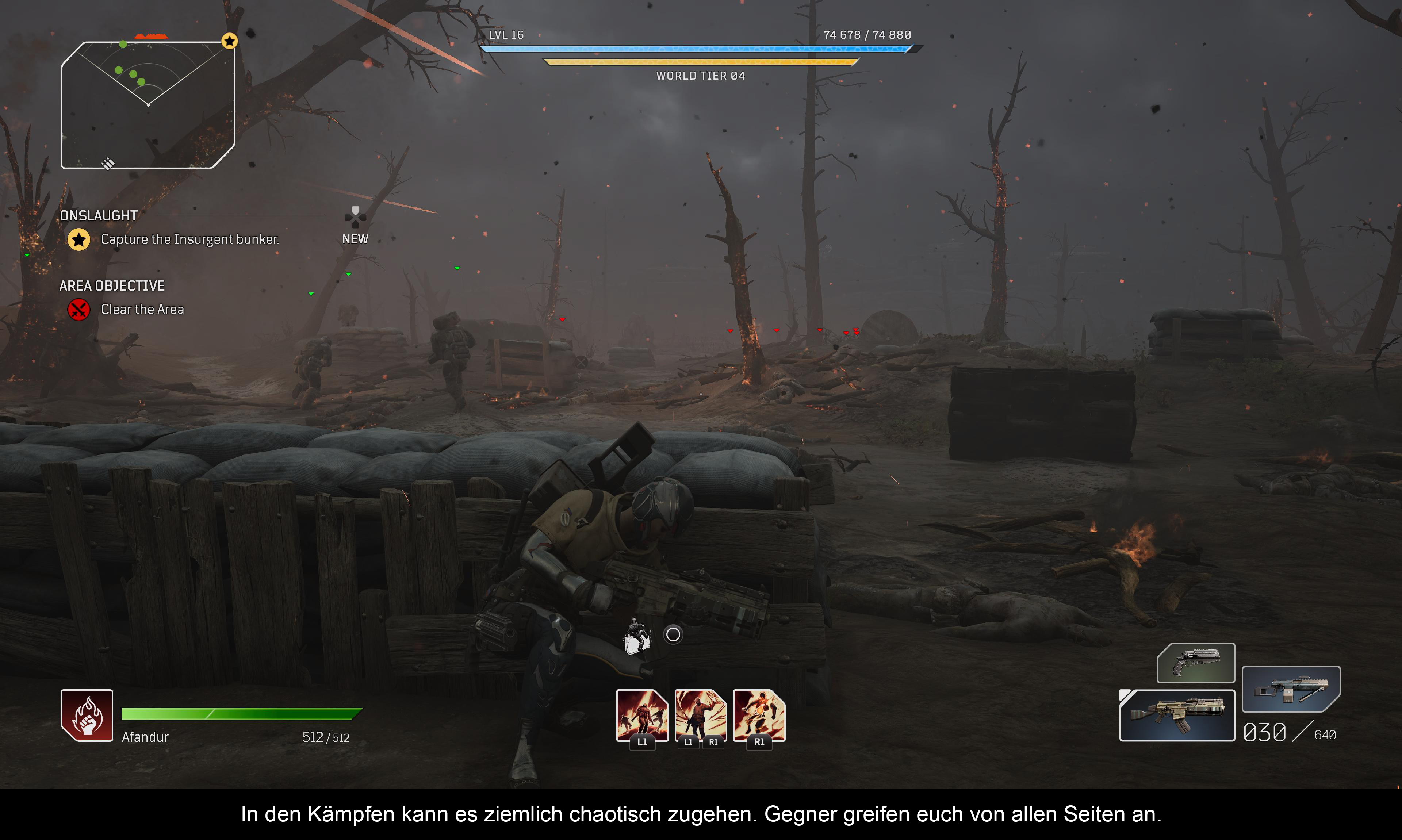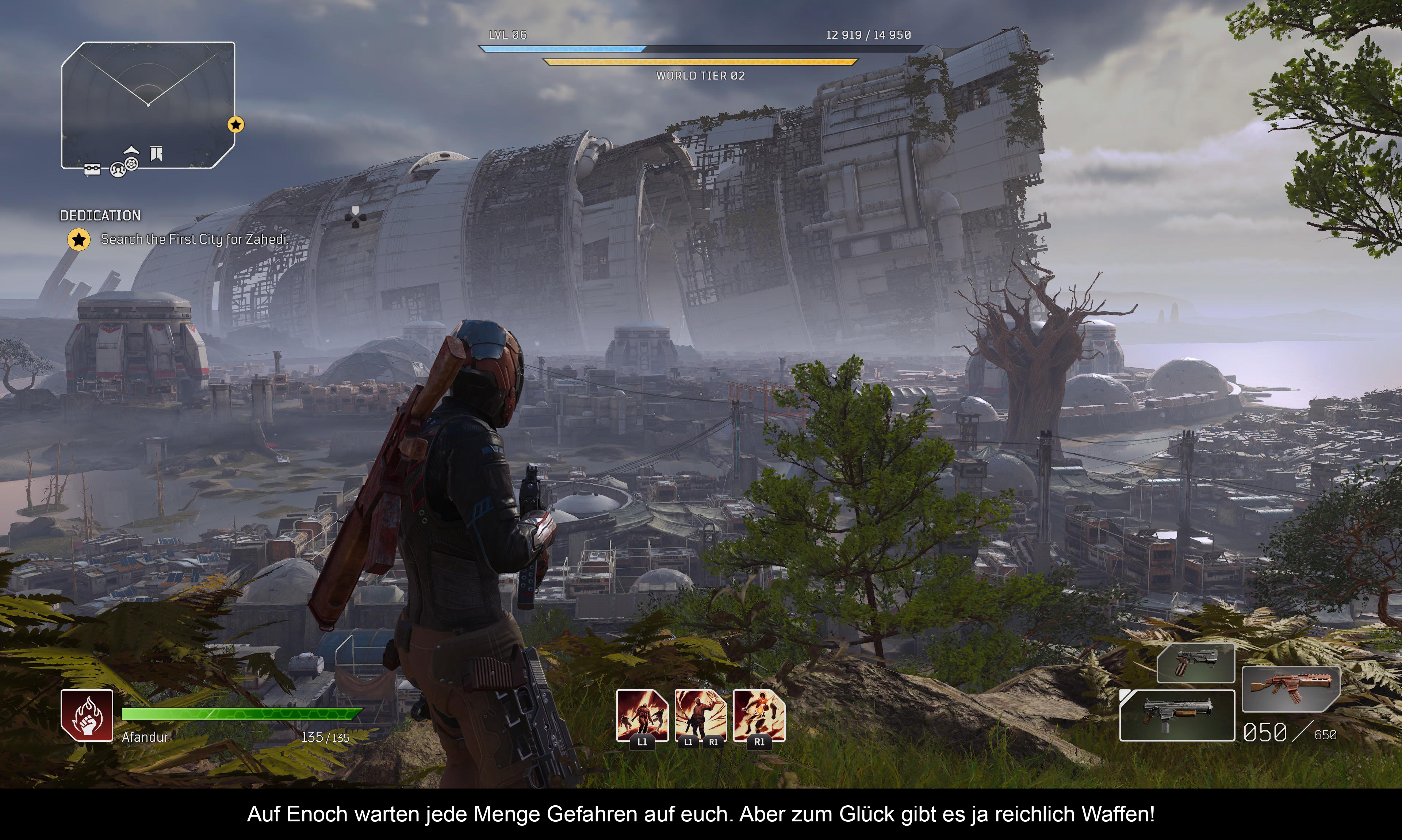 Also vom Prinzip her hat Outriders einiges zu bieten. Zahlreiche Welten, einen umfassenden Skill-Tree für sämtliche Klassen, viel Loot und noch mehr Action - doch ist alles Gold was glänzt? Nicht ganz. Vor allem die Story konnte mich nie ganz in ihren Bann ziehen. Während es in den einzelnen Missionen stets bluternst um Leben oder Tod ging, ähnelten die auf witzig getrimmten Dialoge in den zwischengeschalteten Videosequenzen mehr an klassische Stand Up Shows. Dieser Wechsel zwischen superernst und Seinfeld-esquen Wortspielen hat mir einfach nicht gefallen. Weiterhin hat mir auch nicht zugesagt, dass viele Informationen nur in Form von Memos und Notizen vermittelt wurden. Die Welt von Outriders hat mehr zu bieten als man denkt, aber um halt wirklich jedes Detail zu erfahren, muss man sich zunächst durch sehr viel trockenen Text wälzen. Außerdem dauert es nicht lange, bis man den relativ simplen Aufbau der einzelnen Areale verstanden hat. So verfügt jedes Level über eine Hauptquest, sowie über ein paar wenige Sidequests, deren Inhalt jedoch stets identisch ist - so geht es zum Beispiel entweder darum einen freilaufenden Bösewicht zur Strecke zu bringen, oder ein wildes Tier zu erlegen. Und auch das Spielgeschehen folgt dabei meist nur einen Pfad: Einer linearen Strecke nachlaufen, Gegner totschießen, dann weiterlaufen und abschließend einen Endgegner besiegen. Und obwohl ein bisschen Abwechslung nicht schlecht gewesen wäre, muss ich zugeben, dass ich eine gewisse Zeit doch ganz gut unterhalten wurde. Der Flow ist simpel, und vor allem nach der Arbeit - wenn man einfach mal etwas zocken möchte, ohne groß nachzudenken - hat das Ballern in Outriders doch schon Spaß gemacht. Und auch die Suche nach neuen Waffen und Ausrüstungsgegenstände hat dabei extrem motiviert.
