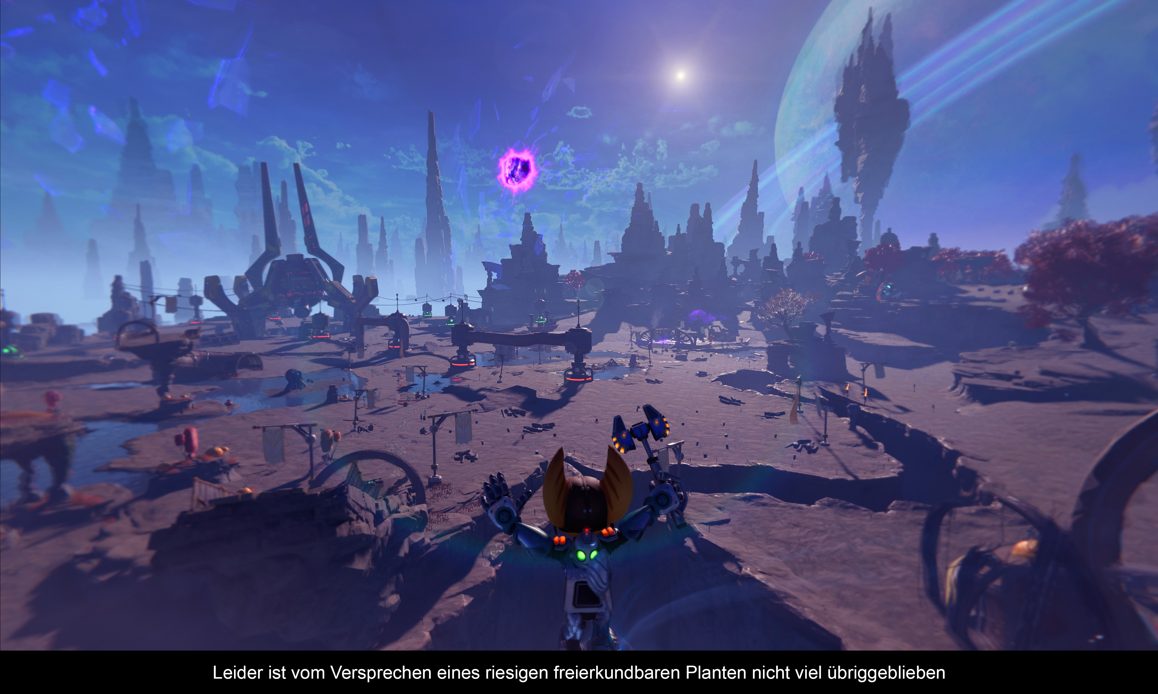 „Rift Apart“ ist für ein Ratchet & Clank Spiel sehr geradlinig. Weder gibt es viele alternativen Wege, um ein Level zu beenden, noch speziell entworfene Herausforderungsmonde wie im Vorgänger. Das was jedoch da ist, wurde durchdacht umgesetzt. Jeder Level bietet eine Nebenmission die es zu meistern gilt. Einmal muss man Früchte sammeln, ein anderes Mal eine Fabrik infiltrieren. Auch gibt es mit Glitch einen kleinen Roboter, mit dem man in Kampfarenen interdimensionale Viren besiegen darf. Vor Veröffentlichung wurde als Highlight auch ein Planet mit großer offener Spielwelt angekündigt. Beim ersten Besuch stampft hier noch ein riesiger Roboter durch die Gegend, was Erinnerungen an den Anfang von „Restistance 2“ (Anm. der Red.: Da bist du aber wohl der Einzige) hervorruft. Danach kann man den Planeten frei erkunden. Jedoch gibt es nicht besonders viel zu entdecken, nur ein paar Orbs von einem Lombax, der von unterschiedlichen Dimensionsreisen berichtet. Diese sind recht unterhaltsam, da sich der Lombax in andere Sony Spiele Dimensionen verirrt hat. Natürlich gibt es noch weitere Planeten, sowie die übliche Kampfarena, in der man wellenweise Gegner Ausschalten darf. Und die Suche nach den goldenen Schrauben. Diese Aktivieren wiederrum allerlei Cheats. Zum Beispiel das alle Gegner einen großen Kopf haben, oder das alle Schrauben als Rubine angezeigt werden. Geübte Spieler können in einem Durchgang alles abarbeiten und sogar die Platinum Trophäe freischalten. Der Wiederspielwert hält sich somit in Grenzen.