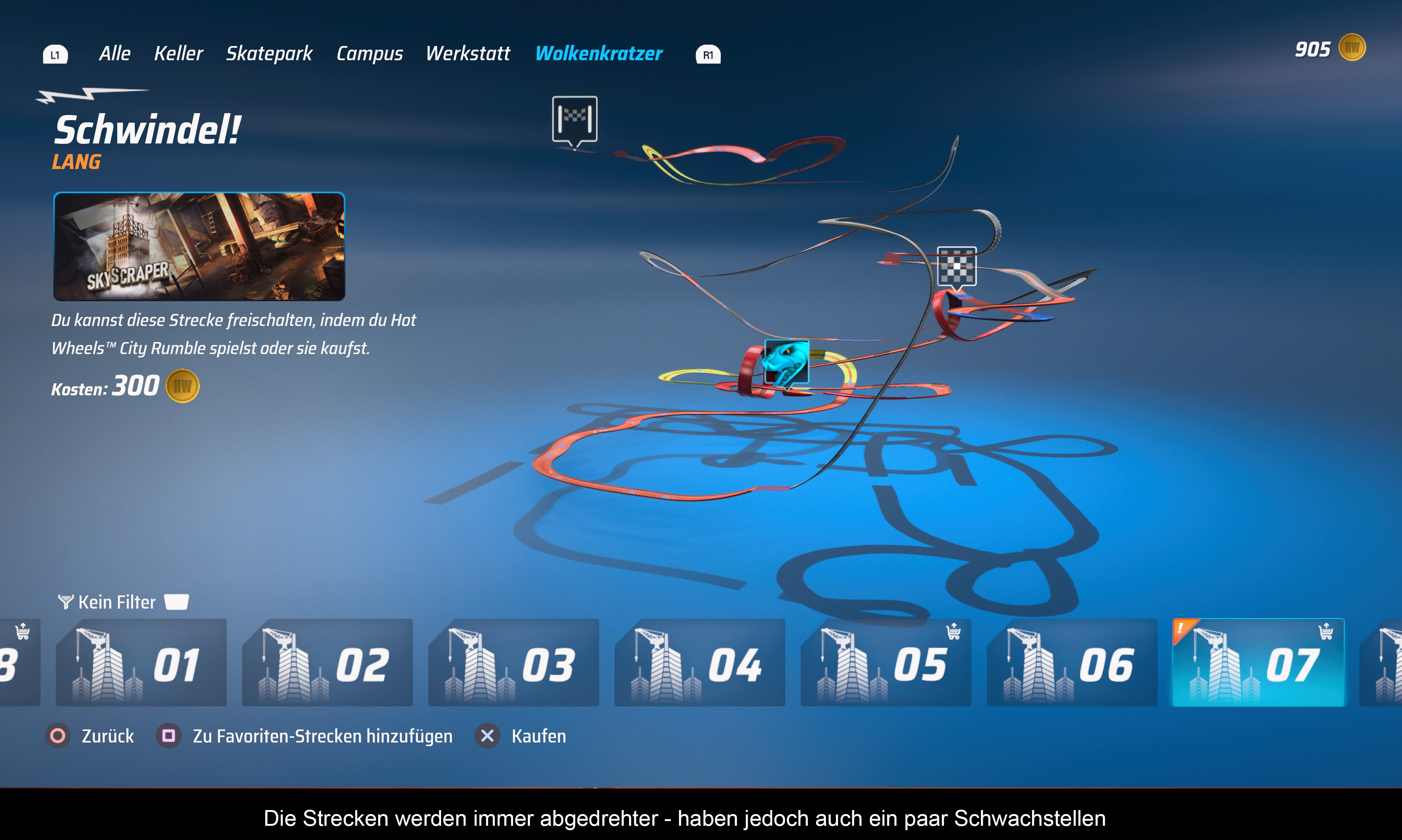 In „Hot Wheels Unleashed“ existieren zwei Spielwährungen. Zum einen gibt es Zahnräder, die man zum Tunen des Wägelchens braucht (200 oder 500 Stück). Gewinnen kann man diese in den Kampagnenrennen, oder wenn man Hot Wheels Autos verschrottet. Die zweite Währung sind goldene Münzen. Damit kann man neben spezifischen Hot Wheels (kosten auch mal 1200 Münzen; die Auswahl rotiert alle paar Stunden) für jeweils 500 Taler Überraschungsboxen kaufen. Da ist dann natürlich ein Hot Wheel drin, dass man entweder schon hat, oder nicht. Doppelte Fahrzeuge kann man wie bereits geschildert verschrotten, oder man verkauft es für 300 Münzen. Manchmal bekommt man in der Kampagne auch Autos bzw. Überraschungsboxen geschenkt. Ebenso gewinnt man ein paar Münzen bei Rennen. Aber da braucht es schon eine Handvoll gewonnener Events, damit man sich eine Überraschungsbox leisten kann. Alternativ kann man auch z.B. über das „schnelle Rennen“, Münzen gewinnen, da gibt es 50 Stück pro Sieg – also muss man 10 Rennen fahren, damit man wenigstens eine Box kaufen kann. Nach der Hälfte des Spiels hatte ich gerade einmal 1/3 der Hot Wheels freigeschaltet. Wie ich die Sammlung komplettieren soll, ohne endlos in den „schnellen Rennen“ zu grinden – keine Ahnung!