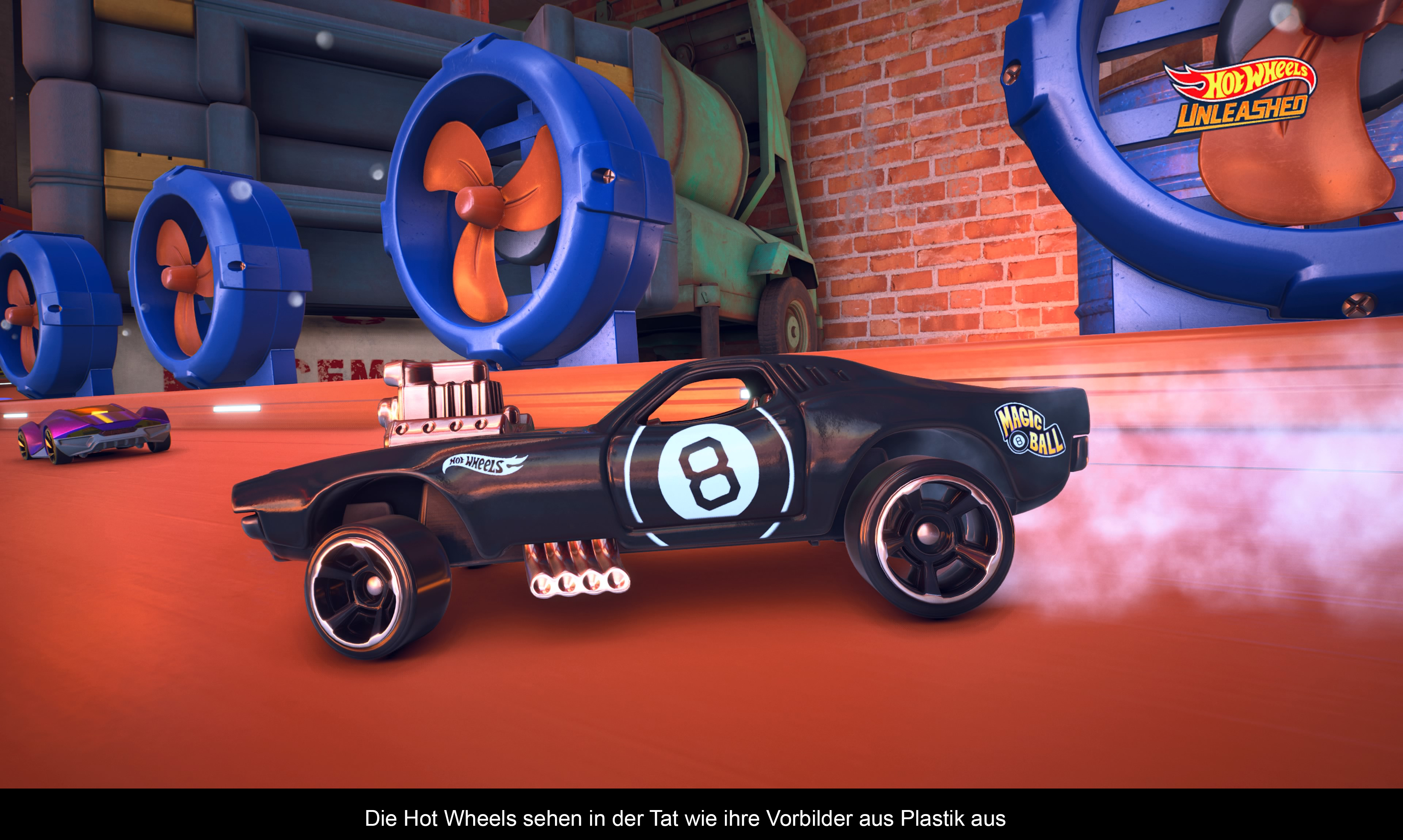 Das visuelle Design fängt den markanten Hot Wheels Look gut ein. Die Autos sehen wirklich haargenau so aus, wie ihre Spielzeugvorbilder. Die Proportionen stimmen, die Materialanmutung passt und die vielen Details (u.a. unterschiedliche Lackfarben) stehen den Boliden gut zu Gesicht. Streiten kann man sich über die Fahrzeugwahl – neben unzähligen Fantasy-Autos gibt es auch ein paar lizenzierte Modelle und diverse aus Film und Fernsehen bekannte Mobile wie den Turtles-Wagen. Am Ende kann man es natürlich nicht jedem recht machen, aber bei der riesigen Auswahl an Hot Wheels Vorbildern, hätten es schon mehr als 80 Autos sein können. Vor allem wenn man sich die „Überraschungsmechaniken“ im Spiel vor Augen führt. Auch hilft es nicht, dass schon mehrere (!) Season Pässe angekündigt wurden. Aber zurück zur Grafik: Die Streckenbauteile glänzen mit hübschen Reflektionen und Lichteffekten, die Umgebungen fallen dagegen trist und langweilig aus. Es gibt keine grünen Landschaften, keine coolen Wohnungszimmer oder eine Spielzeug-Hot Wheels Stadt. Garage, Baustelle, Skatepark, Uni und Keller sind eben nicht gerade spektakulär und ähneln sich auch noch. Immerhin sind die Ladezeiten kurz und die Framerate läuft flüssig über den Schirm. Was jedoch ein regelrechter Griff ins Klo ist: Der Soundtrack – gefühlt fünf ähnlich klingelnde Jingles wechseln sich im Minutentakt ab – sowas Nerviges mussten meine Ohren schon lange nicht mehr ertragen. Der Rest ist auch nur Durchschnitt – vor allem die Motorengeräusche wubbern überhaupt nicht und klingen eher wie Staubsauger.