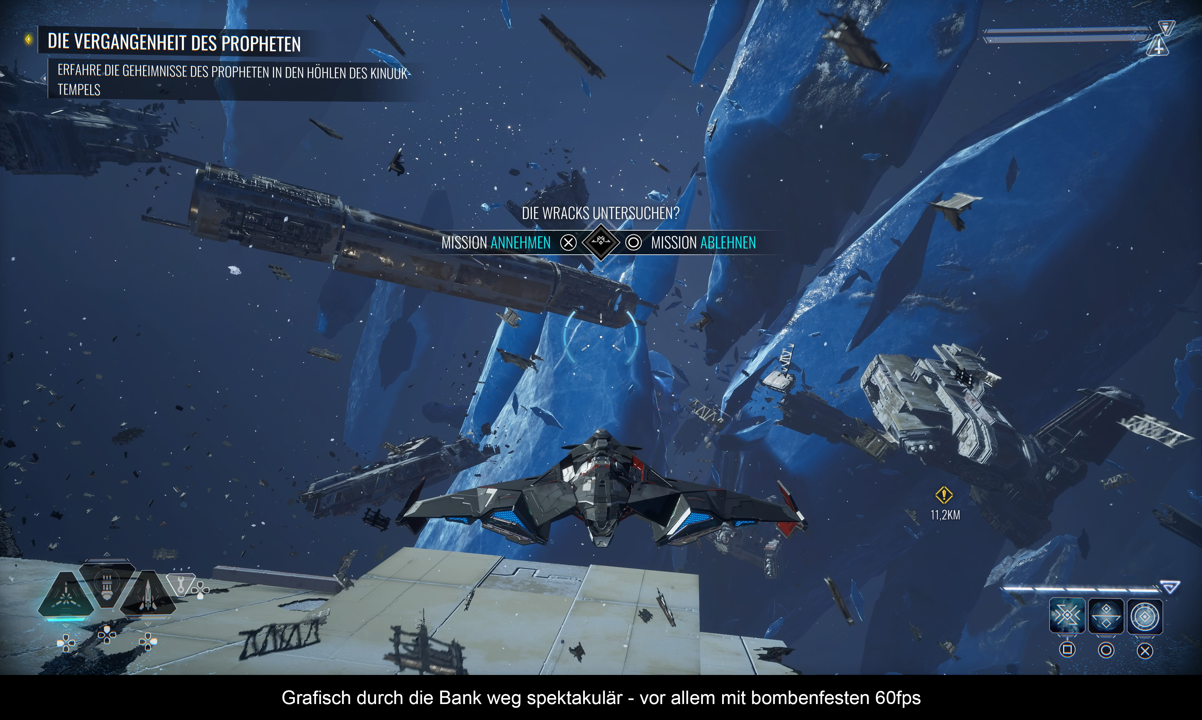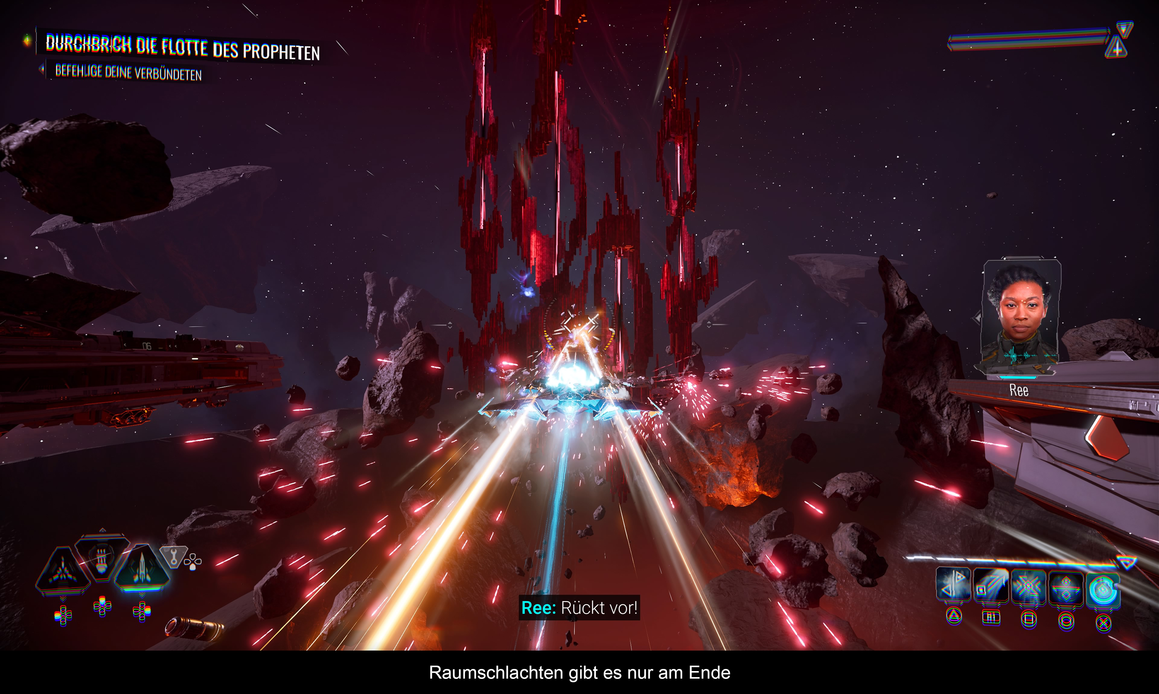 Die Steuerung orientiert sich klar an Ego-Shooter, oder besser gesagt: An den Flugmissionen von „Call of Duty: Infinite Warfare“. Mit allen Vor-und Nachteilen. Auf der einen Seite, sieht man hier wenigstens sein Schiff von hinten (es gibt keine Ego-Perspektive), auf der anderen Seite ist das größte Problem das Bremsen, denn das geht nur via linkem Stick und dauert zu lange, wenn man gerade boostet und driftet. Deshalb passiert es vor allem in Höhlen oder riesigen Raumschiffen, dass man irgendwo unfreiwillig dagegen knallt – was oft auch dem Ableben gleichkommt. Das Driften (L1) soll zwar schnelle Wendungen ermöglichen, aber die Wahl der Taste ist dafür eher unglücklich. Schließlich nutzt man L2 für den Nachbrenner. Mit dem rechten Stick kontrolliert man die Blickrichtung, während R2 dazu dient, die Waffe abzufeuern. Davon gibt es drei Typen: Gatling, Laser und Raketen. Verschiedene Gegner verlangen nach unterschiedlichen Taktiken: Laser sind gut für Schilde, Raketen dezimieren gelbe Panzerung und Gatling-Kanonen feuern vor allem schnell hintereinander. Später erlernt man diverse spirituelle Rituale, welche zusätzliche Fertigkeiten mit sich bringen. Vor allem wertvoll: Das Ritual des Sturms, mit dem man Feinde zum Trudeln bringt und deren Schilde ausschaltet. Daraufhin geben sie perfekte Ziele ab. Interessant ist sicherlich auch das Ritual der Jagd, bei dem man schnell an ein Ziel heranspringt, um es dann durch das Ritual des Sterns (Energiespeer) zu zerstören. Die letzte Kraft (Ritual der Kontrolle) bekommt man für meinen Geschmack zu spät, um damit noch sinnvoll was anstellen zu können. Ansonsten nutzt Nara ihre übersinnlichen Fähigkeiten auch zum Scannen der Umgebung (um wichtige Punkte aufzudecken) und zum Erleben von Weltraum-Erinnerungen.