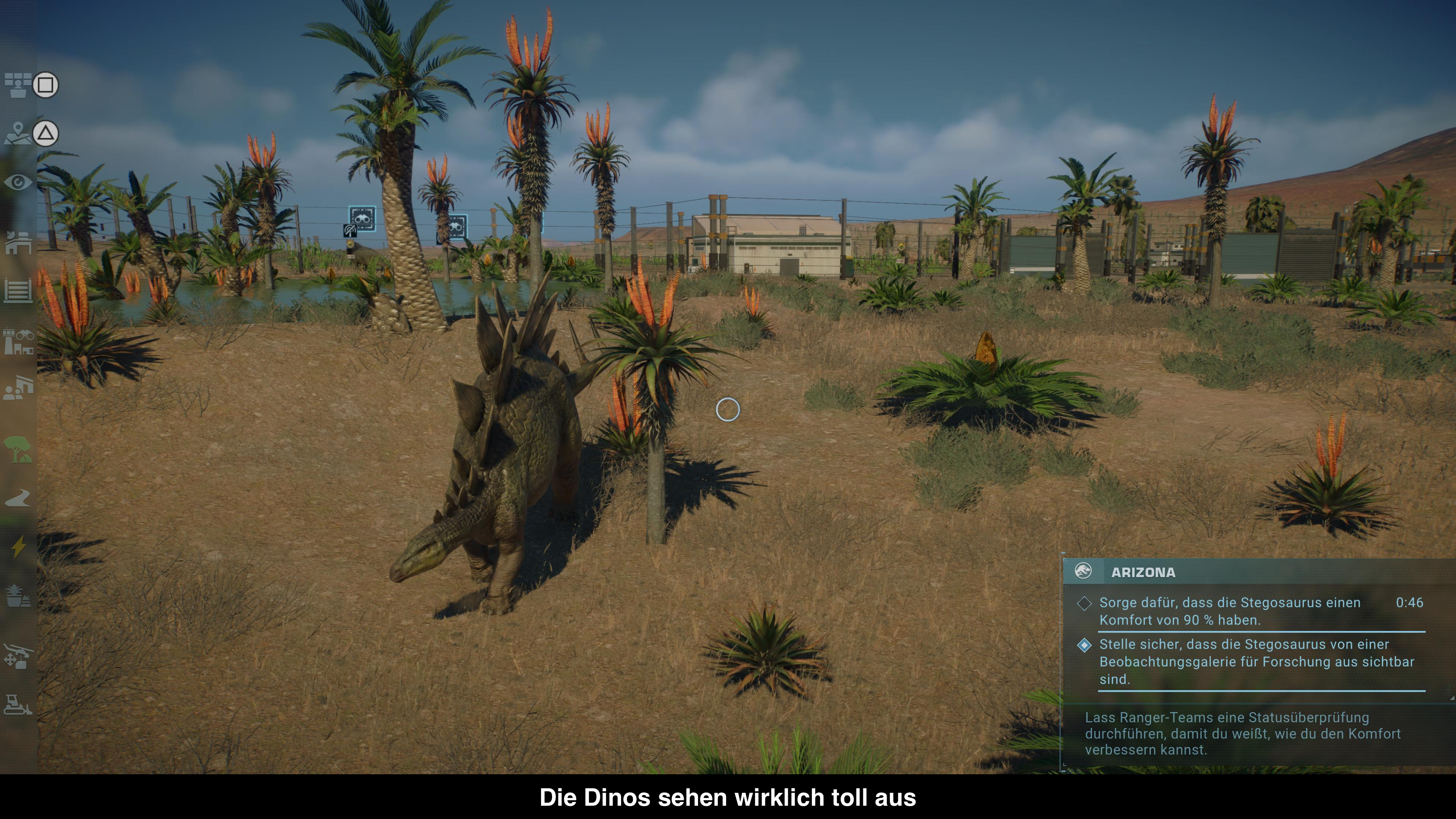 Für ein Aufbau-Spiel bietet Jurassic World Evolution 2 erstaunlich detaillierte Modelle, wenn man nah heranzoomt. Insbesondere Saurier sehen wirklich toll aus und haben auch eine Unmenge an Animationen. Sie raufen sich, sie gehen auf die Jagd, sie schlafen und noch vieles mehr. Ich habe mich immer wieder dabei erwischt den Sauriern einfach beim Leben zuzusehen, weil dies so authentisch wirkt. Es gibt aber auch ein paar weniger schöne Seiten. Darunter fallen vor allem die Schatten, die je nach Zoom-Grad sichtbar sind oder verschwinden und wenn man sich auf der Karte bewegt, sieht man genau die Kante an der die Schatten gerendert werden. Zu Beginn stört das, doch gewöhnt man sich irgendwann daran. Ansonsten ist das Spiel schön ausgefallen und die unterschiedlichen Umgebungen, Wetterbedingungen und auch Tageszeiten sind gut umgesetzt. Dabei läuft das Spiel auf der PS5 zwar theoretisch mit 60 Bildern pro Sekunde, aber es gibt durchaus mal Ruckler. Wirklich störend sind diese aber nicht.