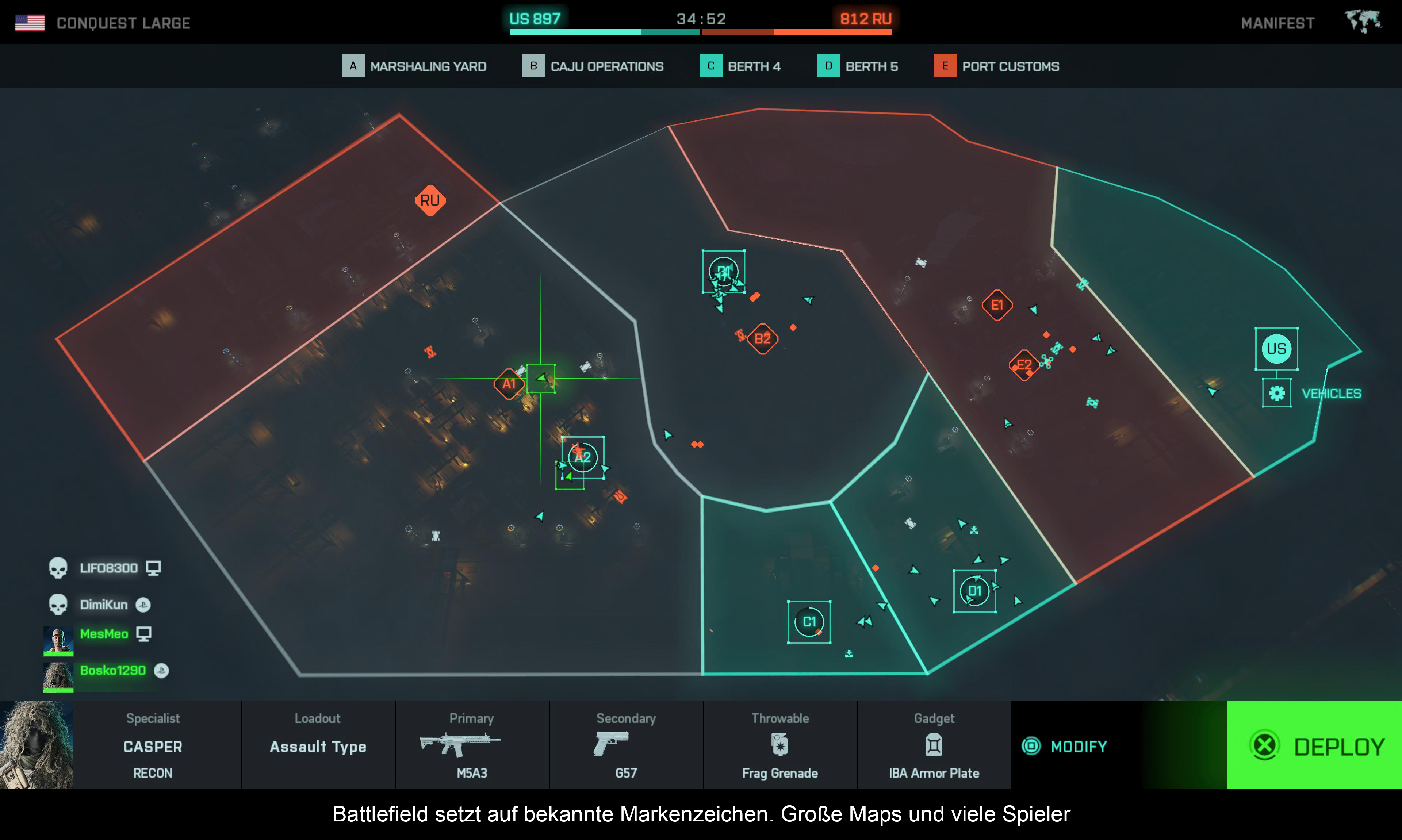 Abgerundet wird das Gameplay-Trio schließlich durch den Hazard Zone-Modus, wo es nicht um epische Schlachten geht, sondern um koordinierte Zusammenarbeit innerhalb einer überschaubaren Gruppe. Insgesamt begeben sich 32 Spieler, aufgeteilt in 4er Gruppen, in ein Gebiet, wo es darum geht, verschiedene Datenträger zu extrahieren. Bei der Suche nach diesen Datenträgern werdet ihr aber nicht nur von den anderen Zockern gejagt, sondern auch von Bots. Bevor es jedoch in den Kampf geht, muss man sich ganz im Stile von Counter-Strike erstmal das Equipment zusammenkaufen, welches man durch die Hazard Zone exklusive Währung erhält. Dementsprechend dürfte es jetzt auch keinen überraschen, dass man sich weiteres Guthaben durch das erfolgreiche Meistern von Mission erarbeitet. Je mehr Zeit man in Hazard Zone investiert, desto mehr offenbaren sich im Laufe der Zeit zahlreiche Möglichkeiten, wie man am Besten sein Ziel erreicht. Die vielen Einstellungsmöglichkeiten können einen anfangs etwas überfordern, aber mit der Zeit wird man immer routinierter. Dennoch bringt die beste Ausrüstung nichts, wenn innerhalb der Gruppe keine Einigkeit herrscht. Dies wird unter anderem dadurch kontrolliert, dass jeder Spieler nur einen Spezialisten auswählen kann. Dadurch wird vermieden, dass zum Beispiel vier Sniper auf einmal in den Kampf gehen. Der Rest hängt dann natürlich davon ob, was man für Spieler zugeordnet bekommen hat. Insbesondere das es kein Voice-Chat-Support innerhalb der Missionen gibt. Aber während meiner Testphase hatte ich eigentlich jederzeit nur gute Zocker an meiner Seite, die absolut Bescheid wussten, wie man in diesem Modus agiert und wo es lang geht.