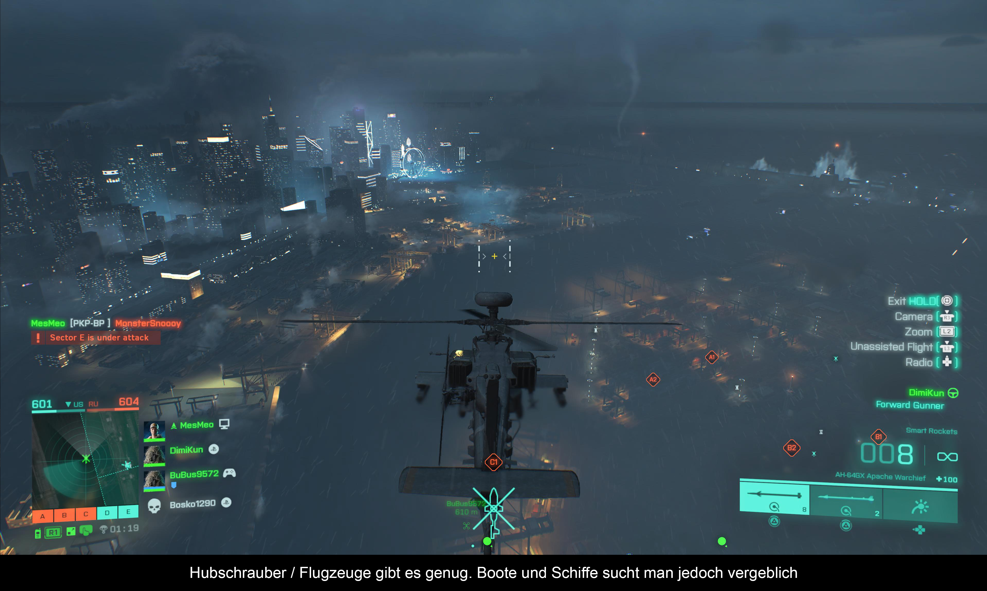 Wie bei vielen anderen Spiele derzeit, handelt es sich auch bei Battlefield 2042 um ein Cross Gen Titel, welches sowohl für PS4 als auch für PS5 veröffentlicht wurde. Dennoch muss ich zugeben, dass die PS5 Variante recht hübsch aussieht und dank (fast immer ruckelfreien) 60 FPS auch ziemlich flüssig läuft. Das Spiel zeigt vor allem seine Stärken, wenn große Gegnermengen aufeinander stoßen, und die Umgebung von Explosionen, Schüssen und mitunter auch gewaltigen Naturkatastrophen erschüttert wird. Diese Momente überzeugen und zeigen, was die Frostbite Engine alles drauf hat. Das Gegenteil sind jedoch die zahlreichen langweiligen Lauf-Passagen über weitläufige Maps, wo nicht viel passiert. Hier kann man zumindest die gute Weitsicht loben, die es einem je nach Standort erlaubt, große Teil der Map überblicken zu können. Außerdem müssen PS5 Zocker auch bei EAs neuestem Next-Gen Titel auf Ray-Tracing verzichten. Dennoch sehen Reflektionen und Texturen größtenteils ordentlich aus. Wo die Geschmäcker am Ende vielleicht etwas auseinander gehen, sind die einzelnen Maps, die aufgrund ihrer Struktur manchmal etwas langweilig und steril daherkommen. Große Metropolen oder kompakte Militärbasen hat man beispielsweise schon in vielen anderen Spielen gesehen, und reißen jetzt auch keinem mehr vom Hocker. Auch fiel mir auf, dass die Umgebung nicht mehr so leicht zerstörbar ist, wie in anderen Teilen. Was den Sound angeht, gibt es so gut wie nichts zu beanstanden. Explosionen und Wettereffekte wirken realistisch. Lediglich die Musik, die ab und zu mal eingespielt wird, ist kaum der Rede wert.