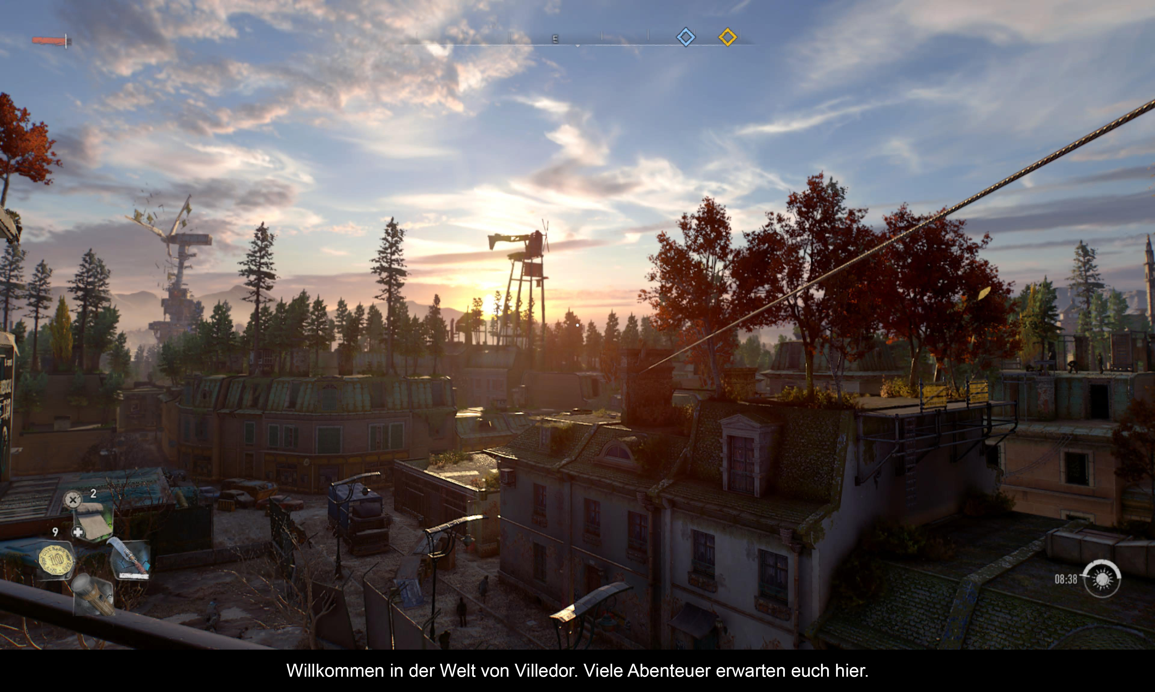 Was den grafischen Aspekt von Dying Light 2 angeht, wird man erstmal vor der Entscheidung gestellt, welchen Modus man aktivieren möchte. Während der Quality-Modus mit Ray Tracing und besseren Schatten- als auch Licht-Effekten für sich wirbt, läuft das Spiel hier leider nur mit 30 FPS und 1080p. Wer es hingegen gestochen scharf mag, kann auch den Resolution-Modus auswählen, wo es zwar kein Ray Tracing gibt, aber stattdessen immerhin eine anständige Auflösung von 4K. Aber auch hier muss man sich mit 30 FPS begnügen. Als Alternative gibt es auch noch einen Performance-Mode, den ich persönlich am Besten fand. Hier gibt es zwar Abzüge bei der Auflösung, aber immerhin läuft das Spiel durchgehend mit stabilen 60 FPS, was vor allem die Parkour-Läufe deutlich flüssiger gestaltet. Und auch mit den Abstrichen in der Auflösung sieht das Spiel immer noch ziemlich gut aus. Die Farbpalette mag zwar manchen eventuell etwas zu eintönig sein, aber was die Bauwerke und Gebäude von Villedor angeht, bietet das Spiel eine durchaus beeindruckende und imposante Stadtkulisse. Man merkt an jeder Stelle, dass viele Jahre nach dem Ausbruch sowohl die Natur als Zombies den Kampf gegen die Menschheit klar gewonnen haben. Aber auch die Animationen können sich sehen lassen. Vor allem die Parkour-Runs, die einen wesentlichen Bestandteil des Spiels ausmachen, sind äußerst agil und mit einem guten Momentum versehen. Etwas unverständlich fand ich jedoch die träge Hauptmenü, wo das Wechseln einer Seite nur mit etwas Verzögerung durchgeführt wird. Sowas darf es in einem Spiel dieser Größe eigentlich nicht gebebn. Abschließend möchte ich auch noch auf die akustische Untermalung von Dying Light 2 eingehen, die ihren ihren Job definitiv erfüllt. Während die Hintergrundmusik absolut zur dystopischen Stimmung passt, erfüllen sämtliche Synchronsprecher ihrer Aufgabe mit vollster Überzeugung. Kaum eine Performance wirkt unmotiviert oder lieblos. Ein großes Lob verdienen auch die Zombie-Geräusche, die vor allem mit dem Pulse-Headset von Sony äußerst bedrohlich klingen.