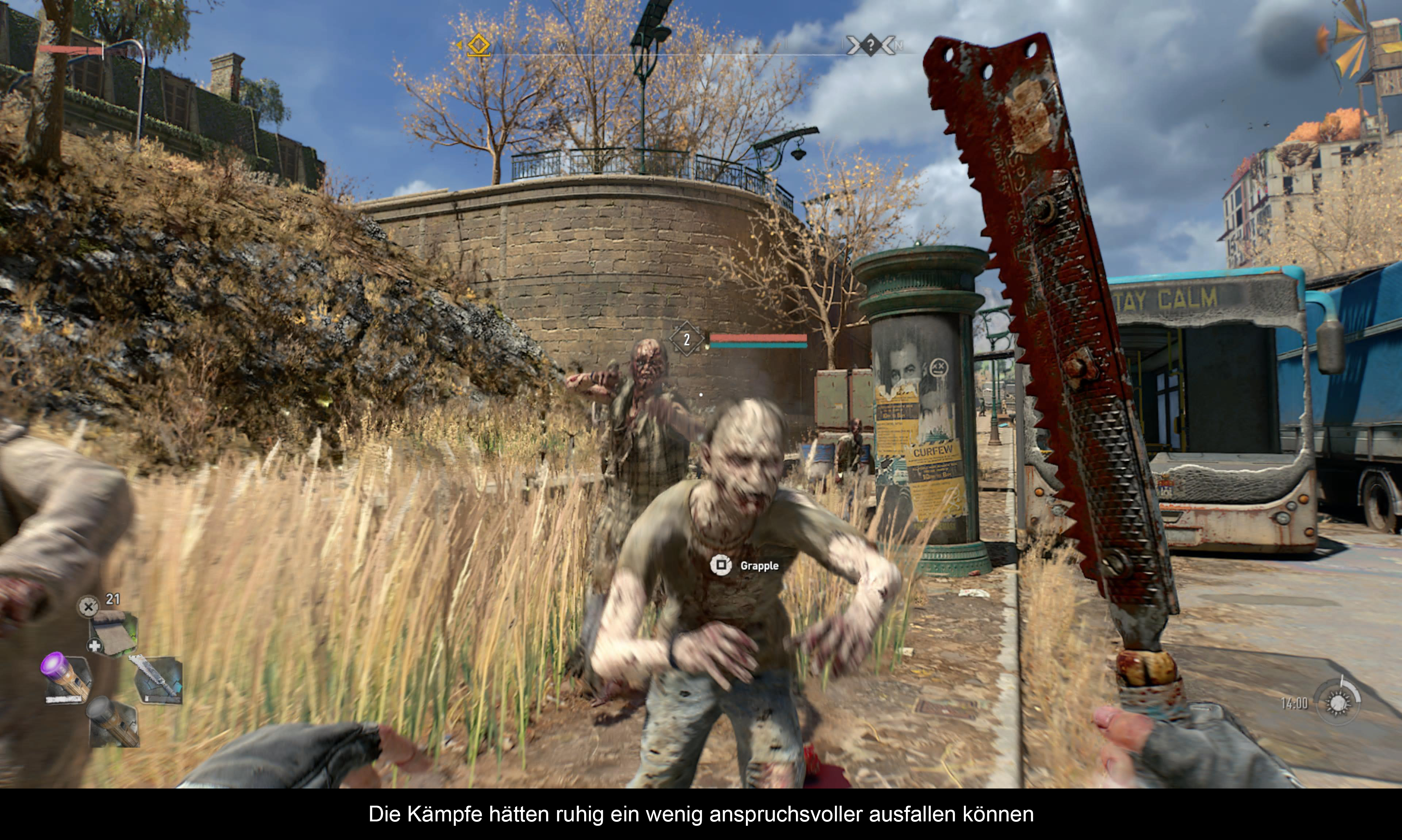 Was das Kampfsystem angeht, muss man sich jedoch trotz des umfangreichen Skill-Trees eingestehen, dass es relativ simpel gehalten wurde, und enorm an den Skyrim erinnert, wo simples Eindreschen ebenfalls oft genügte, um die Gegner nieder zu ringen. Eine gewisse Schärfe bekommt das Gameplay jedoch durch die Rückkehr des Tag- und Nachtsystems, welches direkte Auswirkungen auf das Verhalten der Zombies hat. Während sie tagsüber eher gemächlich durch die Gegend laufen und kaum eine Gefahr darstellen, kann die Begegnung im Laufe der Nacht sehr schnell tödlich enden, weil die Untoten hier deutlich aggressiver agieren. Trifft man zum Beispiel auch noch auf einen Screamer, kann es sehr schnell zu einer Jagd auf euch kommen, wo euch die Zombies nicht nur auf den Straßen hinterherlaufen, sondern auch auf den Dächern, die tagsüber nicht von den Monstern benutzt werden. In bester GTA Manier gibt es sogar eine Bedrohungsanzeige, die euch zeigt, wie viele Monster gerade hinter euch her sind. Und da ein Kampf hier so gut wie aussichtslos ist, empfiehlt es sich mit den Parkour-Skills zum nächst gelegenen Schutzraum zu laufen, wo lebensrettendes UV-Licht die Monster jederzeit vom Eindringen abhält. Das besondere an diesen nächtlichen Exkursionen ist jedoch die Tatsache, dass man für sämtliche Aktionen einen EXP-Bonus bekommt. Darüber hinaus sind auch einzelne Missionen nur im Laufe der Abendstunden erreichbar. Dying Light 2 bietet dem Zocker eine riesige Spiele-Welt, die in seiner Größe fast seines Gleichen sucht. Was mir jedoch gefallen hat, war die Variation bei der Umgebungsgestaltung. Egal, ob zerstörte Ruinen in Außenbezirken oder gigantische Fassaden im Stadtinnern - es gibt viel fürs Auge und viel zu entdecken. Was mir dabei gefallen hat, war die Tatsache, dass neue Missionen auf unterschiedliche Art und Weise aufgedeckt werden. Entweder durch NPCs, die überall herumstehen, oder durch eigenes Erkunden oder durch das Besteigen von hohen Gebäuden, wo man im Bester Assassins Creed Manier mit Hilfe seines Fernglases neue Missionsziele offenlegen kann.