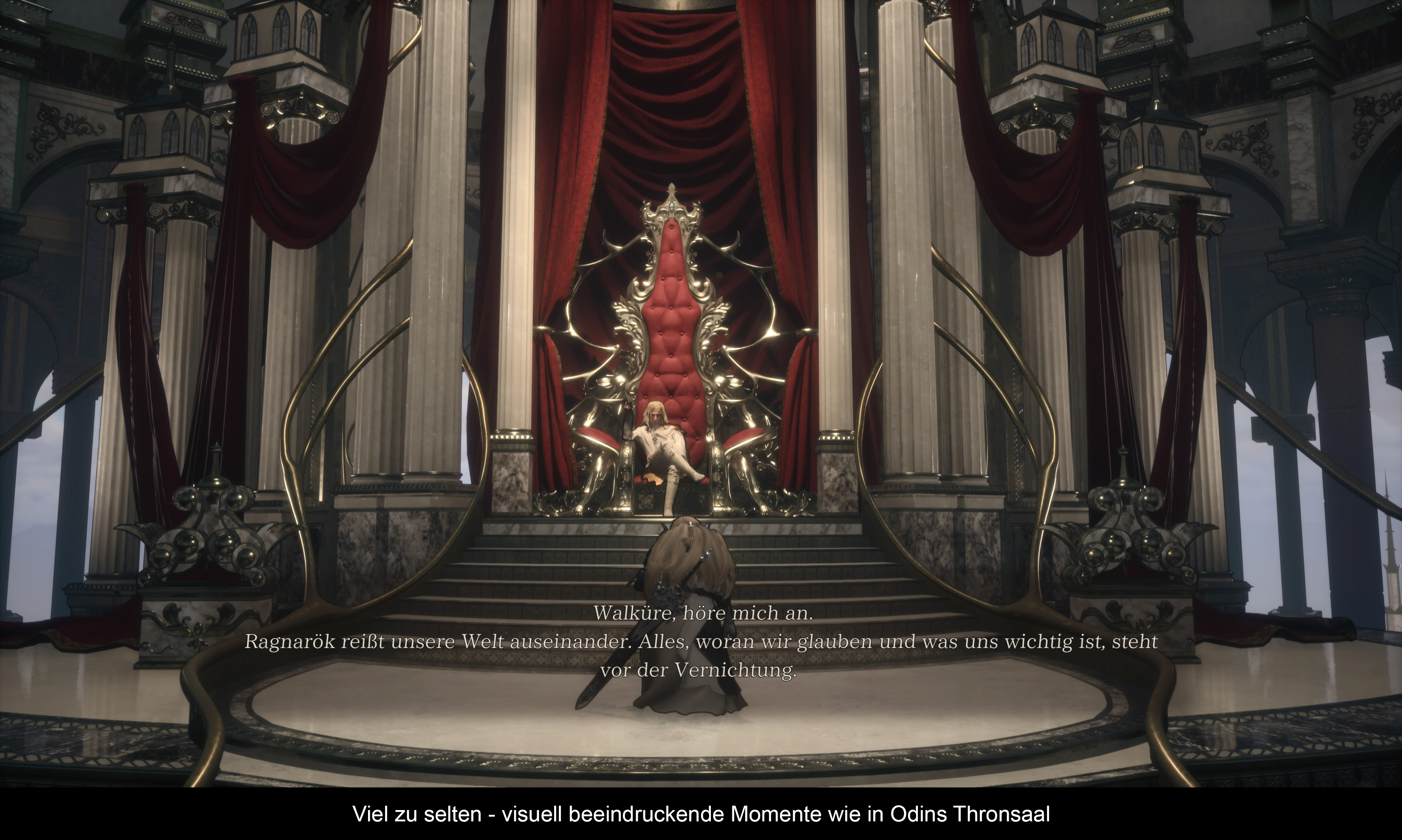 Komplex wird die Steuerung dabei zum Glück nicht: X ist zum Springen da, Kreis zum Ausweichen, Viereck zum Schlagen und Dreieck für einen Hieb. L1 ist zum Blocken da, L2 zum Ranspringen an den Gegner und Reden, R1 ruft über ein Auswahlmenü die Einherier zur Hilfe und R2 aktiviert die Zauber. Jeder Level wird zum Schluss bewertet und man kann Ränge inklusive Belohnungen erhalten. Rätsel gibt es übrigens keine, die großen Umgebungen sind dafür weitläufig und mit zahlreichen Checkpoints versehen. Auch sind die „Kapitel“ wiederholbar (um zum Beispiel weitere Seelensteine zu sammeln oder seine Wertung zu verbessern). In Asgard erstattet man Odin (regelrecht fesch gekleidet) Bericht und kann auch zahlreiche Nebenaufträge erledigen. Diese sind kurz und knackig und bringen zusätzliche Runen für Waffen und andere Sachen ein. Auch kann man die Geschichte der Einherier erforschen. Leider wird gerade das recht lieblos präsentiert. Am ehesten lässt sich das Spielgeschehen mit „Ys: The Lacrimosa of Dana“ vergleichen – wem das gefallen hat, wird auch hier seine Freude haben. Allerdings dauert diese nicht sonderlich lange an – rund 15 Stunden benötigt man bis man die verschiedenen Enden gesehen hat. Dabei stehen drei Schwierigkeitsgrade zur Auswahl, die jedoch nicht jederzeit im Spiel gewechselt werden können. Zum kompletten Leveln der Waffen und damit verbunden, den Fertigkeiten der Walküre, braucht man mehr als einen Durchlauf. Gleiches gilt auch für die Platin-Trophäe. Ein New Game Plus gibt es aktuell noch nicht, man startet am Ende immer vor dem letzten Kapitel. Aber zumindest soll es im November ein Update geben, das neben weiteren Schwierigkeitsgraden auch noch einen neuen Spielmodus namens „Hilde's Rache“ und mehr beinhalten soll.