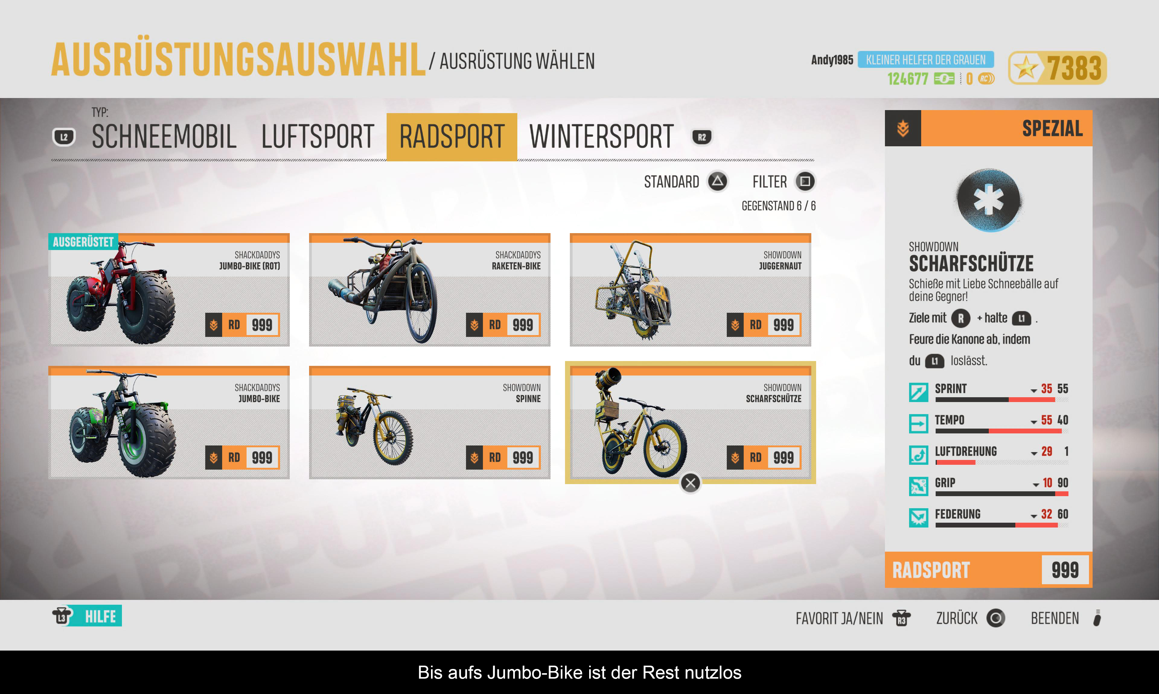 Im Großen und Ganzen blieb der Season Pass doch sehr ernüchternd. Die neuen „Spielzeuge“ wie das Jumbo-Bike und das Freestyle Schneemobil sind schon lustig und bringen Abwechslung in den Alltag. Die Raketen-Ski und das Bike sind nett, aber nutzlos. Tja und die drei Showdown Fahrzeuge kann man getrost in die Tonne treten. Zumindest hat das BMX Gameplay nicht enttäuscht um man fühlt sich schnell an alte Tony Hawks – nee wartet – Dave Mirra Zeiten erinnert, leider ohne dessen Finesse. Im Großen und Ganzen fällt der gesamte Season Pass sehr mager und ernüchternd aus. Als Erstkäufer fühlt man sich leicht verarscht, da viele der interessanten Neuerungen gratis in der Season enthalten waren. Da nun der Pass wesentlich günstiger zu haben ist und man nun weiß, was drinnen steckt, lohnt es sich wohl nur für Freunde des BMX-Rades.