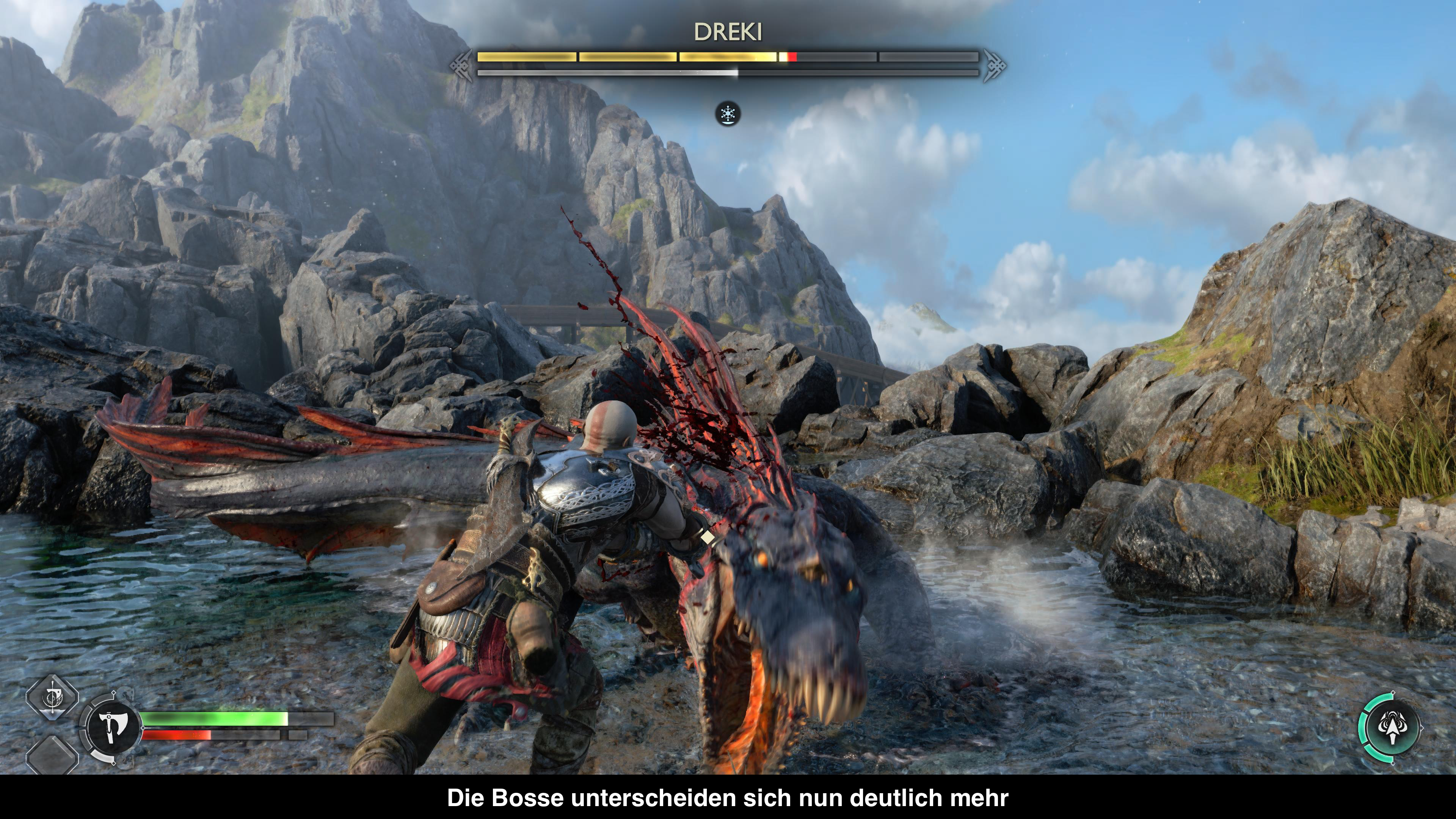 Im Vorgänger hat man viel Zeit in Midgard verbracht, was als Hub und eine Mini Open World zur Verfügung stand. Das ist immer noch der Fall in Midgard, aber man verbringt nun auch deutlich mehr Zeit in den anderen Welten und auch diese sind nun deutlich offener und bieten ein paar Nebenaufgaben. Ansonsten läuft man in diesen halbwegs offenen Gebieten trotzdem recht linear durch die Welt um der Geschichte zu folgen und darf kleinere, sehr simple Puzzle lösen, den Charakteren beim Quatschen zuhören und natürlich immer wieder gegen Gegner kämpfen. DIese tauchen meist in kleinen Arenen auf, die man meist betritt, indem man sich durch einen Spalt zwängt oder einen Stein zur Seite schiebt und dort dann erstmal gefangen ist, bis alle Gegner besiegt wurden. Das Kämpfen selbst erinnert an den Vorgänger und einige der Kombos kommen auch direkt aus dem Vorgänger. Neuerdings geht alles aber etwas leichter von der Hand und die Kämpfe sind auch deutlich vertikaler geworden. Denn Kratos kann sich jetzt problemlos auf Plattformen schwingen oder von oben auf Gegner springen. Auch die Gegner sind deutlich agiler geworden und treten auch in großer Zahl auf. Da die Kamera quasi am Rücken von Kratos klebt, kann das schon sehr frustrierend werden, wenn man keine wirkliche Übersicht im Kampf hat. Dadurch sind viele der Standardkämpfe oft fordernder als die meisten Bosse in der Geschichte. Denn wenn man im Eins gegen Eins ist, funktioniert der Kampf mit der engen Kamera deutlich besser und man ist nicht nur panisch am Ausweichen.