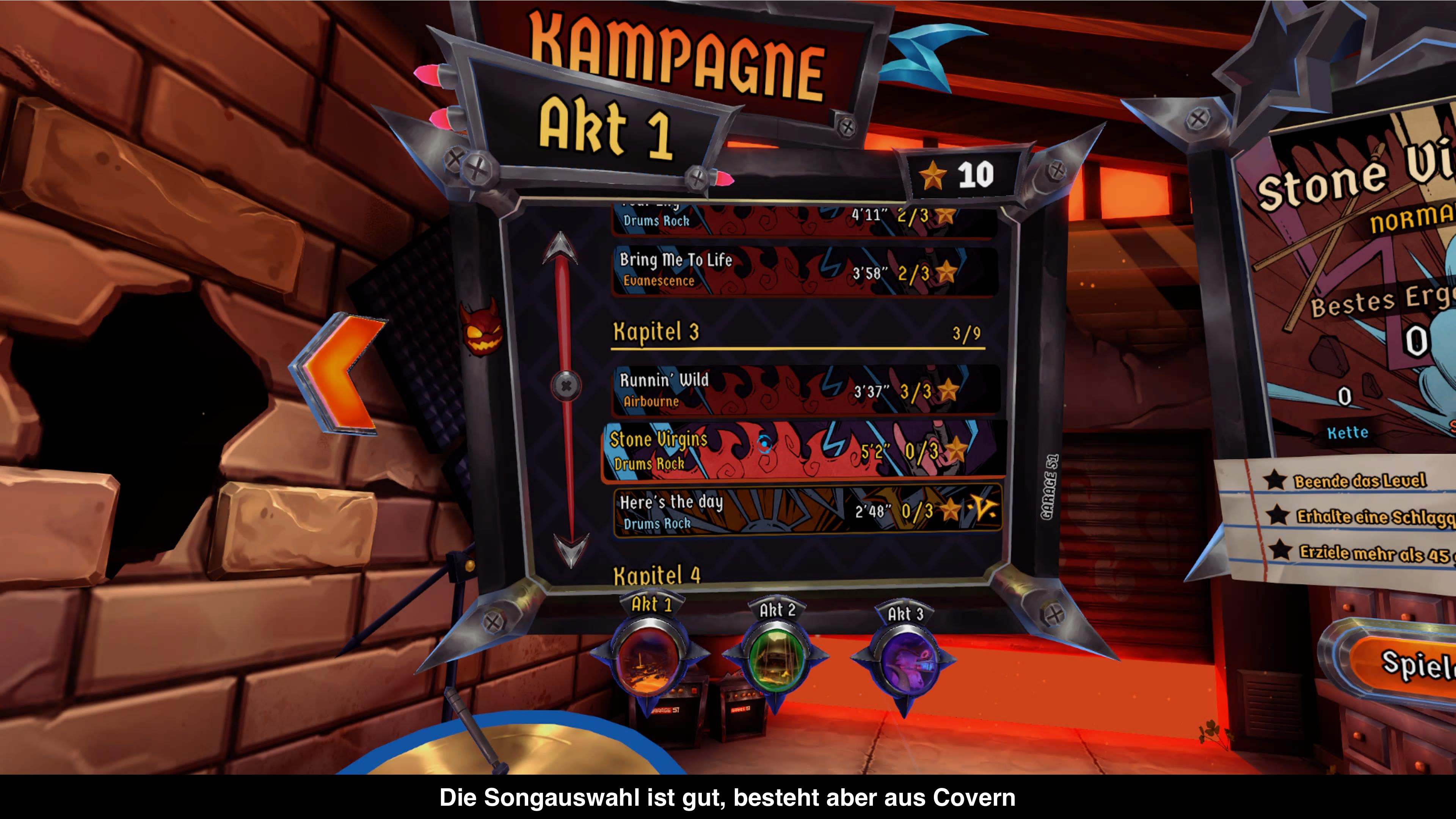 Natürlich kann man einfach seine Lieblingslieder spielen, aber für Interessierte gibt es auch eine Kampagne. Diese führt euch in drei Akten sachte durch alle Songs und pro Level gibt es auch unterschiedliche Herausforderungen. Mal soll man eine bestimmte Anzahl an perfekten Schläge erreichen oder das Level mit genügend Leben abschließen. Für jede abgeschlossene Herausforderung gibt es dann Sterne, die wiederum neue Level freischalten. Es gibt sogar Bosskämpfe, die recht nett gemacht sind.