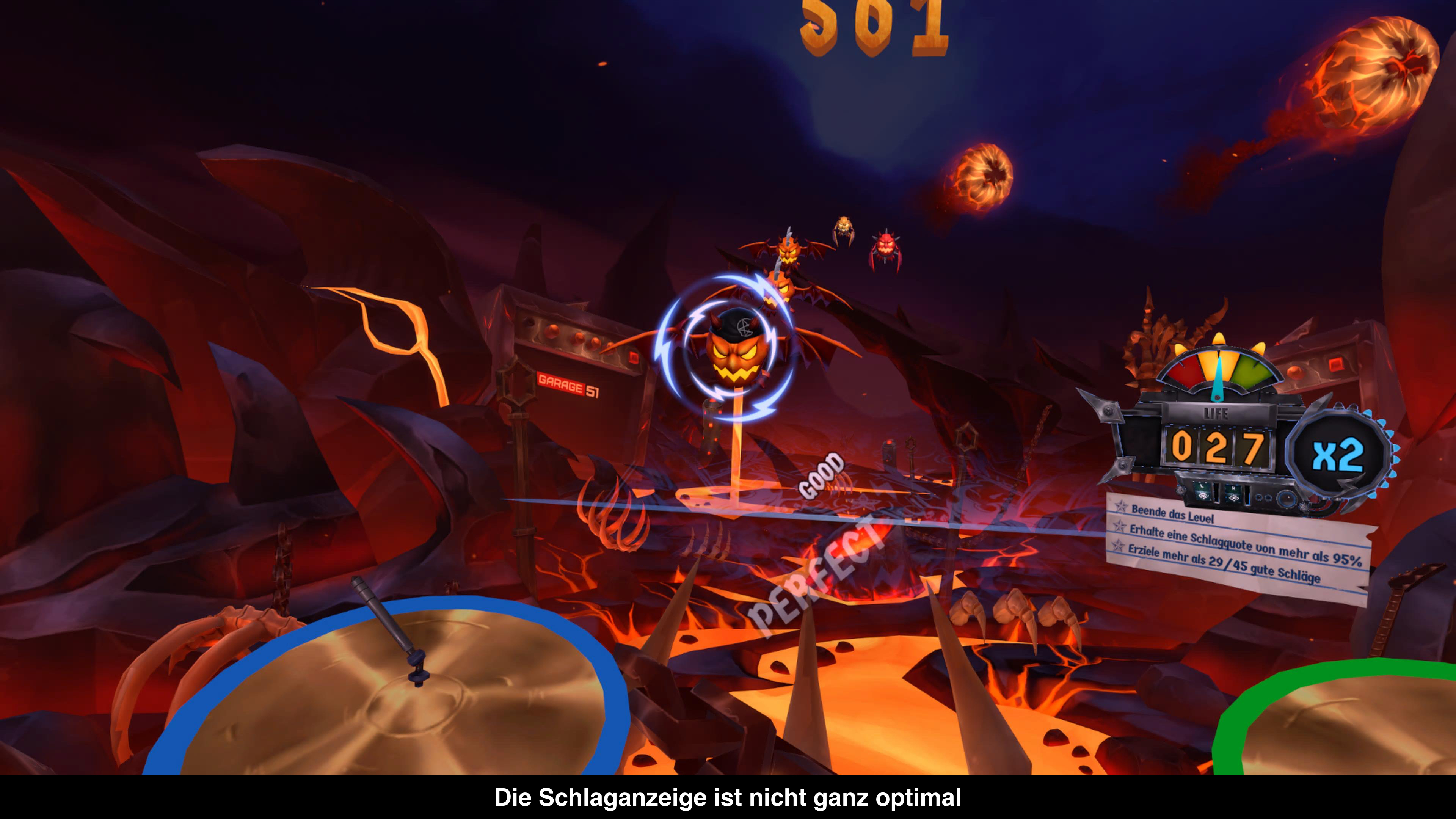 Wie Guitar Hero oder Rock Band ist Drums Rock ein Musik-Rhythmusspiel, in dem ihr natürlich ein Schlagzeug bedienen müsst. Dank virtueller Realität könnt ihr die Drumsticks kontrollieren und müsst im Takt der Musik die richtige Drum oder Snare erwischen. Besonders cool ist, dass man die Drumsticks wirklich greifen muss, was gleichzeitig heißt das ihr sie einfach in die Luft werfen könnt oder aber auf einer Drum abprallen lässt und dann wieder auffängt. Wer diese Aktion im Song integriert, kann noch mehr Punkte sammeln und sieht natürlich cool aus. Welche Drum oder Snare man treffen soll, wird im Spiel durch Dämonen angezeigt, die auf euch zufliegen und sobald sie eine gewisse Linie erreichen, könnt ihr sie mit einem Schlag aufs Schlagzeug erledigen. Welche Drum man treffen soll, wird durch unterschiedliche Farben suggeriert. Leider ist der richtige Zeitpunkt zum Schlagen durch die schräge Perspektive nicht ganz offensichtlich und wenn man nicht gerade im Rhythmus des Lieds ist, wird man manchmal vom Einsatz überrascht. Zudem hilft es nur bedingt, wenn man gelbe und orangene Dämonen unterscheiden soll für zwei Drums. Da kommt man gerne mal durcheinander.