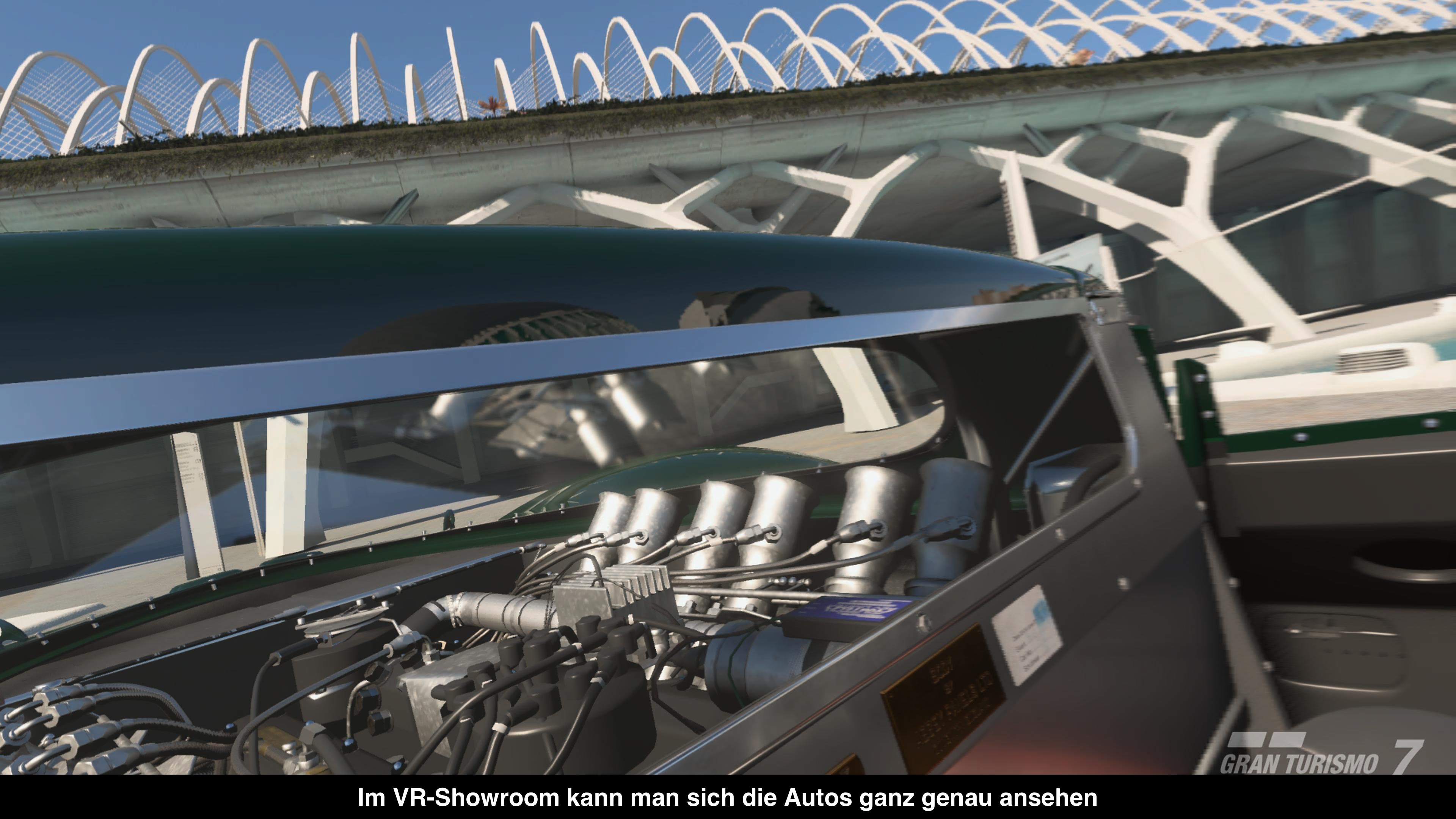 Neben den Rennen wurde aber auch der sogenannte VR-Showroom Modus hinzugefügt. In diesem könnt ihr eure eigenen Fahrzeuge in diversen Scapes bewundern. Ihr könnt dabei frei ums Auto laufen, Lichter und Blinker an- und wieder ausschalten und jedes noch so kleine Detail begutachten. Natürlich kann man sich auch in das Cockpit setzen und sich mal in Ruhe alle Tasten und Knöpfe anschauen oder je nach Auto auch mal einen Blick hinter sich werfen, um den dicken V8 Motor zu sehen.
