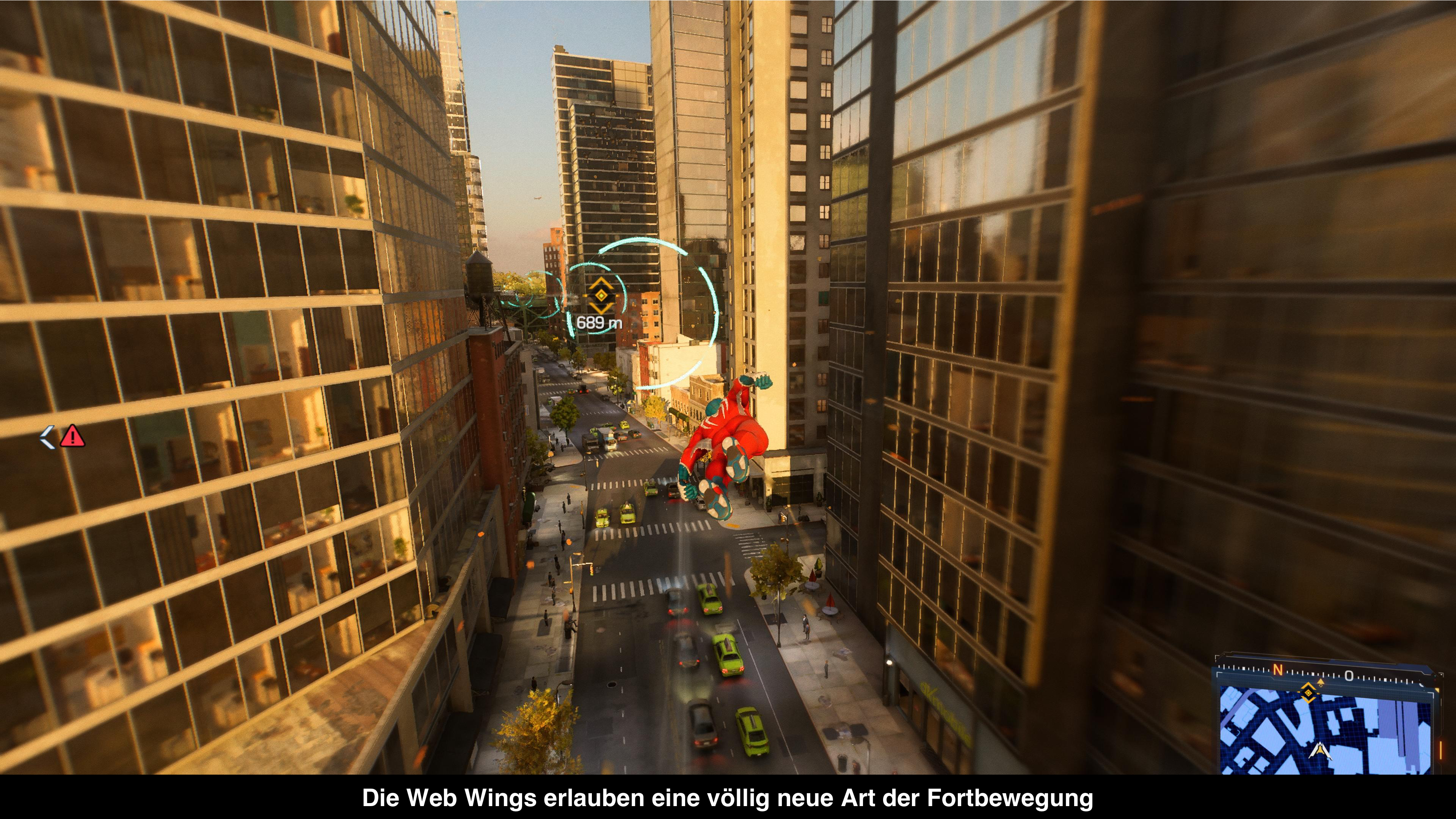 In Sachen Gameplay hat Insomniac die ein oder andere Änderung durchgeführt. Am auffälligsten sind dabei die neuen Web-Wings, die das Traversal durch die Stadt enorm verbessern. Wer kennt es nicht aus dem Vorgänger? Man schwingt voll Freude durch die Stadt, aber plötzlich kommt ein Gebiet mit niedrigeren Häusern oder gar nur Bäumen und man verliert das Momentum. Das Problem ist nun Geschichte, denn mit den Web-Wings könnt ihr nun durch die Luft gleiten und euer Momentum aufrechterhalten. Dank zahlreicher Windtunnel kann man Teile der Stadt sogar in wahnsinniger Geschwindigkeit durchqueren. Neu ist auch der Umgang mit den Gadgets im Spiel. Das “Waffenrad” aus dem Vorgänger ist Geschichte. Stattdessen kann man vier Gadgets auf die Aktionstasten legen, die dann in Kombination mit R1 genutzt werden können. Das ist simpler und unterbricht weniger den Spielfluss. Zudem kann man mit L1 und den Aktionstasten diverse besondere Fähigkeiten ausführen. Ansonsten hat sich am generellen Kampfsystem wenig verändert und die grundlegenden Combos sind die gleichen. Einzige Neuerung ist das Parieren von Angriffen. Wer im richtigen Moment L1 drückt, kann einen Angriff parieren und so direkt zum Gegenangriff übergehen. Manche Angriffe lassen sich neuerdings nur durch Parieren abwehren. Leider ist das rote Symbol recht ähnlich dem normalen roten Symbol zum Ausweichen und in der Eile des Gefechts kann man das mal übersehen. Etwas mehr farbliche Abgrenzung wäre hilfreich gewesen.