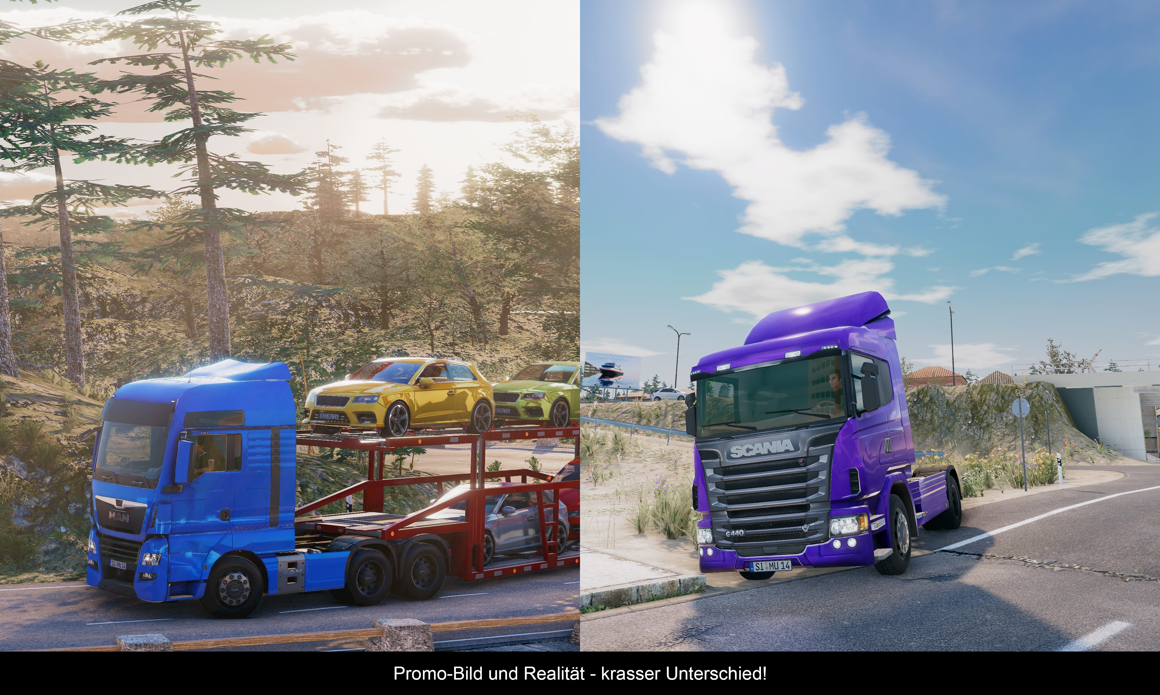 Das Spiel bezeichnet sich als Simulation (das Wort ist ja sogar im Namen enthalten), also erwartet man im Gegenzug auch Ansätze davon. Okay, die Physik der Fahrzeuge ist gelungen – nicht übertrieben, aber realistisch und unterschiedlich genug. Schwere LKWs fahren sich anders als ein sportlicher PKW. Auch die Transporter reagieren unterschiedlich auf die Eingaben des Spielers. Die Anhänger-Physik fällt ebenso authentisch aus. Besonders wenn man damit rückwärts einparken will, kann man Parallelen zur Realität ziehen. Überrascht war ich, wie man mit der Handbremse bei den PKWs richtige (kontrollierte) Drifts hinlegen kann. Auch bemerkenswert: Ein bulliger Ami Pick-Up zieht einen Anhänger deutlich straffer den Berg hoch, als ein untermotorisierter Kangoo. Die Baumaschinen und Gabelstapler sorgen für weitere Abwechslung. Am Ende geht die Steuerung leicht von der Hand, ohne unrealistisch zu wirken. Zudem bietet die offene Spielwelt einen dynamischen Tag und Nacht-Wechsel, Verkehrszeichen, Tankstellen und natürlich Blitzer. Die Cockpits der Fahrzeuge sind funktional, wie auch der realistische Spritverbrauch und das rudimentäre Schadensmodell. Was jedoch gar nicht geht, ist die KI der CPU Fahrer. Die kennen schlichtweg keine Verkehrsregeln / -zeichen und brettern dem Spieler ungebremst in die Karre. Auch andere Simulationsaspekte sind nicht so recht zu Ende gedacht: Autobahnauffahrten verfügen über keine separate Einfädelspur, Ortseingangsschilder sucht man vergebens, Straßen sind mitunter zu schmal und Kurven zu eng (was mit einem riesigen 40 Tonner schon zur Herausforderung wird) und die Polizei lässt sich nur als Deko-Artikel in Baustellen blicken. Wettereffekte werden zwar in einem Ladebildschirm in Aussicht gestellt (Regen), existieren im Spiel aber nicht.