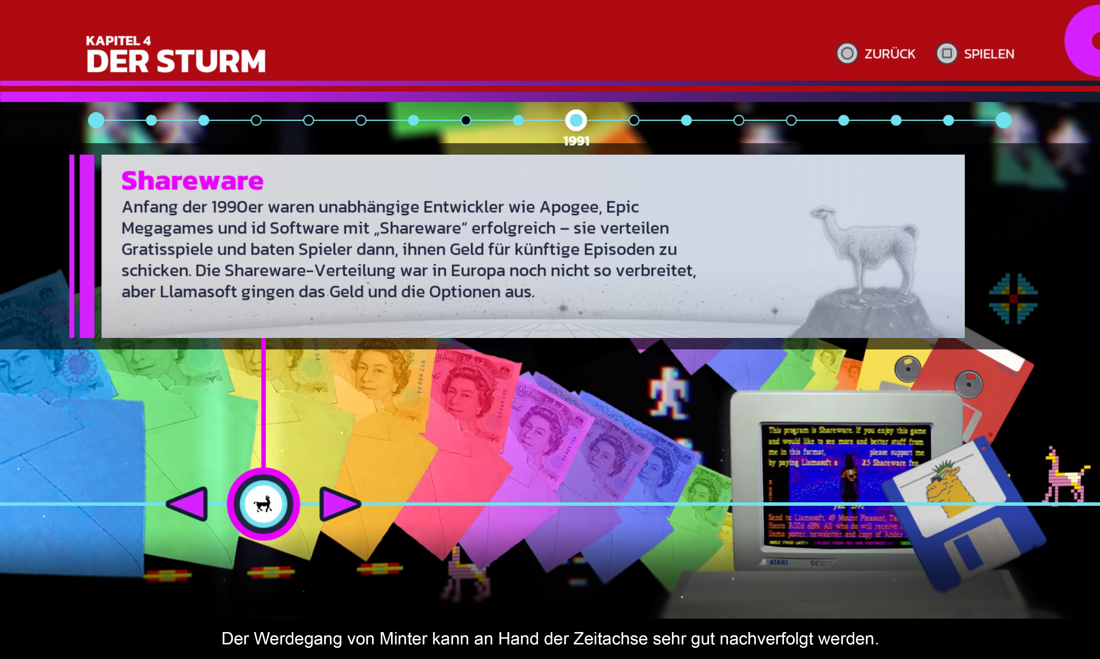 Die interaktive Dokumentation unterteilt sich in 4 Kapitel. Wobei den Anfängen der meiste Platz eingeräumt wird. An dieser Stelle will ich auch nicht zu weit vorgreifen, denn die Geschichte hinter Jeff Minter und Llamasoft in Text, Bild und Video zu erleben, macht nun mal einen Großteil des Reizes von „Llamasoft: The Jeff Minter Story“ aus. Der chronologische Ablauf wird zu dem mit vielen originalen Dokumenten, Aufzeichnungen und Notizen belegt. Auch kommen in verschiedenen Videos Kollegen, Weggefährten und andere Business-People zu Wort. Wobei ich mich schon gefragt habe, was ein „Video Game Presenter“ sein soll und warum ich deren jugendliche Schwärmerei ertragen musste. An dieser Stelle würde ich mir in Zukunft doch etwas mehr Sorgfalt von Digital Eclipse wünschen! Wobei eventuell nicht die Kalifornier die Schuld trifft, denn ein Großteil stammt aus der Dokumentation „Heart of Neon“.
