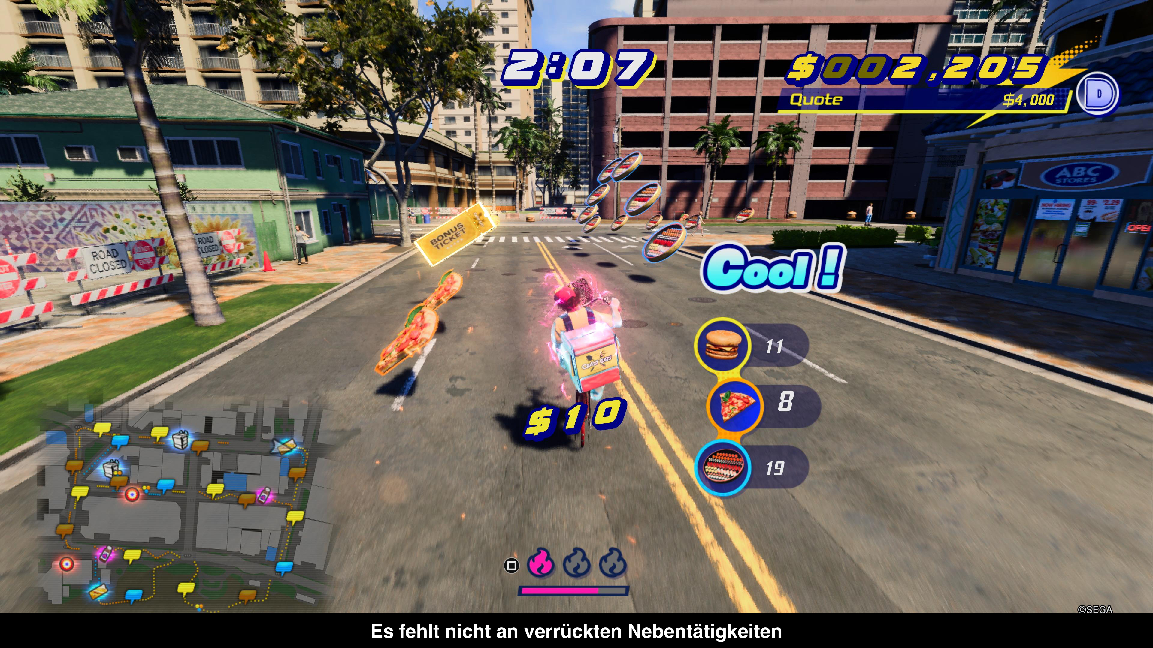 Mit Dondoko Island gibt es aber noch eine weitere Nebentätigkeit, die einen eigenen Absatz verdient. Denn hier ist es euer Ziel, ein Resort wieder aufzubauen, was von fiesen Kriminellen als Müllhalde genutzt wird. Also müsst ihr diese nicht nur mit euren Fäusten von der Insel vertreiben, sondern euch auch um das Wohl eurer Gäste kümmern, indem ihr Übernachtungsmöglichkeiten bietet, für Unterhaltung sorgt und die Gäste auch persönlich verwöhnt. Dabei kommt es auf eure DIY-Künste an, denn ihr sammelt tagsüber Ressourcen auf der Insel, um diese anschließend zu Möbeln oder kleineren Häusern zu verwerten, die ihr nach Belieben auf der Insel platzieren könnt. Alles in allem bietet dieser Modus alleine ca. 10 Stunden Spielzeit und kann anschließend weiterhin endlos gespielt werden.