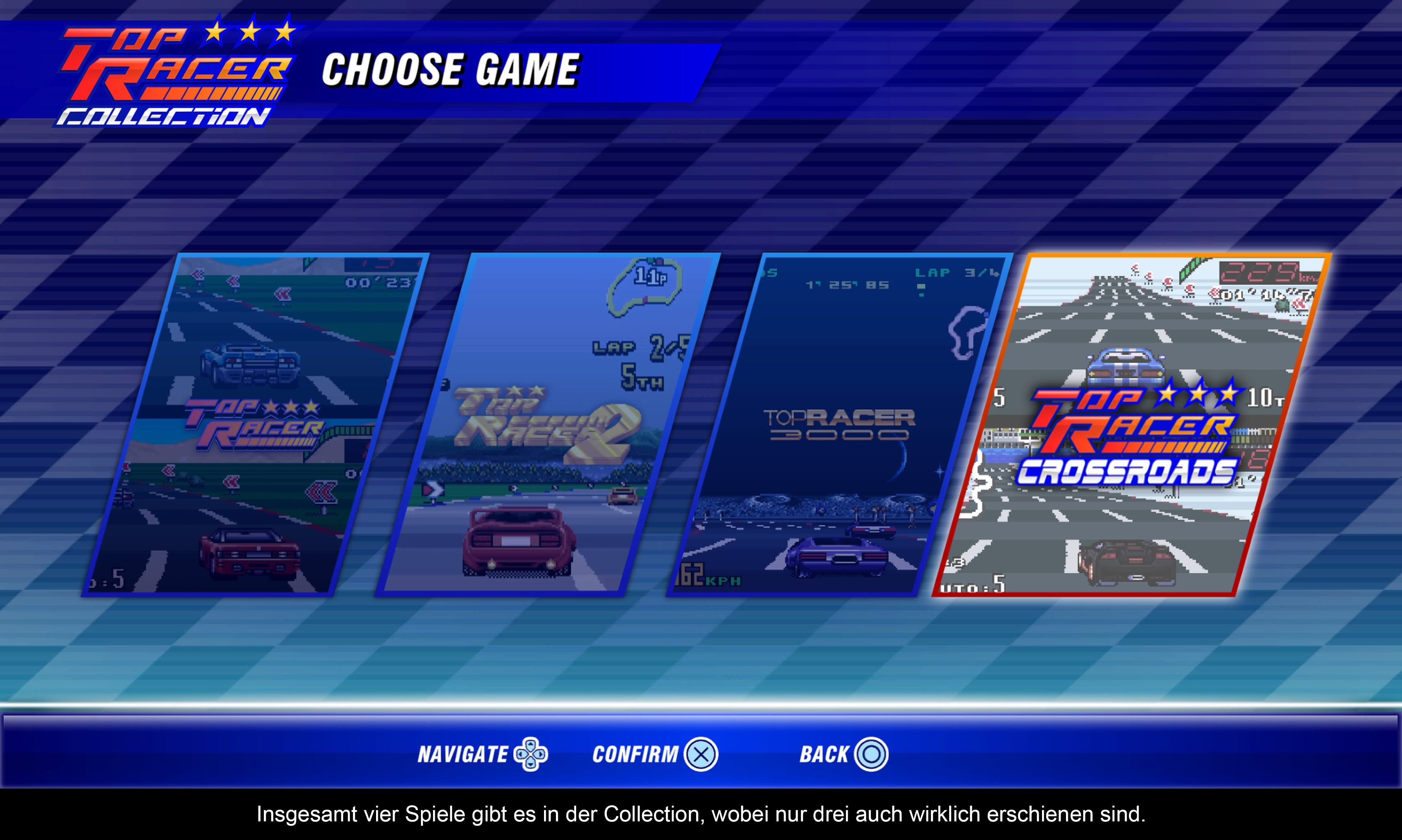 Beindrucken konnte mich die „Top Racer Collection“ nicht. Und damit meine ich nicht expliziert die vier Rennspiele, sondern eher, wie das alles umgesetzt und aufbereitet wurde. Prinzipiell hat man keine Chance, die Originale so zu spielen, wie sie damals über den TV flimmerten. Die moderne Menüstruktur hätte man in meinen Augen (zum Beispiel als Overlay) eleganter lösen können. Zudem existiert bis auf ein paar Bilder der japanischen Anleitungen / Verpackungen nichts zu den Ursprüngen der Serie oder gar den Entwicklern. Ebenfalls fehlen alle späteren Spiele. Dass es da nicht mal zu einer deutschen Übersetzung gereicht hat, stört lediglich am Rande. Diese Kollektion kann man getrost ignorieren.