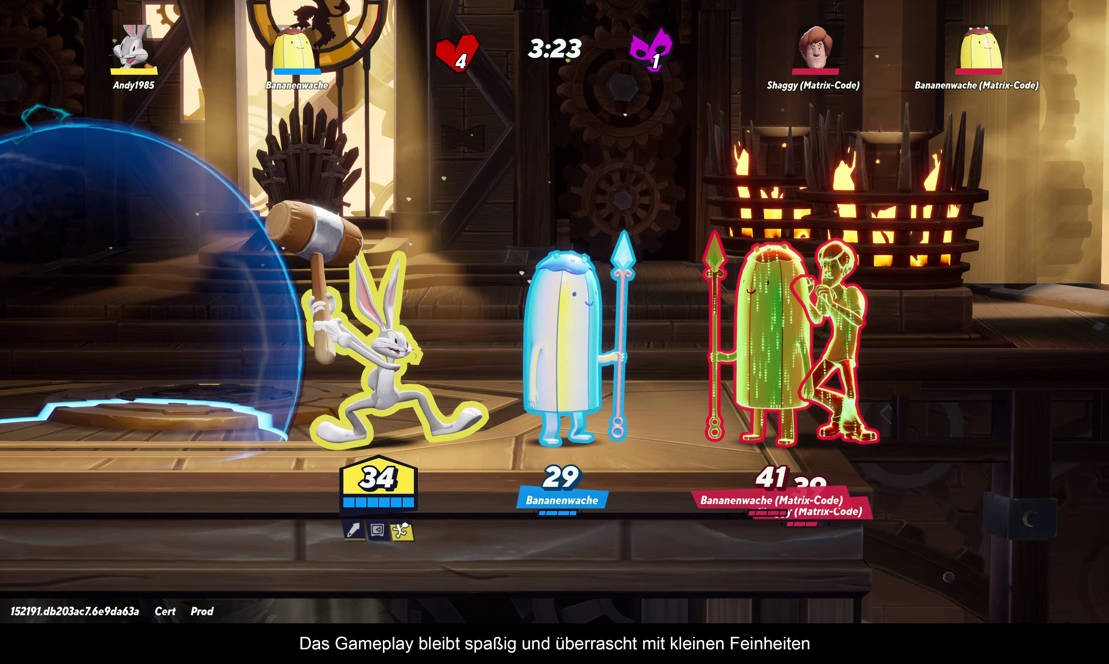 Noch immer ist vieles wie in der Beta, darum gehe ich hier nicht zu sehr auf Details ein. „MultiVersus“ bleibt ein Maskottchen Prügler mit der Lizenz von Warner Brothers, dass bedeutet das vor allem mit Looney Tunes und DC Charakteren zu rechnen ist. Überraschend war dagegen, dass Jason aus Freitag der 13 und Agent Smith aus Matrix in das Spiel Einzug finden. Die Bananenwache aus Adventure Time und der Joker sind ebenfalls neu, passen aber zu den bestehenden Charakteren. Besitzer des Seasonpass kommen sofort in den Genuss von Jason, alle anderen schauen durch die Finger. Die Bananen Wache muss man mit täglichen Aufgaben Freischalten und der Joker und Agent Smith bleiben hinter einer Paywall. Es gibt zwar Mittel und Wege, um diese im Spiel freizuschalten. Aber das wurde bewusst sehr aufwendig gestaltet. Aber bevor wir die Büchse der Micro Transaktionen öffne zu den erfreulicheren Dingen! Es gibt endlich einen Einzelspieler Modus! In diesen sogenannten Rifts gilt es Gegner zu besiegen und kleinere Minispiele zu meistern. Bei den Minispielen müsst ihr einmal mit einem Panzer einen Kristall beschützen, ein anderes Mal Beute aus einem Ballon oder Figur prügeln. Dazwischen gibt es klassische 1vs1 oder 2vs2 Kämpfe mit unterschiedlichen Modifikationen. Eigentlich alles was sich ein Spieler wünscht, nur ist das hier ein Wunsch mit der guten alten Affenpfote. Denn der Fortschritt in diesem System ist mit Gems verbunden. Diese gewähren positive Effekte und machen die Matches leichter. Auch braucht man ein gewisses Gems-Level um sich den höheren Schwierigkeitsgraden zu stellen. Diese Gems lassen sich nur zäh erspielen und um die Ecke lacht schon der Ingame Shop, welcher Kostengünstig diese anpreist! Auch braucht man bei bestimmten Aufgaben gewisse Figuren mit einzigartigen Kostümen. Auch hier schielt der Ingame Store schon wieder um die Ecke. Wäre auch alles verkraftbar, könnte man nicht mit besiegen der Endbosse Agent Smith freischalten. Ein sehr unglückliches Dilemma, welches einen fast schon zum täglichen Grind zwingt. Aber warum sollte man sich das eigentlich antun?