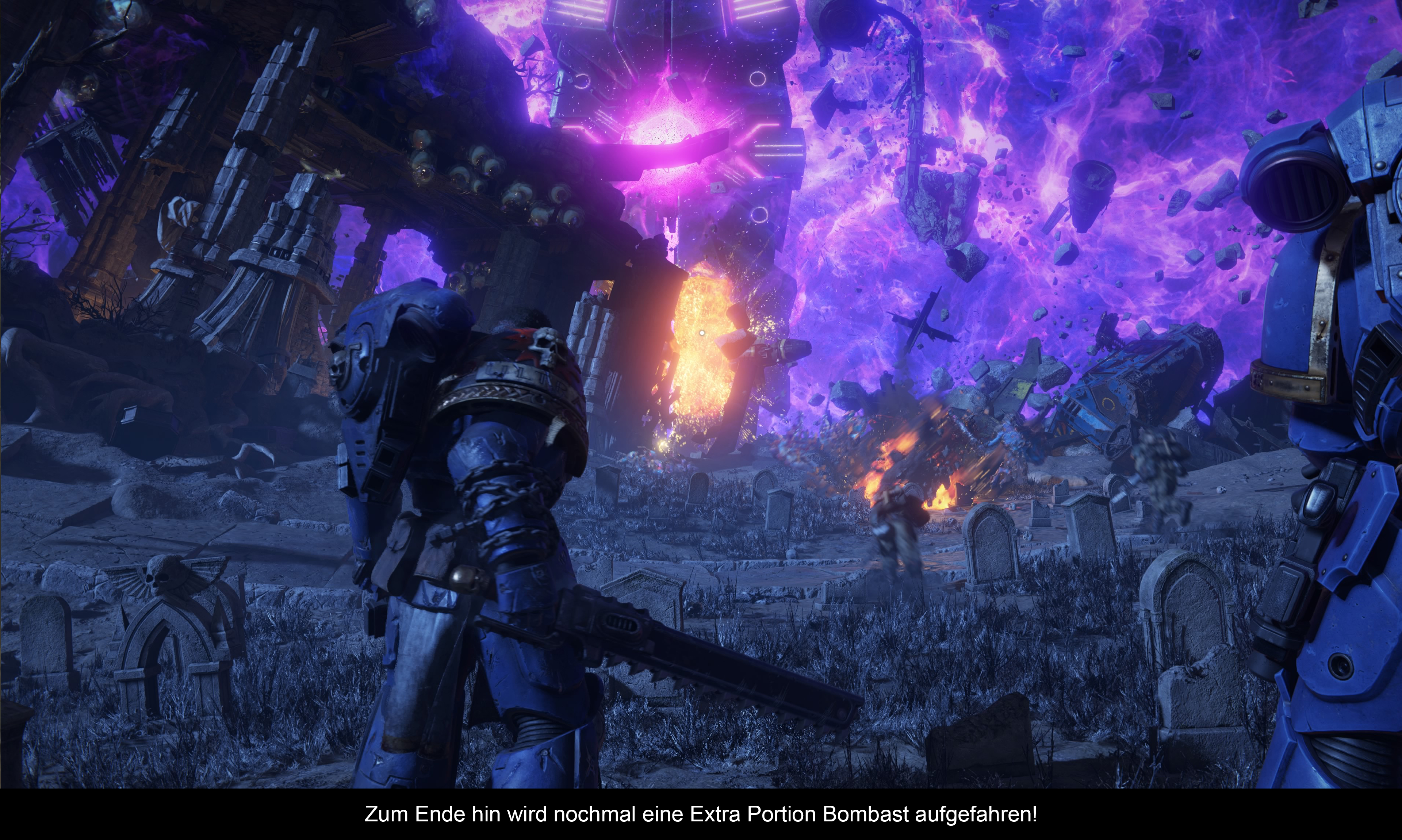Noch ein paar Worte zur Akustik: Die deutsche Sprachausgabe fällt insgesamt okay aus. Es gibt gute Sprecher und einige weniger Souveräne. Die deutsche Stimme von Titus gehört eher zur zweiten Kategorie. Vielleicht liegt es aber auch an den Dialogen, die nicht über Fan Fic Niveau herauskommen. Die riesigen Krieger verfügen zwar von Haus aus über wenig Charisma, aber etwas weniger sperrige Gespräche und etwas mehr Kampfgeist hätten zumindest dem Helden-Trio gutgetan. Musikalisch kann man dagegen kaum etwas aussetzen. Die sakralen Klänge unterstützen das Erlebnis genauso gekonnt, wie die wuchtigen Bolter-Geräusche und das Surren des Kettenschwertes.