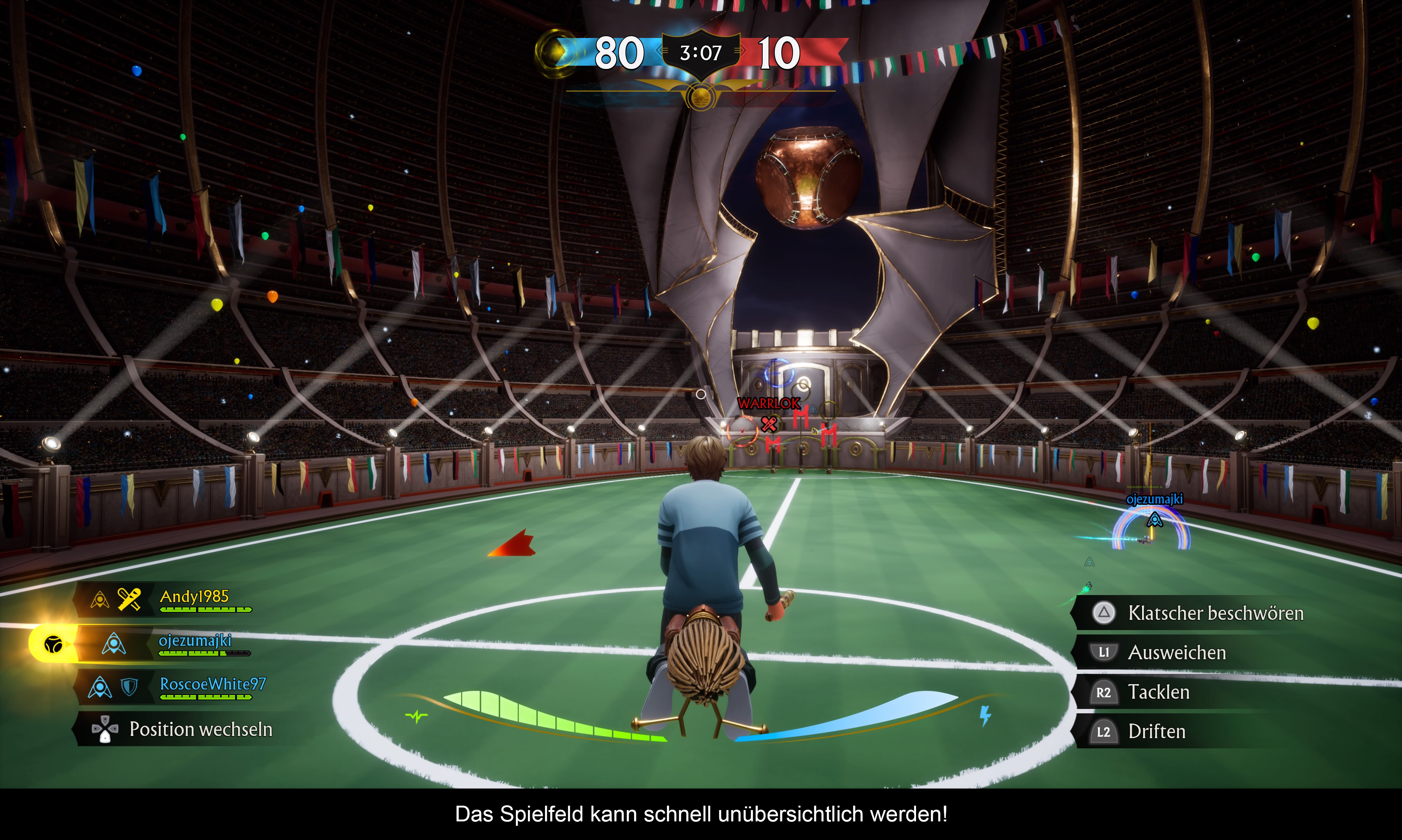 Abgesehen vom Torhüter, steuern sich alle Spieler wie man es von modernen Flugspielen erwartet. Die Steuerung ist nicht überladen und beschränkt sich wirklich nur auf die wichtigsten Funktionen. Man ist auf dem Besen sehr agil unterwegs und hat allerhand Möglichkeiten, ihn zu kontrollieren. Schnell gelernt, aber hart zu meistern – das ist hier die Devise! Zudem gibt es noch eine Lebensleiste für Rempler und Klatscher-Treffer, so wie eine Beschleunigungsleiste. Dadurch bleibt Zeit, taktisch vorzugehen und sich auf dem doch sehr unübersichtlichen Spielfeld zu orientieren. Zwar versucht das Spiel, mit Richtungspfeilen die Gegner / Mitspieler / Bälle zu kennzeichnen, aber dies gelingt nur zum Teil. Die Position des Quaffels geht zum Beispiel oft unter und das macht es für Neueinsteiger schwer. Glücklicherweise kann man im Einzelspieler-Modus frei die Position wechseln und die KI übernimmt die anderen Spieler. So tastet man sich langsam an die verschiedenen Spielweisen heran. Beim Online-Wettkampf sieht es jedoch ganz anders aus!