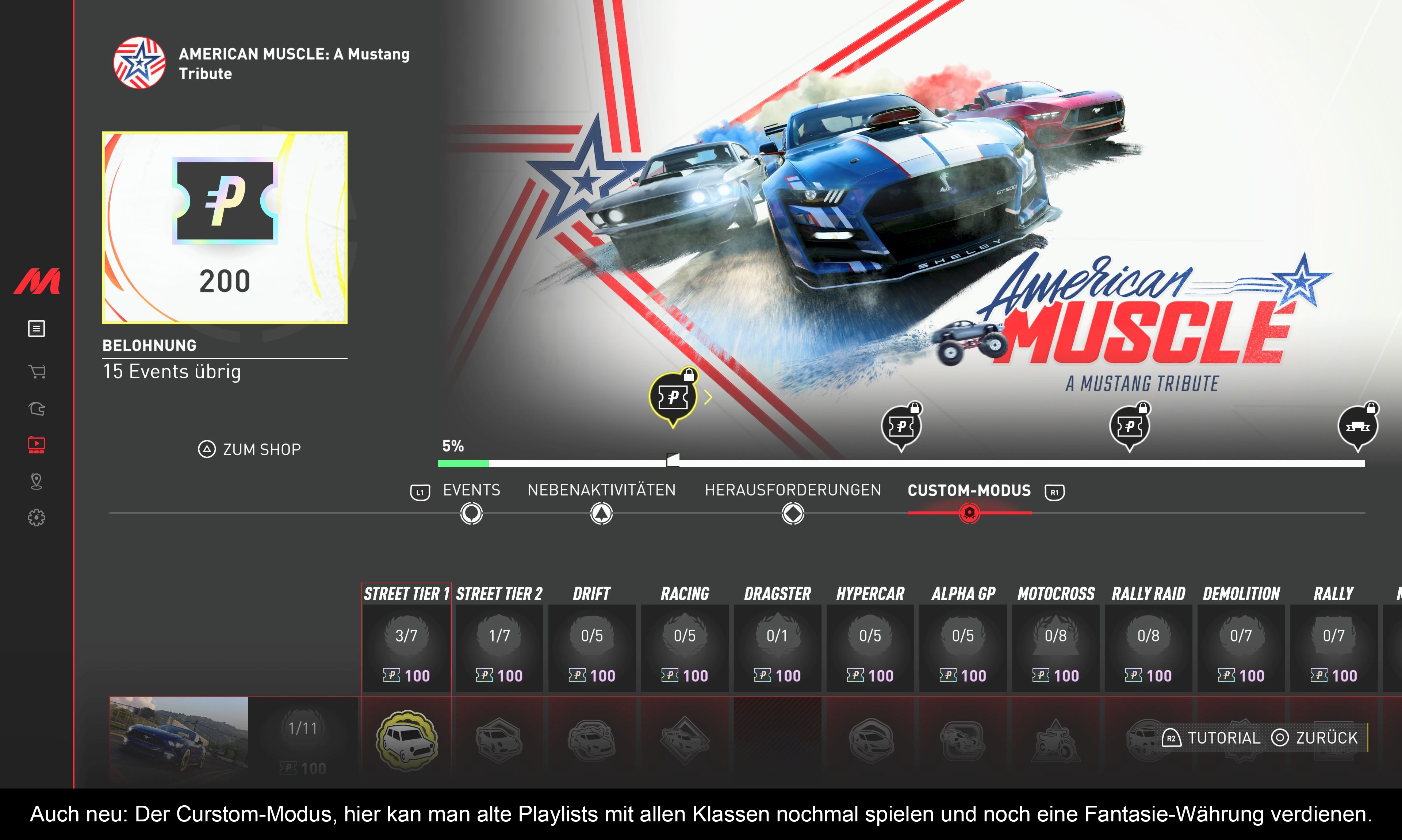 Seit dem Launch von Motorfest sind einige neue Playlisten dazu gekommen. Die Anzahl von 15 ist auf aktuell 21 (ohne Chase Squad) gewachsen. Dabei wird zusätzliche Abwechslung geboten: Eine Playlist widmet sich dem Gymkhana, eine weitere Hollywood Filmen, dann gibt es noch was über Lowrider & Donks und aktuell hat Made in Japan eine Fortsetzung erfahren. Die Playlisten bieten verschiedene neue Rennen und belohnen den Spieler auch hier mit Fahrzeugen und kosmetischen Sachen. Passend dazu gibt es immer ein Set zusätzlicher Herausforderungen sowie Foto-Aufgaben. Nebenbei wurden auch neue Fahrzeuge eingeführt, die übrigens nicht im Year 1 Pass enthalten waren. Gegen Echtgeld lassen sich auch noch speziell getunte Autos erwerben, wobei die Verbesserungen rein kosmetischer Natur sind (z.B. spektakulär aussehende Reifen und Nitroflammen).